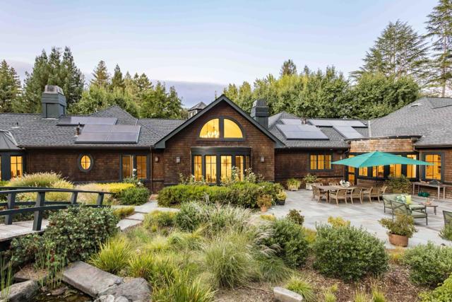 Set on more than 2.5 acres of quintessential Woodside grounds, this spectacular estate balances timeless elegance with easy comfort. Behind gates and surrounded by mature trees and lush foliage, it conveys a quiet sense of luxurious seclusion. Inside, more than 6,400 total SF includes a dramatic foyer with columns, expansive formal rooms, a chef's kitchen, private office, theater, and five bedrooms, including a sanctuary-like primary suite. Outdoors, resort-style grounds feature a pool, spa, pool house, patio with fireplace and grill, cascading waterfall with bridge, gardens, fruit trees, and a detached bonus studio for work or fitness. Tesla solar panels and 6 Powerwall batteries, a seamless Sonos sound system, and expert craftsmanship enhance every detail. Just minutes from Woodside, Sand Hill Road, Palo Alto, and top schools, it offers the rare blend of privacy, prestige, and proximity.