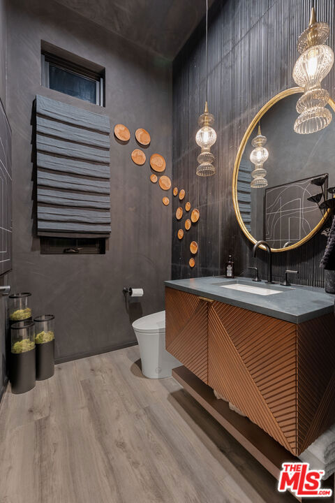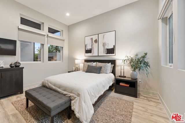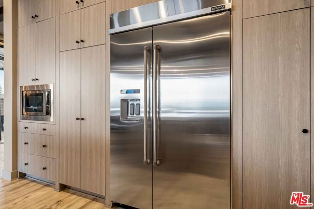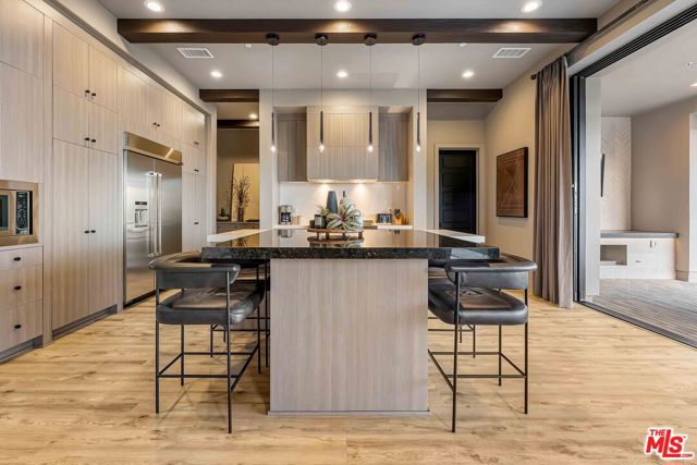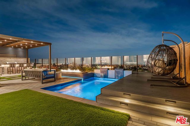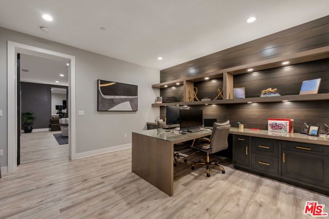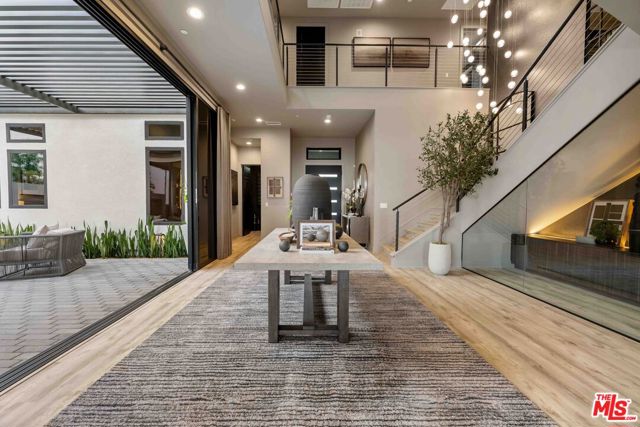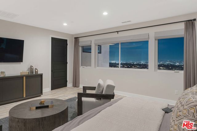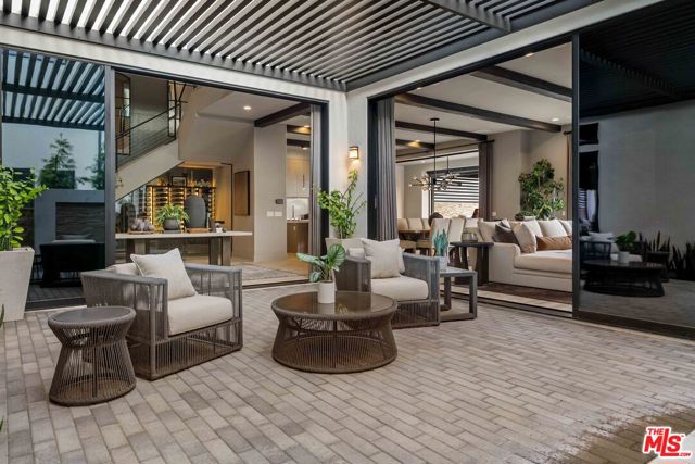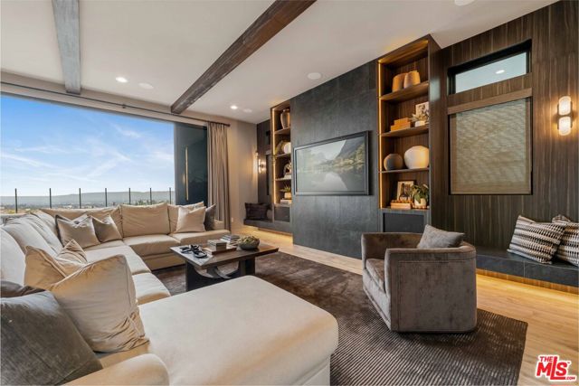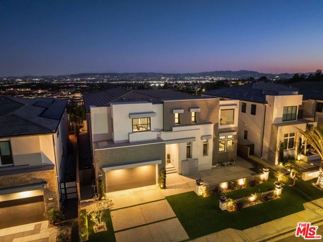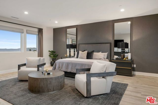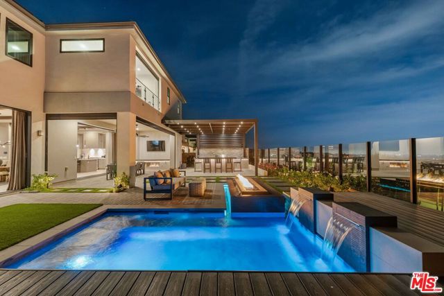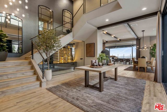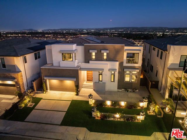 This design-forward sanctuary is located in the exclusive, guard-gated Westcliffe community, is ideally positioned in a cul-de-sac with panoramic VIEWS, and features over $750,000 in recent interior and exterior upgrades completed in 2025. This home is a perfect match of Southern California living and cutting-edge smart home technology, and is an impeccably redesigned luxury residence with every detail beautifully conceived by JL Interiors, an award-winning Santa Monica design firm featured on HGTV and Bravo's Best Room Wins. With generous accommodations, this home features 5 bedrooms and 6 baths, including a stunning powder room featuring hand-plastered walls and honed 3D marble stone, offset by a warm chestnut floating vanity with diagonal wood slatting and vintage-inspired designer fixtures. Upon walking in, you'll take in the eye-catching wine cellar with a custom glass enclosed display with distinctive iron wine racking and built-in cabinets for an unforgettable first impression. Custom wall treatments from Jonathan Mark Designs line the staircase, flanked by oversized mirrors that draw the eye upward to soaring 22' ceilings, all anchored by a contemporary cascading chandelier. Off the entry and surrounded by glass sliding pocket doors sits a courtyard centered around a modern water fountain. As you walk towards the kitchen and dining area, teardrop pendants with smoked mirrored glass hang above the kitchen island. Kitchen highlights include a JennAir built-in refrigerator, 6-burner cooktop with griddle, double-oven, hidden commercial range hood, multi-function dishwasher, microwave, trash compactor and massive walk-in pantry. A custom smoked glass chandelier is a modern, stand-out piece in the dining area. Coffee-finish beams run throughout the kitchen, dining, and living spaces, tying the Aspen-Chic aesthetic together. Full expansion pocketed sliding glass doors blur the line between indoors and out. This home is optimized for effortless and stylish entertainment. The living room features custom cabinets by Quality Cabinets & Millwork with black-grey teak finish, clover-pattern perforated metal AV enclosures, and integrated LED lighting. Urban bronze and alabaster sconces and woven wood roller shades tie in the space together for a warm, inviting feel that extends throughout the home. The unique, custom-designed Primary Suite offers sensational VIEWS across the Valley and features a spa-inspired bathroom showcasing a soaking tub, walk-in shower, and a spacious walk-in closet. The adjacent retreat has been transformed into a bespoke designed home office with built-ins, making this suite equally functional and luxurious. Sliding glass doors lead to a covered deck with tile flooring and VIEWS. Each of the four secondary bedrooms is en-suite with individual climate control, offering a personalized sense of comfort - One bedroom opens to its own private patio. This backyard delivers California living at every touchpoint: Spanish matte porcelain and ceramic tile finishes, an artisanal exterior bar, concrete countertops, and a California room with ceiling fans, fireplace, and motorized retractable screens, all framed by sweeping views. A cocktail pool and water-cascading fire pit create a resort-caliber atmosphere, perfectly positioned to take in breathtaking city light VIEWS. The BBQ center is impressive, complete with an ice maker, full outdoor cooking area, sink, refrigeration, and a custom pergola with adjustable louvers. Rounding out this exceptional offering, the home features a whole-house water softening system, solar, Leviton automated light switches, and a finished 3-car garage with epoxy flooring and built-in cabinetry. White-glove ready and and designer-appointed throughout, it sits within walking distance of the acclaimed Vineyards at Porter Ranch for premier dining and shopping, with the new community park just moments away. A truly rare opportunity to own a home where every detail has been considered.