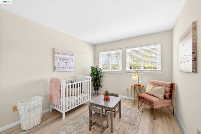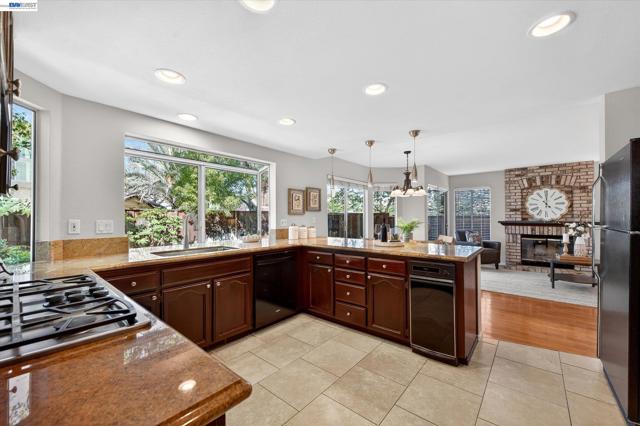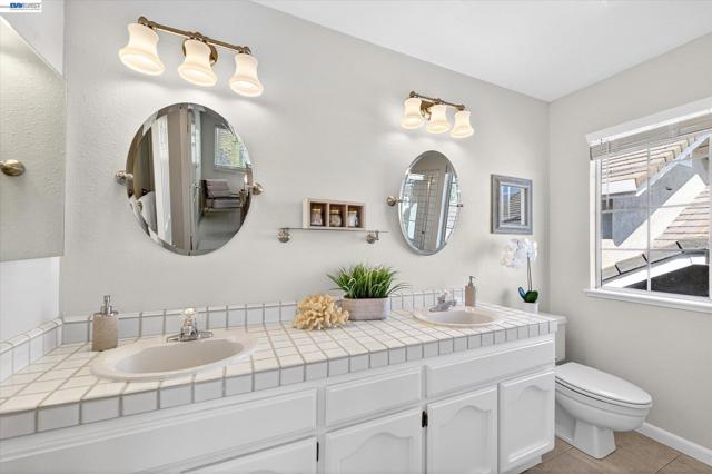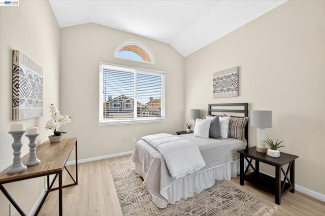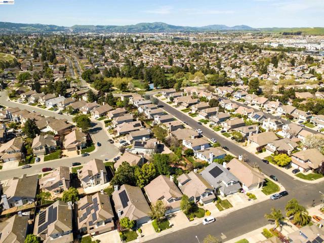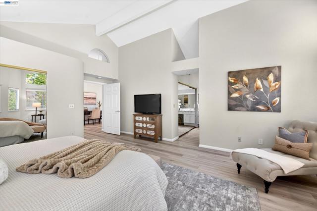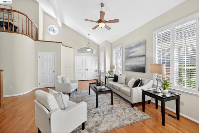 Beautiful east-facing home located in the desirable Fairlands community, just a few blocks from highly rated Fairlands Elementary School, Meadows Park, and Fairlands Park. This spacious residence features soaring 12-foot ceilings, rich hardwood floors, plantation shutters, and fresh interior paint throughout. The functional floor plan includes a full bedroom and bathroom on the main level, ideal for guests or multi-generational living. Formal living and dining rooms provide elegant entertaining space, while the granite kitchen offers a breakfast bar, gas range, built-in oven and microwave, refrigerator, and recessed lighting opening to a family room with gas fireplace. Upstairs is Luxury laminate flooring, primary suite that features a vaulted ceiling and walk-in mirrored closets. The primary bathroom includes a large Roman tub, stall shower, and generous dual vanity. Two additional bedrooms are spacious with high ceilings and abundant natural light, served by a tile hall bath with dual vanity and shower over tub. The private backyard with patio and hot tub creates a tranquil setting for relaxing or entertaining. A three-car garage with storage provides ample room for parking and hobbies. This is a wonderful opportunity in one of Pleasanton’s finest communities. Don't miss it!