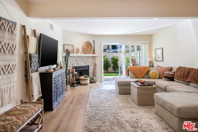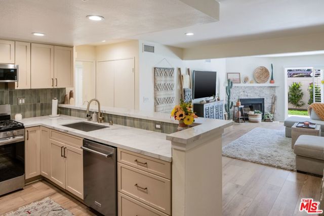 Experience the epitome of modern, turnkey living in the highly coveted Amberwood community. This stunning bottom-floor residence has been meticulously upgraded, offering a seamless blend of sophisticated style and comfort. The chef-inspired kitchen features sleek quartz countertops, custom cabinetry, and elegant pendant lighting. A spacious living room, anchored by a contemporary stone fireplace and plantation shutters, flows through new dual-pane sliders to a private, professionally landscaped backyard. Relax in your fully enclosed sanctuary featuring vinyl fencing and serene mountain views. The primary suite boasts a remodeled bathroom with a double-sink quartz vanity and a premium tub/shower. Exceptional upgrades throughout include new Lifeproof LVP flooring, designer recessed lighting, upgraded baseboards, and a high-end front swinging screen door. Key systems offer peace of mind with a newer HVAC (approx. 6 years old). Residents benefit from a private 1-car garage, an additional assigned space, proximity to guest parking, and access to two sparkling community pools and spas. Ideally located near Amgen, premier shopping, dining, and easy 101 freeway access, all while enjoying a quiet atmosphere with zero noise pollution.