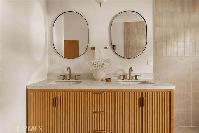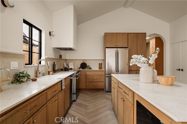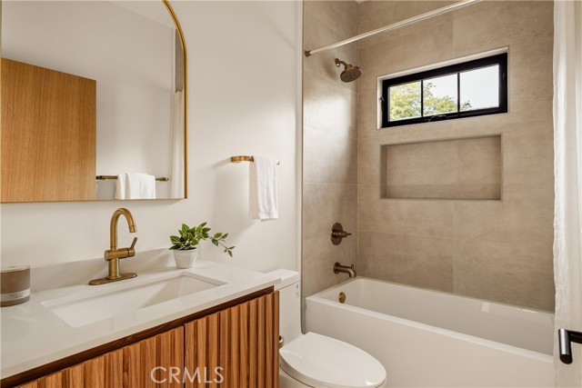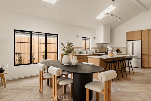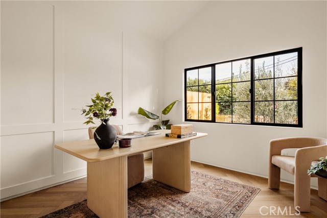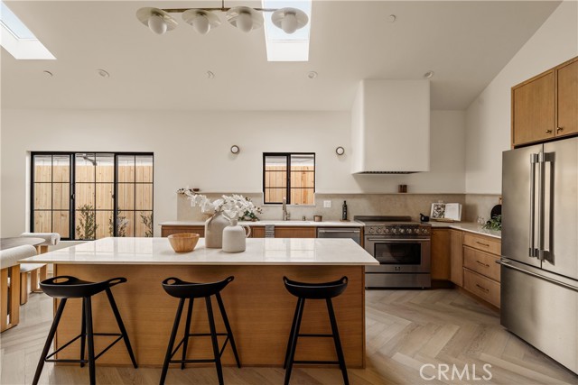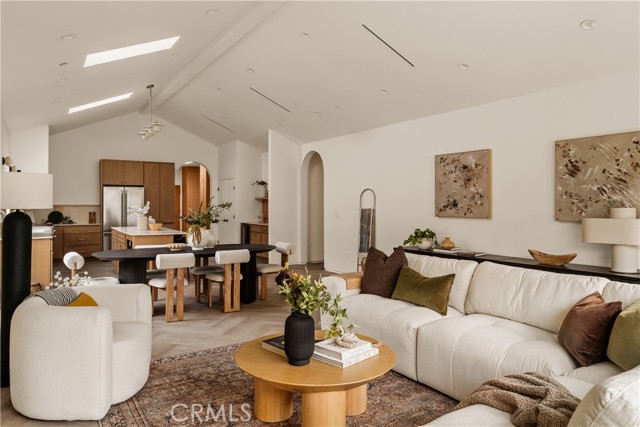 This brand-new construction stunner in a coveted pocket of Van Nuys bordering the prestigious Midvale Estates offers a quintessential blend of contemporary, understated luxury with indoor and outdoor California living at its core. Step inside and exquisite details in the formal entry signal immediately that you've arrived at someplace special — herringbone flooring, natural wood accents, built-in storage and seating, all illuminated by soft natural light from the sky above that creates the warmest of welcomes. A grand archway pulls you into the heart of the home: an expansive living space with soaring vaulted ceilings and a case study in open floor plan design. Bi-fold patio doors in the living room tuck away from sight, revealing a fully landscaped oasis and an entertainer's dream where al fresco dining, lounging and play beckon. The chef's kitchen is optimized for cooking, hosting and entertaining, outfitted with professional-grade appliances, natural oak cabinets, marble countertops, a large kitchen island and wet bar. Retreat to the primary bedroom, a quiet sanctuary featuring a spa-style ensuite bathroom with a full-size soaking tub, large walk-in closet and pocket doors that open directly to the backyard amenities. Two more generously sized bedrooms and a versatile den/office that can also double as a 4th bedroom, round out the main 4 bed / 2.5 baths / 1,931 sf residence. At the rear of the property sits a 2 bed / 2 bath / 749 sf ADU with its own address, private entrance and separate electrical meter, smartly designed for additional living/flex space or to be easily fenced off for privacy and rental income. Energy-efficient new construction with all-new systems and paid-off solar panels mean lower operating costs and peace of mind for years to come. With its prime location, meticulous style and craftsmanship, and sophisticated details seldom found at this price point — white oak doors, trimless doors and baseboards, and LED accent lighting — this spectacular home sets a new standard for elevated California living.