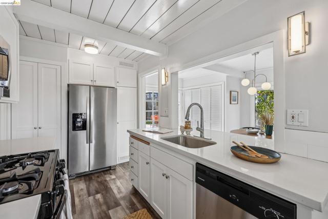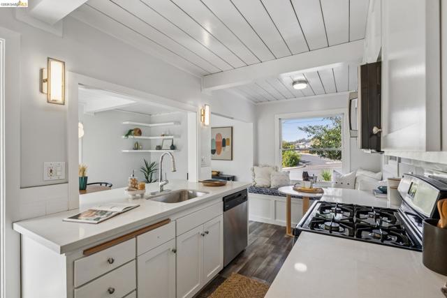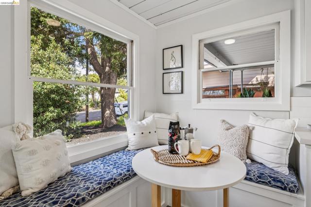 Located on a sunny East Richmond Heights parcel on the El Cerrito border, this charming, spacious, single level 2/1 mid-century offers an inviting layout, beautiful natural light, and a generous yard perfect for entertaining + everyday living. Level-in entry welcomes you into a bright + airy living room featuring a gas fireplace and a striking floor-to-ceiling window to the front deck, bringing in abundant natural light and creating a warm, inviting atmosphere. The spacious kitchen has updated appliances + flows seamlessly into the dining area, where French doors open directly to the level backyard, creating a perfect indoor-outdoor connection for dining al fresco, gardening, or relaxing. Both BRs are well proportioned and look out onto the lush gardens, just off the shared bathroom. A long driveway provides convenient parking as you pull up to the sunny, landscaped front yard with mature plants, flowers, and trees that add to the home’s curb appeal and privacy. Serene, private and quiet, this home combines comfort with easy living. Zoned for El Cerrito High School, it is conveniently located down the block from Mira Vista Elementary School, with a short drive to BART, El Cerrito and Kensington shopping, and the trails in Wildcat Canyon Regional Park.