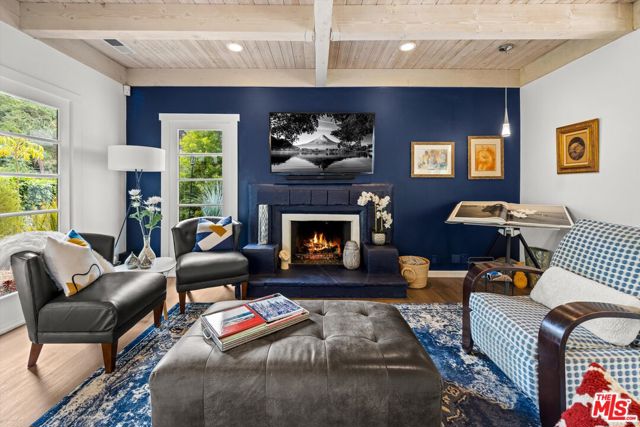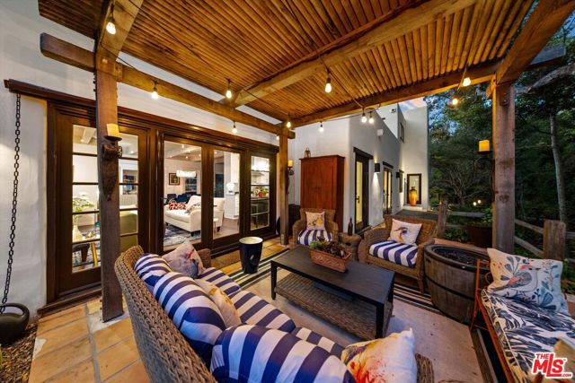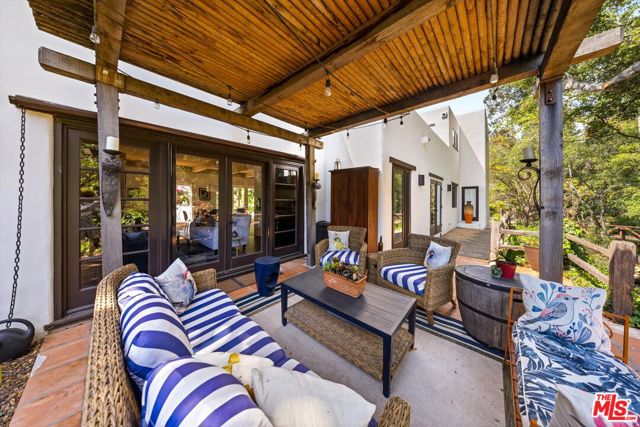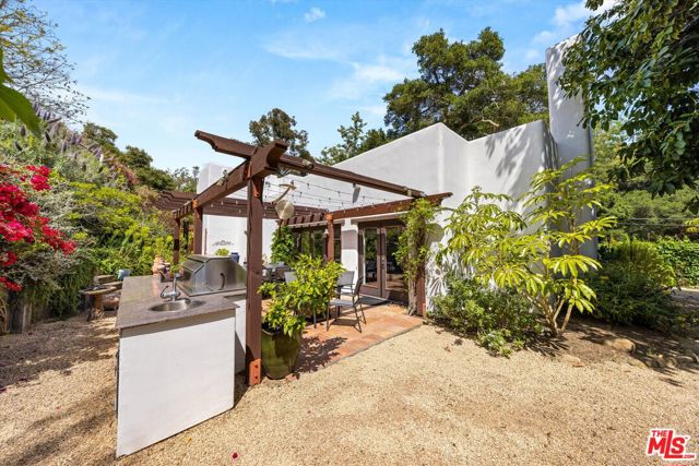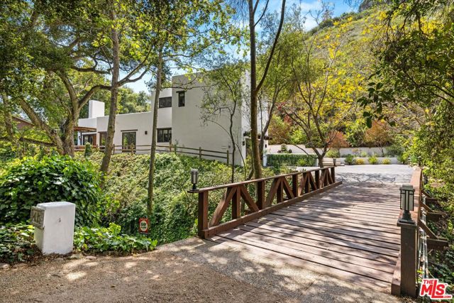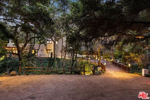 Set on a lush one-acre parcel, a private bridge welcomes you to this enchanting Santa Fe-style retreat nestled in Santa Barbara's verdant Sycamore Canyon. The 3-bedroom, 2.5-bath residence of +/-2,345 square feet is surrounded by mature landscaping and romantic greenery, with a babbling creek enhancing the peaceful setting. Thoughtfully designed for seamless indoor-outdoor living, the property offers multiple inviting patios and gathering spaces ideal for entertaining, relaxing, or simply enjoying the meditative beauty of the canyon. Ample off-street parking adds convenience to this serene retreat. Every corner of the home offers unique touches that make it one-of-a-kind; from custom built-ins with a charming library ladder in the kitchen to a rustic wood fireplace mantle repurposed as a stunning bathroom countertop. The grounds are dotted with fruit trees, attracting a variety of birds and creating a haven for nature lovers. Whether you're dining under the stars, curling up with a book by the fireplace, or hosting lively gatherings with friends and family, this soulful home offers a rare opportunity to live surrounded by beauty, privacy, and inspiration, just minutes from beaches, Montecito's Lower Village, and everything that downtown Santa Barbara has to offer.