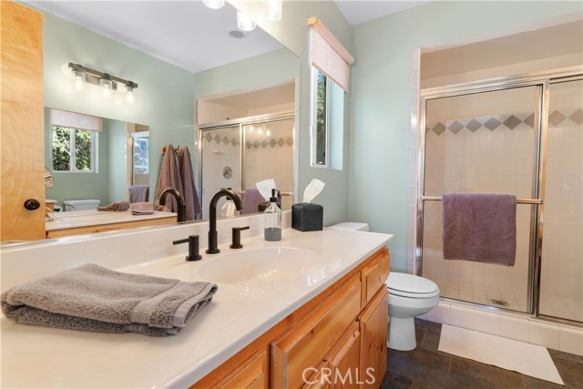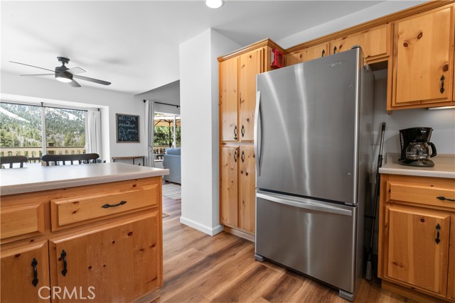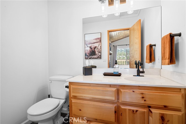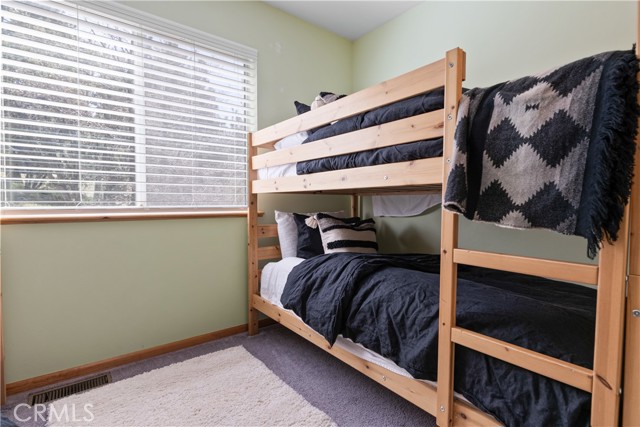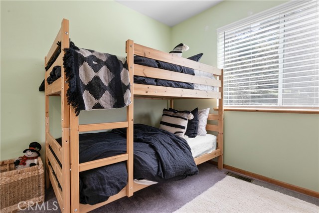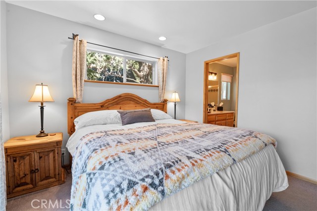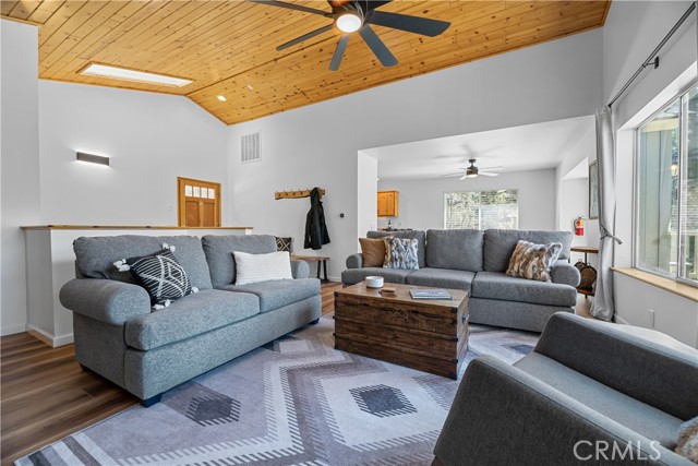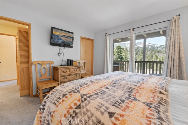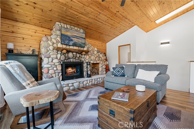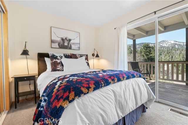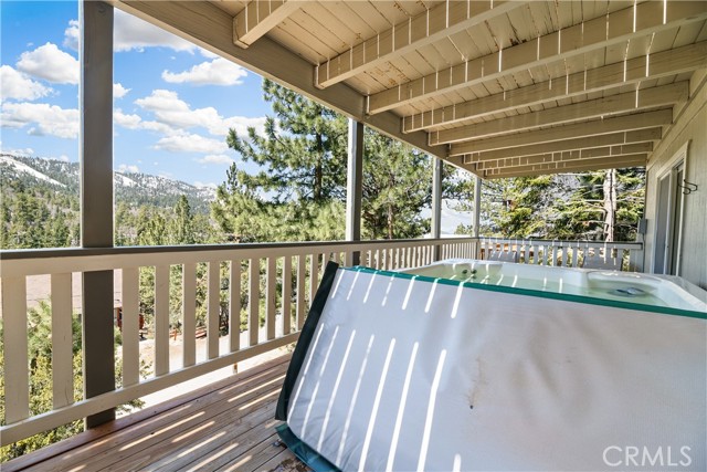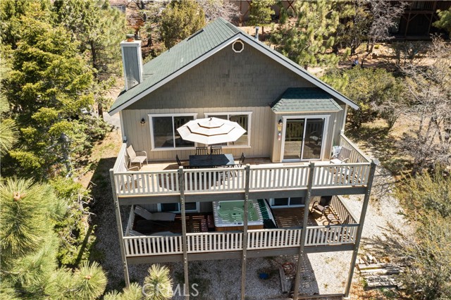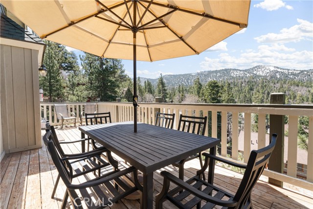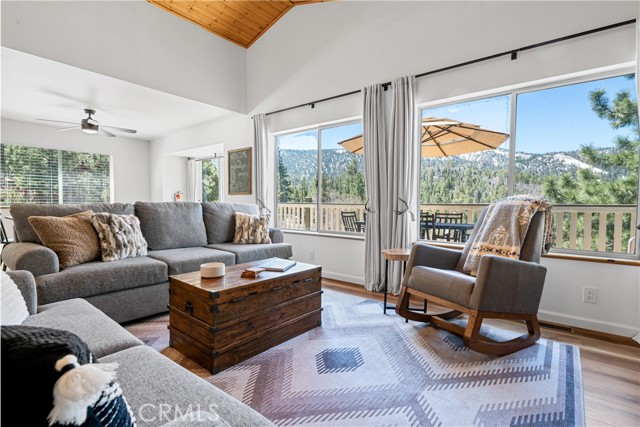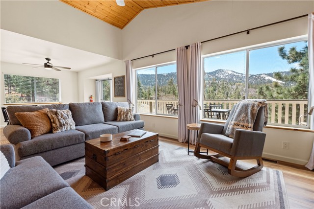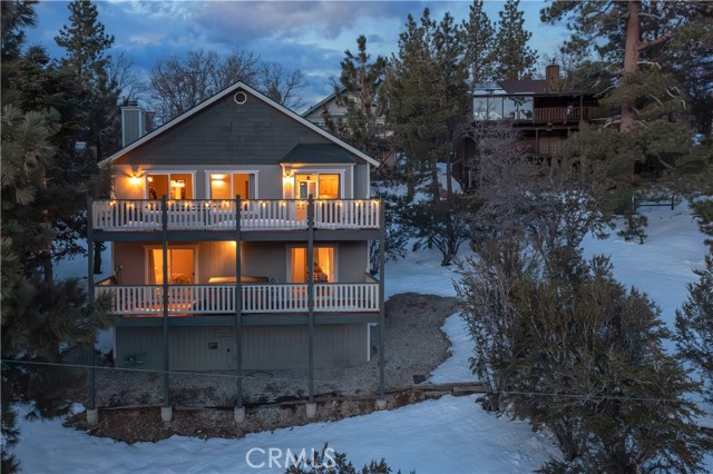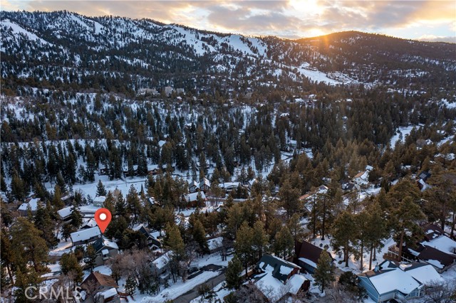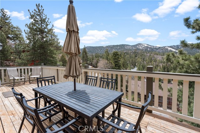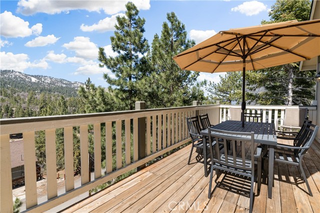 Stunning unobstructed mountain views! This home is in an amazing location nestled into the hillside in a quiet Moonridge neighborhood. With close proximity to the National Forest Trailhead and the secluded nature of this home you will have an amazing mountain experience every time you are at the home. Approximately 1.5 miles to Bear Mountain, Alpine Zoo, and Bear Mountain Golf Course. 3.5 miles to Snow Summit. The open floor plan features a spacious kitchen, vaulted ceilings, and lots of natural light. Amazing views from a majority of windows throughout the property. Sits on a large lot with lots of privacy. Enjoy the two large decks (and spa) for outdoor entertaining and panoramic mountain views. Take in the skiers on the slope, and lake view! This reverse floor plan has a beautiful rock fireplace, stainless steel appliances, and new fixtures throughout. The upstairs is freshly painted with new vinyl plank flooring. The bottom floor offers three bedrooms, two full bathrooms, laundry with your open living upstairs! Direct access to property from Canyon Crest. Driveway has recently been lengthened and has room for about 5 vehicles. Tons of storage under the deck/house.
