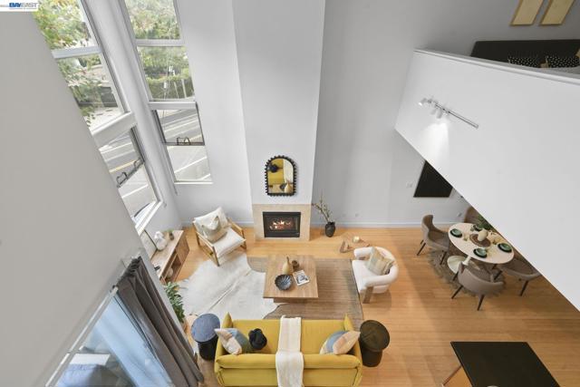 Why rent when you can have a place to call your own? Perched above street level in the centrally-located Key Route Lofts building, this second-floor loft condo offers scale, light, and livability. The vibe is more art gallery than apartment thanks to soaring vaulted ceilings, a wall of windows providing natural light, a gas fireplace, and an open floor plan that adapts to your lifestyle. The main level has bamboo flooring and the loft bedroom upstairs has new carpet. The 1-car garage parking, in-unit laundry, and sizable private balcony make this home a must-see. The kitchen offers newer stainless steel appliances and a sizable breakfast bar. The first floor offers flex space for a home office, your yoga mat or Peloton, or a reading nook. A spiral staircase connects both levels—upstairs, the bedroom loft includes a catwalk mezzanine perfect for storage or showcasing plants, art, or your next fashion show. An ensuite bath with shower over tub completes this level. This is that rare find: serene and tranquil inside, while dining, shopping, and transit options sit just outside your door. Bay Street, Target, Home Depot, MacArthur BART, I-580, 880, Highway 24, the Bay, and Aquatic Park are all minutes away.