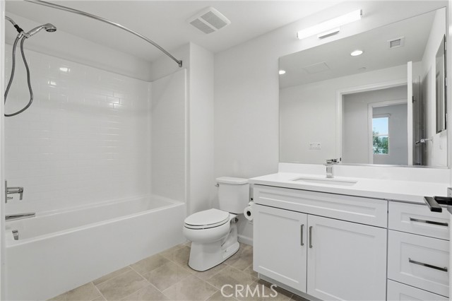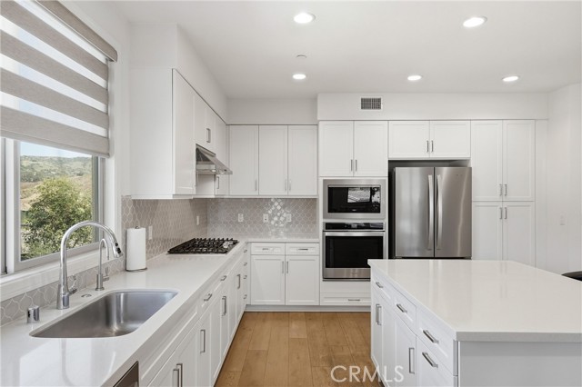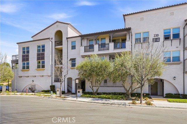 Tucked away in a cul-de-sac, this beautiful stacked single-level condo in the gated 55+ Buena Vida is a rare find! A direct access to the lobby from its own garage with an individual storage room makes this unit one of a kind in the Agave community! Situating on the top level of the complex, it offers a fabulous view of the hills, green belts, and the neighborhood. Designed to promote today's Lock-n-Leave lifestyle, this condo showcases a modern urban living experience in a luxurious resort setting. Only shared with 3 units, the lobby and elevator are semi-private. Inside, an open and light filled living room and kitchen cleverly divide the condo into two wings. One wing is occupied by the primary suite, featuring an oversized walk-in closet and an ensuite bath. The other wing has the 2nd bedroom, an office, and the hallway bath. A chef kitchen boasts white Shaker style cabinetry, white sand quartz countertops, 6th Avenue Julia mosaic full backsplash, and an island with bar seating. Tri-West Versaille French Oak flooring except in the bathrooms and laundry room. Staggered 12"x24" tile in the baths. Motorized Roller and Zebra Shade controlled by remotes. Water filtration system. Relax in your private deck while enjoying the surrounding views! Maytag front load washer & Dryer and a French Door style refrigerator are included. Trash Shoot System. HOA amenities includes a pool with beach entry, a spa with water feature, a state of art gym with a locker room, a lounge, a multi purpose room, a catering kitchen, a ballroom, BBQ area, fireplace lounge area, and an event lawn. Residents of Buena Vida have so much to do: holiday parties, exercise classes, arts and crafts, etc. Located in the heart of Brea, close to daily conveniences, shopping, dining, freeway and attractions. Welcome to Buena Vida at La Floresta--a 55+ active adult living community in Brea!