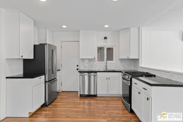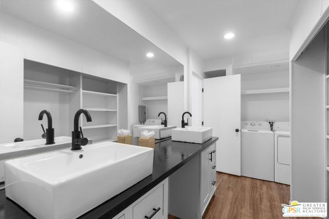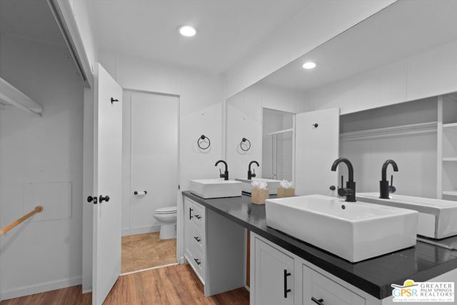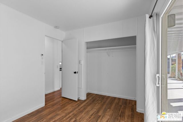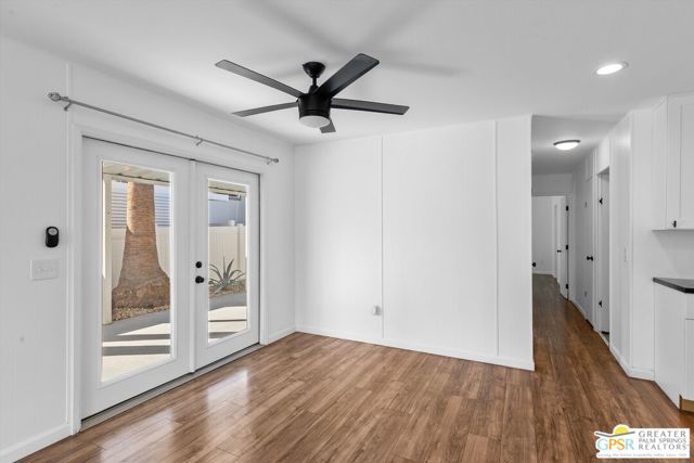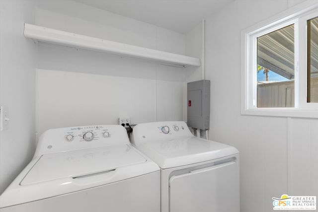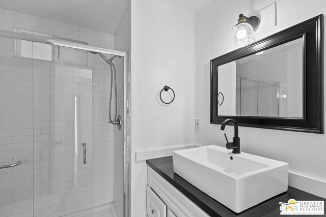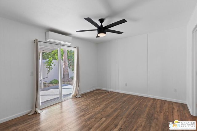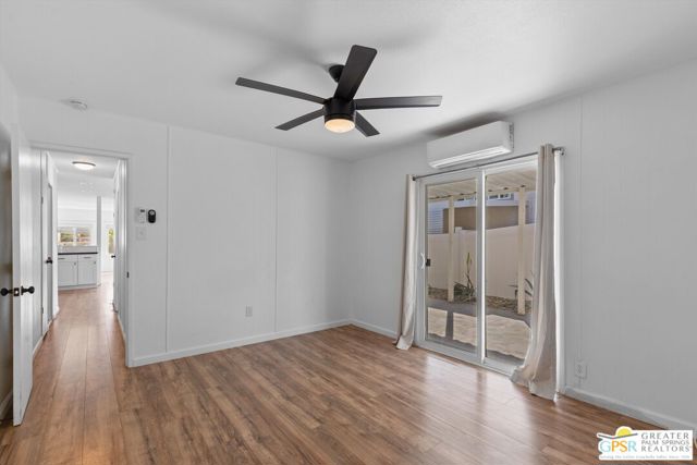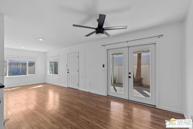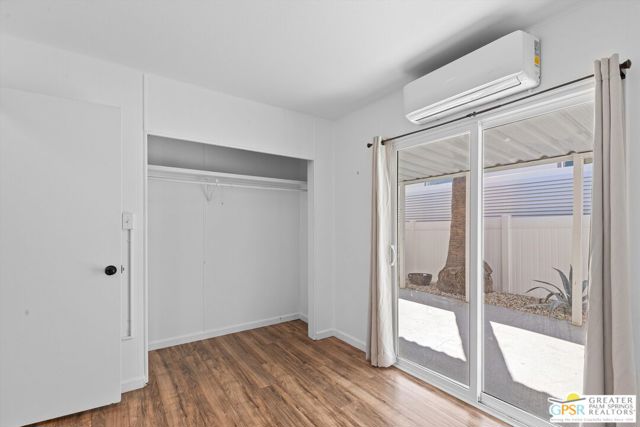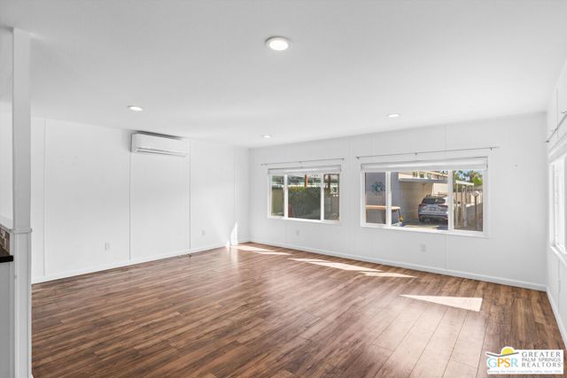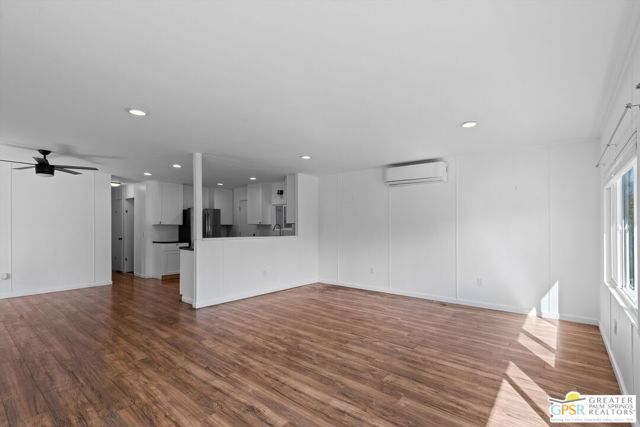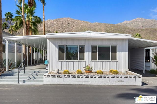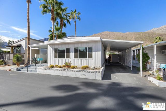 Offering a desirable address in South Palm Springs' popular resort community of Palm Canyon Mobile Club, this upgraded double-wide home makes it easy to kick back and enjoy life. Introduced by an expansive covered patio with mature landscaping, the two-bedroom, two-bath floorplan enhances indoor/outdoor living and entertaining. Large windows bathe the interior in natural light, and the dining room and both bedrooms open directly to the lanai, where swaying palms, white vinyl fencing and newer irrigation are featured. This 1969 Royal Lancer design is remodeled, creating a seamless flow between the generous living room, dining room and kitchen. Featuring direct access to a large carport, the kitchen displays white Shaker cabinetry, stainless-steel appliances, black countertops and a full tile backsplash. Approximately 1,200 square feet, the inviting home is appointed with woodgrain plank flooring, high ceilings, recessed lighting, newer interior doors, newer drywall and trim, vessel sinks in both baths, built-in closet systems and interior laundry. Energy-efficient dual-pane windows, new plumbing and electrical systems, newer insulation, an updated water heater, and multi-zone high-efficiency mini-split heating and cooling systems are also included. There are no age restrictions at Palm Springs Mobile Club, which is set against a backdrop of gorgeous mountain views and presents an upscale clubhouse with billiards room, lounge, gym and kitchen. Outdoors awaits a pool, spa, fire pit, enclosed dog park and a shuffleboard court. Downtown Palm Springs' restaurants and shops are only minutes from home, and scenic trails in Indian Canyon are nearby. Space rental is $1,250 per month and includes water, trash and sewer.