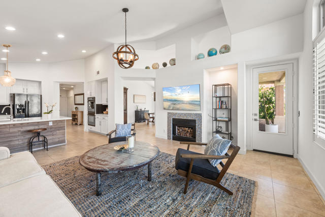 Step into this upgraded Islands 3 model that has been remodeled with a comfortable but chic feel. Experience the joy of living at a resort.The kitchen offers a beachy style. The soapstone counters are exquisite and durable. Double ovens to cook everything. A designed backsplash under the counter and on the wall adds to the contemporary flair.A very convenient layout allowing each room an easy flow into the next.The 20'' tile floors in the main areas are appealing to the eye and easy cleanup. All of the windows and sliders are upgraded. The home is bright with a fantastic view. The patio provides privacy and showcases the water, mountains, fountain, and palm trees. One of the best views on this third hole of the golf course. Peaceful and enjoyable watching the golfers play in tournaments or just for fun. A perfect spot to soak it all in.The hanging light fixtures throughout are hand chosen and stunning. The primary suite has a fully remodeled hotel like bathroom. Dual vanities and elegant upgraded mirror. Contemporary and classic.A beautiful barn door separates the two areas. A walk in closet. Again, natural light throughout.The expanded 2nd bedroom is an added luxury. Very rare in this model. There are two windows and one faces the street. Such an extra feature.Beautifully done and offers many additional possibilities. The third bedroom can remain as that or create a den or other space with the full closet as an extra plus for storage. The convenience of the inside laundry area is very appealing, especially on a hot day! A great all around home in the Oasis Country Club. There are gathering areas spaced throughout the club. There are pools galore, spas, golf (many different golf packages offered for every level of golf),mini 18 hole putting green, tennis, dog park, pickle ball, and clubs and entertainment all year long. The grill, lounge and dining room have menus to please everyone. Breakfast, lunch, dinner and happy hour are attractive dining options for any day. The fun never ends! A true lifestyle to dream about.....