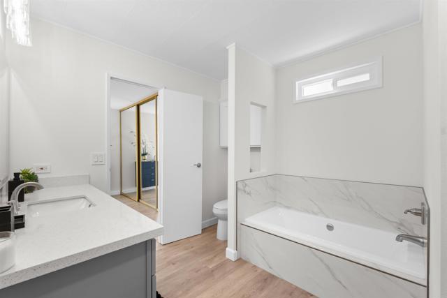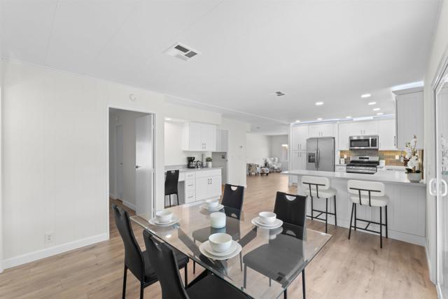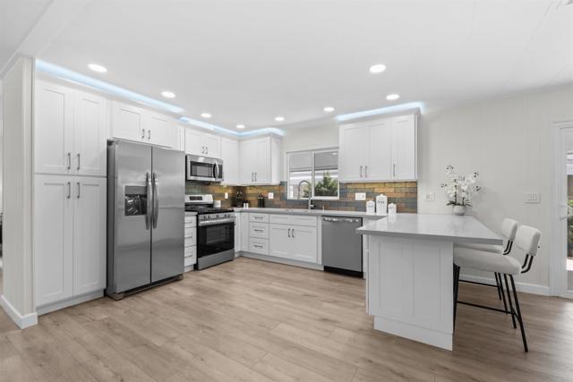 SELLER WILL PAY 6 MONTHS OF LEASE FEES WITH THE RIGHT OFFER! Welcome to this beautifully renovated home in the 55+ community of Sundance Mobile Home Park, where comfort, style, and easy living come together. From the moment you step inside, the open-concept design creates a warm and inviting space perfect for everyday living and entertaining. The heart of the home is the stunning kitchen, featuring quartz countertops, brand-new stainless-steel appliances, recessed lighting and plenty of cabinetry—ideal for everything from quiet mornings to hosting friends. The adjacent family room includes a built-in media desk and opens to a covered patio, perfect for indoor-outdoor living. The guest bathroom has been remodeled with new vanity, walk-in shower, linen storage, custom lighting and is accessible from the hall or guest bedroom. The spacious primary suite features a ceiling fan and ample closet space plus an en-suite bath with a tiled walk-in shower, separate tub, and new vanity. Additional upgrades include re-piped plumbing, new sump pump, new LVP flooring throughout, new energy-efficient, windows, new return ducts for A/C, ventilated exhaust fans in both bathrooms, covered two-car parking, and a large storage shed—making this home truly move-in ready. Enjoy resort-style living with access to a clubhouse, heated pool and spa, fitness center, saunas, library, billiards, shuffleboard, and beautifully maintained greenbelts. Just minutes from the 15 freeway and ideally located near shopping, dining, and entertainment, this turn-key home offers the low-maintenance living you have been looking for!