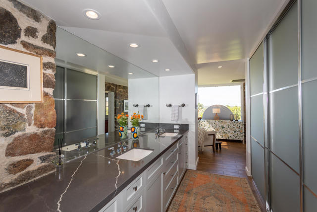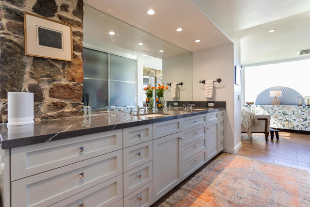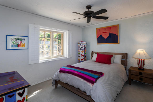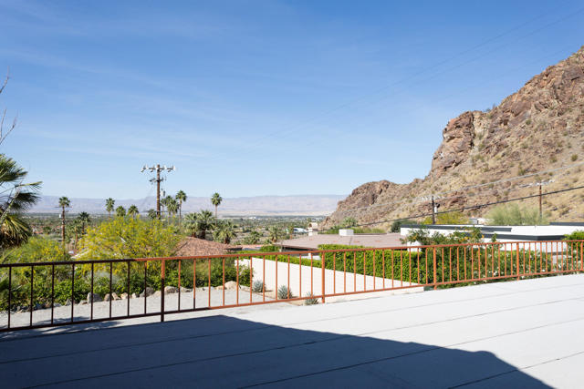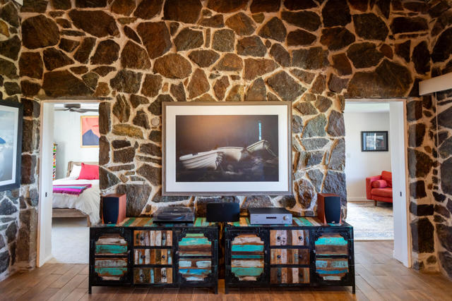 If you are looking to own a piece of history without sacrificing modern amenities look now further. This iconic desert retreat has a class one historical designation. Know as the Giannini residence, the original owners and founders of Bank of America made this their desert retreat nestled higher up in Araby Cove. Araby cove is one of the first and oldest subdivisions in South Palm Springs. The home was constructed with board formed , poured in place concrete and finely cut locally quarried stone over the concrete walls which is reminiscent of the craftsmanship from the 1880s-1930s era. The property also features a basement and bank type vault which could be a nice wine cellar. The basement stays at a cool temperature naturally through the year and has added AC in case you would like it even cooler. A large Albert Frey deck serves as a star and view gazing platform as well as a shade for the cars underneath. This could be a huge party space as well! Enter up a grand stair way to a stone porch! The porch is naturally cool being surrounded by rock and the orientation from the sun. The views from the front of the home are incredible and expansive. Enter the home thru old French doors and you are greeted with a huge original rock fireplace. The living room flows nicely into an office nook, then into a gourmet kitchen, butler pantry and coffee bar and breakfast nook. This all opens up to the lovely outdoor space surrounded by patios, a kidney shaped pool, spa and top of the line desert scape. There are outstanding views from each of the homes outside and inside viewing areas. Back inside the home we will find a large formal dining room to accompany your chefs kitchen. There is one guest bedroom and a den serviced by a jack and jill bath. The second bath on that side also able to serve the entertaining and dining areas. The other side of the home offers the primary suite with a large bath and sitting area. Also on that side is the second guest bedroom. This home has changed hands less than a handful of time in a 100 years. This is a a once in a lifetime opportunity to own a piece of history. The current owner has installed a very expensive and extensive HVAC system, added a whole house water softening system ,added new insulation, updated appliances, serviced the septic system , updated wiring and so much more. The home is ready for your upmost enjoyment and trouble free living!