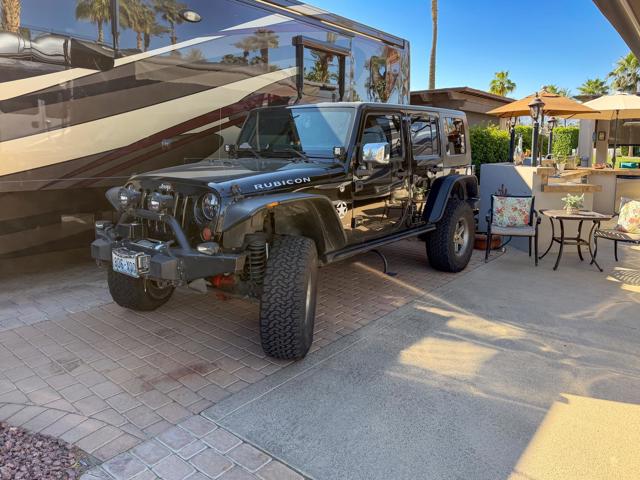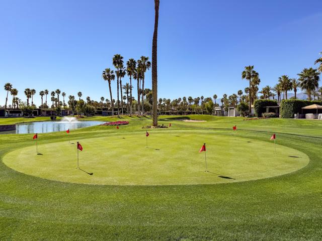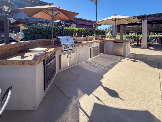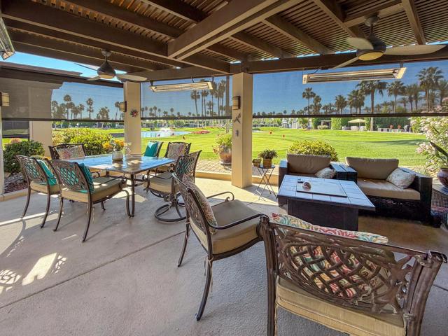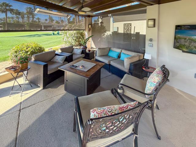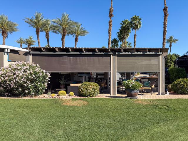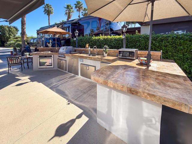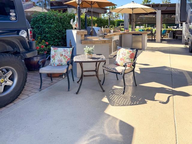 Outdoor Resort Indio is a Class A Motorcoach resort. Welcome to Lot 8 at Outdoor Resort Indio, a beautifully positioned southern-facing golf course lot directly adjacent to the resort's putting green -- ideal for golf enthusiasts who enjoy stepping right into the action. With mountain views from both the windshield and the rear of the lot, and no direct sun on the windshield, this property is thoughtfully oriented for comfort. Located across from the clubhouse, you're near the center of activity while still enjoying a private and well-designed outdoor space.The outdoor living area is built for both durability and entertaining, featuring an Alumawood pergola with a waterproofed Sunbrella top, masonry-built kitchen and posts, three heaters, two fans, and adjustable screens that help trap warmth when needed. The large kitchen includes an oven, dishwasher, microwave, electric cooktop with induction, refrigerator, generous storage, and two built-in umbrellas. A privacy wall with mounted TV enhances the entertainment area, while extended pavers and attractive landscaping complete the setting.The Cooldeck-coated RV pad keeps the surface comfortable and easily accommodates a 45-foot coach with easy parking access. Furnishings include a wicker seating set with loveseat, chairs, fire table, dining tables with seating, custom covers for the kitchen and furniture, and two storage boxes. Lot 8 offers an exceptional combination of golf course access, mountain views, functional design, and prime location within one of the Coachella Valley's premier Class A motorcoach resorts.