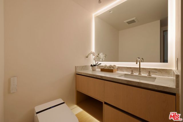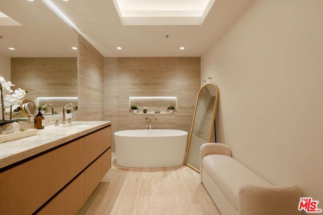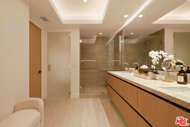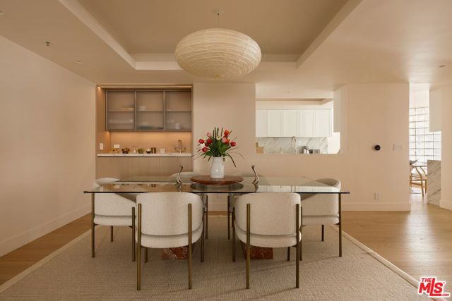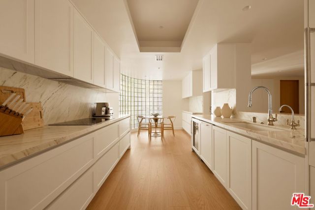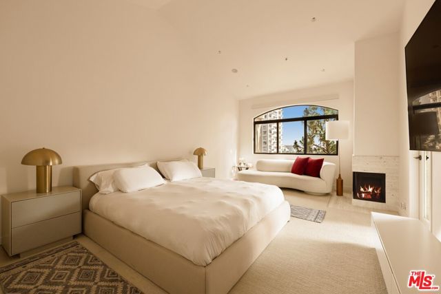 Rare Top Floor High Ceiling fully remodeled 3-bedroom, 2.5-bath residence with dual balconies the exclusive Century Park Place, a lush 14-acre, low-rise complex with 24-hour guard-gated security, three pools, tennis courts, a dedicated fitness center, and sauna, just moments from Rodeo Drive and Westfield Century City Mall. Every detail reflects a design-forward vision executed with lasting functionality and exquisite taste. Italian oak floors, a wood-paneled entryway wall, and soaring ceilings with architectural recessed lighting set the tone the moment you step inside. The kitchen is perfected by natural light pouring through breakfast nook windows, bathing custom Italian designed cabinetry, full Miele appliances, built-in beverage refrigerator, and imported Calacatta countertops that extend seamlessly up the backsplash. A complementary wet bar in the adjacent dining room mirrors the stone counters and cabinetry, completing the intention. Twenty-two-foot ceilings and sliding glass walls give the great room its heart, anchored by a travertine corner fireplace with direct balcony access. The primary bedroom frames views of the Hollywood Sign, Griffith Observatory, and the Hollywood Hills, with balcony access, a custom Large Italian designed walk-in closet, and a spa bathroom featuring dual sinks, freestanding tub, travertine tile walk-in shower, frosted glass water closet, and cove ceilings with custom lighting. Two additional bedrooms offer custom closets, solid wood doors, motorized shades, and sliding glass doors to the balcony. One en-suite and a powder room are finished in butterfly-matched Taj Mahal stone slabs, contrasting white oak, Phylrich hardware, and automated smart toilets. The large laundry room features a full size LG washer dryer (Vented) with matching stone countertops and custom cabinetry.The residence is fully equipped with Nest smart home heating and cooling, motorized shades, Lutron lighting, remote-accessible deadbolt, Ring security, built-in speakers, brand-new HVAC, Italian wood flooring, non-toxic eco paint, and a completely rewired electrical system. Nothing spared, this home is built to enjoy every day and last a lifetime.