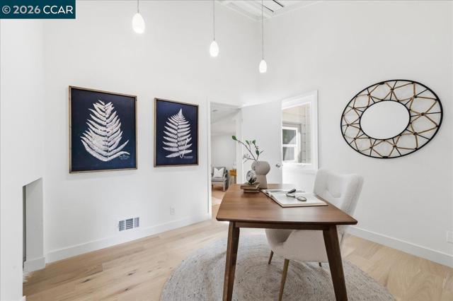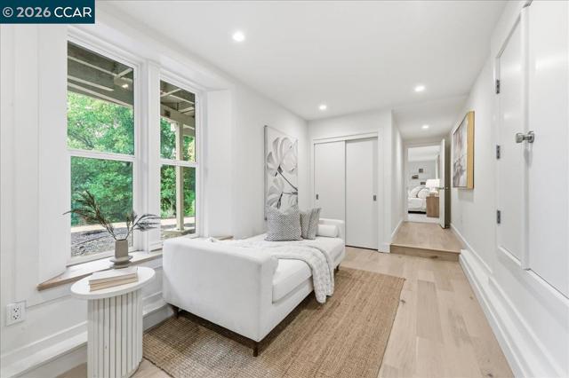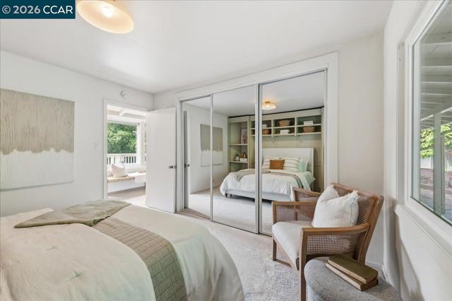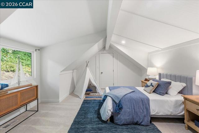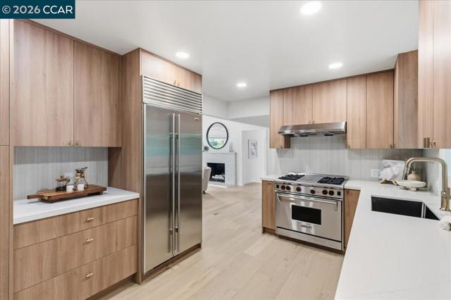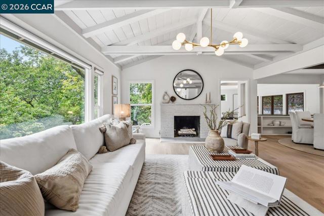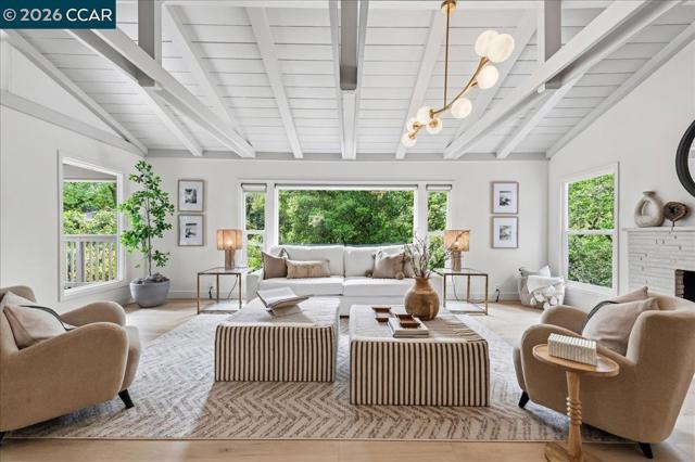 Tucked on a private Lafayette hillside among majestic oaks, this home offers a peaceful retreat with rare walkability to downtown, BART, dining, groceries, and top rated schools. New engineered hardwood flows through most of the home. The main level offers distinct yet open concept living, dining, and family rooms. The redesigned and remodeled chef’s kitchen boasts a new layout, custom European slab cabinets, quartz counters, a designer tile backsplash, and premium Wolf, Sub Zero, and Bosch appliances. This floor has three bedrooms, one with backyard access ideal for guests or extended living, and a remodeled bath with Pottery Barn and West Elm finishes. Upstairs, a loft bedroom provides a private escape. Downstairs, the primary suite offers a sitting area, laundry, a full bath with a jetted tub, and outdoor access. On a nearly 1/2 acre lot, the property features new paint across the entire exterior, including decks. Newly landscaped grounds include patios and a new backyard retaining wall. Additional upgrades include a new paver driveway and finished garage with a new door, silent motor, and EV charger outlet. Accessed by a private road, the home includes convenient extra parking at the bottom of the hill. Turnkey and move in ready in Lafayette’s Tanglewood neighborhood.