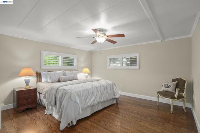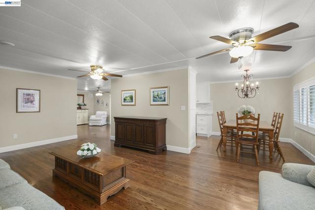 Fabulous Home– A perfect place to live! Bright and open floor plan: Gleaming hardwood floors,warm interior colors,custom interior shutters over dual pane windows,modern baseboards,crown molding throughout,ceiling fans,recessed lighting. Expansive living room: abundant natural light,ceiling fan with lights,seamless flow into the dining room w/a charming chandelier. Well-appointed kitchen: upgraded white shaker-style cabinets,quartz countertops,pantry cabinet w/lots of pull-out drawers. Incl.SS deep sink, dishwasher,French door refrigerator,gas stove with hood. Family room: ceiling fan/lights, recessed lighting and a framed sliding glass door w/sliding shutters. Spacious master bedroom: Includes ceiling fan with light,built-in closet and adj. master bath with white shaker style dual vanity,quartz countertop,elegant lighting,walk-in closet,modern walk-in shower w/clear-glass shower doors,comfort-height toilet,window. 2nd bedroom: Generously sized w/large built-in closet,ceiling fan w/light,access to the hallway bathroom. Hall bathroom: white shaker-style sink vanity w/quartz countertop,tile flooring,modern walk-in shower w/clear-glass shower doors, comfort-height toilet. Convenient laundry room w washer/dryer, white storage cabinets.Welcoming front porch,side yard. Fireplaces: NO