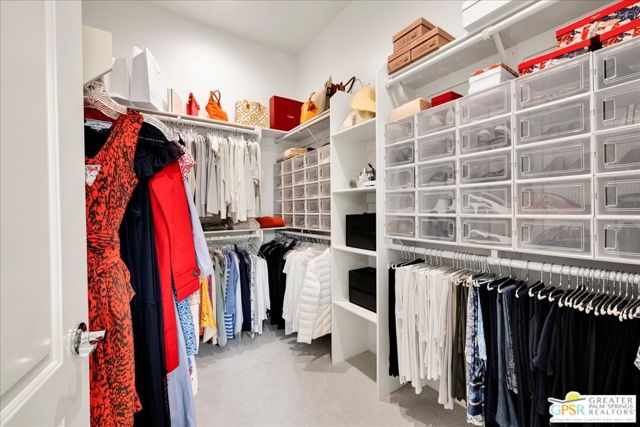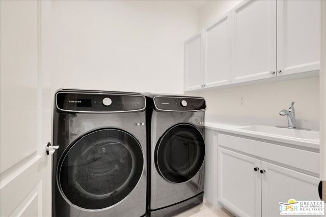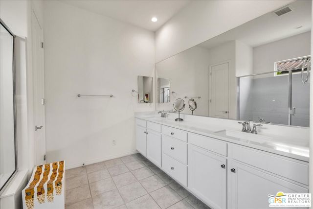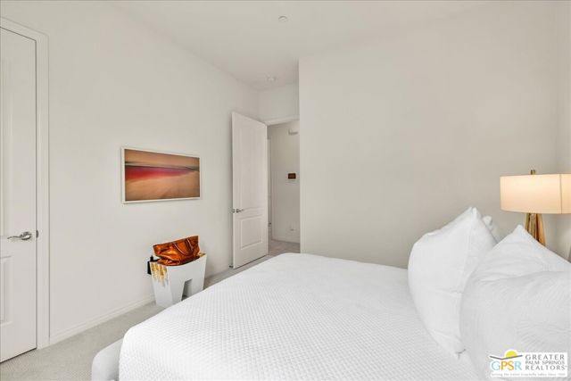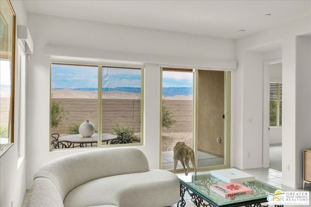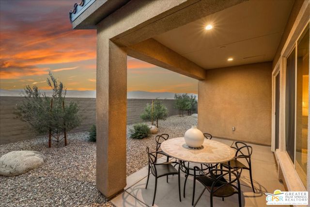 Perimeter View Home with Mountain Backdrop in Del Webb Rancho Mirage. Ideally positioned along the perimeter of the community, this Phase 6, Plan 3 Expedition with Tuscan facade offers unobstructed mountain views and a peaceful setting within the highly sought-after Del Webb Rancho Mirage community. This newer, energy-efficient home features 2 bedrooms, 2 baths, and a versatile flex space, thoughtfully designed for comfortable everyday living. Inside, the home showcases expanded 12-inch tile flooring, custom designer window treatments, and the desirable Arch package throughout, creating a warm and inviting atmosphere. The centrally located kitchen serves as the heart of the home, featuring natural granite countertops, 42-inch upper cabinetry, and additional pendant lighting above a generously sized island with ample seating. A stainless steel Whirlpool appliance suite with convection oven and microwave, along with a convenient walk-in pantry, adds both style and functionality. From here, the kitchen flows effortlessly into the dining and living areas, where natural light and beautiful views of the surrounding mountains enhance the open-concept design. The primary suite is spacious and relaxing, offering mountain views and a well-appointed ensuite bath complete with a glass-enclosed stall shower with bench seating, dual undermount sinks, and a large walk-in closet. Located toward the front of the home, the flex space/den is currently used as an office but can easily serve as a media room, hobby space, or wellness retreat. Just beyond, you'll find the upgraded pass-through guest bathroom, featuring a glass-enclosed shower-over-tub combination and generous linen storage, which is conveniently located near the secondary bedroom with its own walk-in closet. Step outside to a fully landscaped backyard designed for easy desert living, featuring a covered patio ideal for outdoor dining and relaxation, along with drought-tolerant trees and shrubs, decorative river rock accents, and a clean, low-maintenance landscape that complements the beautiful mountain backdrop. The laundry room is well equipped with additional upper cabinetry, a utility sink, and Samsung Smart washer and dryer with steam functions. Additional highlights include leased solar ($120/month), an epoxy-sealed garage floor, ample built-in garage cabinetry, and a NEMA 50-amp outlet ready for a future EV charger. Located within the prestigious 55+ Del Webb Rancho Mirage community, residents enjoy access to exceptional amenities including a large clubhouse, state-of-the-art fitness center, resort-style pool and spa, tennis and pickleball courts, and a vibrant calendar of social activities. HOA dues now include a cable and internet package for added value and convenience. A beautifully maintained home with views, comfort, and the best of resort-style desert living.