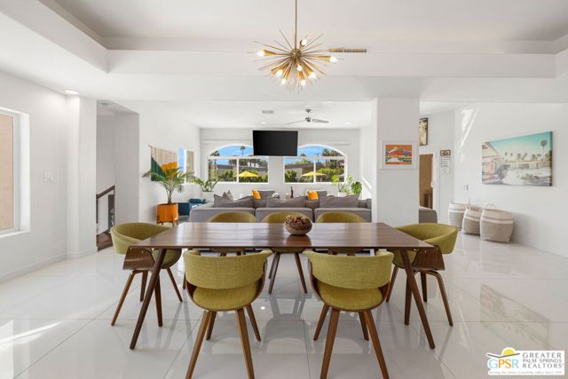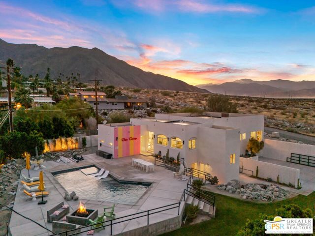 An exceptional opportunity to own a TURNKEY fully furnished renovated HILLTOP estate in Chino Canyon with jaw-dropping 360 views, resort-style amenities, and proven vacation rental income. This gorgeous retreat captures truly breathtaking panoramic views, stretching across the iconic Palm Springs mountains, sparkling city lights, and even snow-capped peaks of Big Bear. From sunrise to sunset, every angle of this property is designed to showcase the beauty of the desert from an elevated, private vantage point. Spanning over 3,500 square feet and situated on an oversized lot of more than 17,000 square feet, this completely remodeled home offers both space and privacy in a truly spectacular setting. All four bedrooms are en-suite and each with its own walk-in closet. Two bedrooms are located upstairs and two downstairs with both levels offering direct access to the backyard, creating an ideal layout for seamless indoor-outdoor living and guest privacy. The primary suite is a true retreat, complete with a soaking tub and a private laundry area conveniently located within the walk in closet. The immense kitchen is both stunning and functional, featuring quartz countertops, a striking marble waterfall island, stainless steel appliances including a Thor double oven, soft-close cabinetry, and a walk-in pantry. Designed for both relaxation and entertaining, the outdoor spaces are truly resort-inspired. Enjoy the massive pebble-tec saltwater pool with new equipment and heater, a built-in gas firepit, and a fully equipped outdoor kitchen complete with BBQ, sink, and refrigerator, all set against a dramatic backdrop of mountain views and windmill vistas. Lush grass, mature ficus, and natural rock and boulder landscaping enhance the sense of privacy and tranquility. Inside, the home features white Spanish porcelain flooring, beautifully finished bathrooms with porcelain tile showers, and a gas fireplace that welcomes you at the entry. A separate outdoor laundry room and pool bathroom add convenience for guests and effortless entertaining. Additional highlights include a motorized gated entry, security system, solar system, new plumbing (hot and cold supply), updated downstairs HVAC, EV charging in the covered two car garage, and fully permitted improvements throughout. This property is not only a stunning primary or second home, but also a highly successful vacation rental. Located in a neighborhood where short-term rental permits are still available (buyer to verify), it presents an exceptional investment opportunity with strong income potential. Here is your chance to own a meticulously upgraded desert sanctuary with unmatched views, privacy, income potential, and lifestyle amenities just minutes from the heart of Palm Springs.