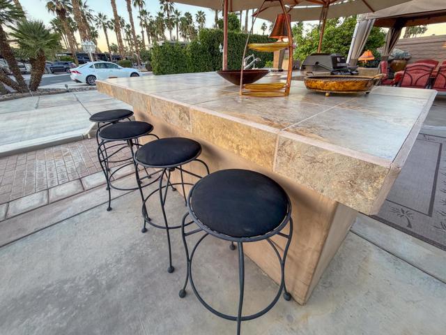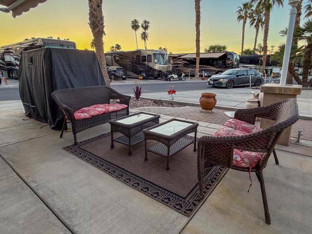 Welcome to another exceptional opportunity at Outdoor Resort Indio, one of the premier Class A motorcoach resorts in the Coachella Valley. Designed with entertaining and comfort in mind, this lot centers around a gazebo with shades and a newer top, creating a comfortable outdoor living space throughout the desert season.The medium-sized outdoor kitchen is thoughtfully equipped with an electric stove, refrigerator, built-in BBQ, two-burner cooktop, garbage disposal, and hot water sink, along with two additional freestanding bar refrigerators -- ideal for hosting gatherings. Seating is abundant and inviting, including a dining table with six red-cushioned chairs, a fire table surrounded by four wicker chairs, two wicker loveseats with matching coffee tables, round and square bar stools, and additional glass end tables to complete the entertaining setup.Practical features include a water softener, a large storage shed, two plastic storage bins, and even a golf cart with cover included for easy access around the resort. Located just a short walk to a satellite pool with hot tub and sauna, this lot offers the perfect blend of relaxation, convenience, and vibrant resort living at Outdoor Resort Indio.Outdoor Resort Indio is a Class A only RV resort