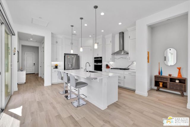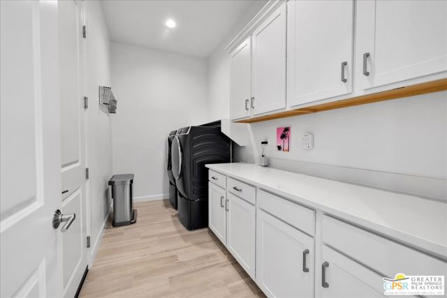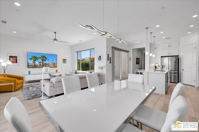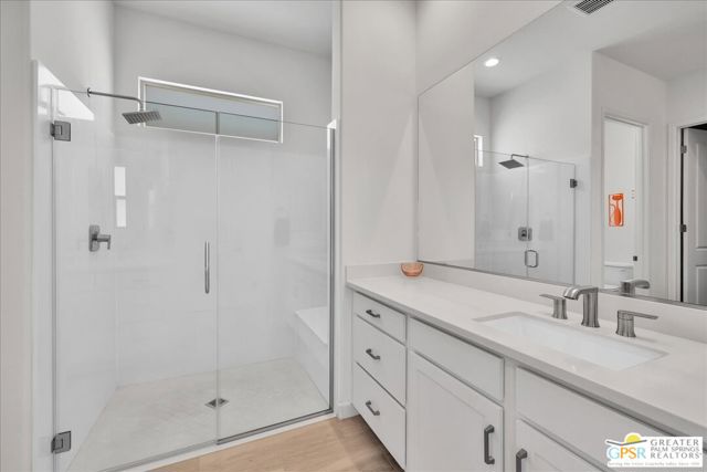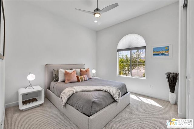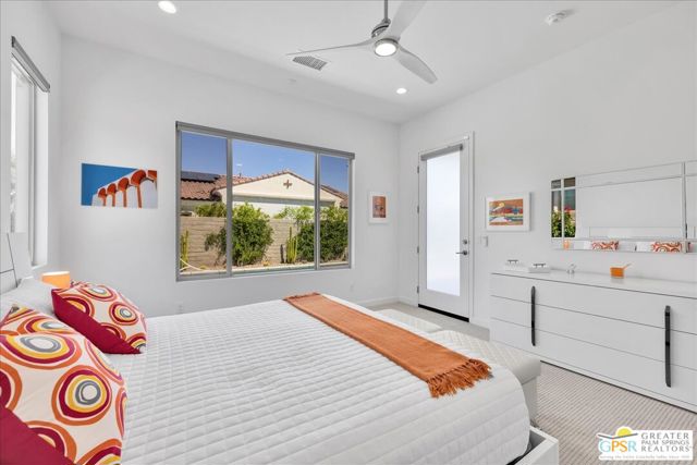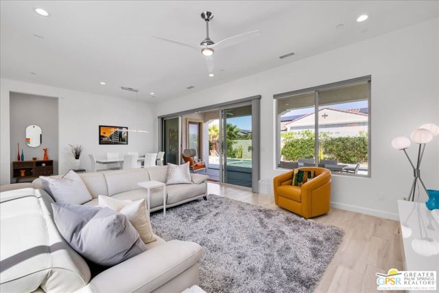 Rare Three-Bedroom Haven with Pool, Spa & Mountain Views | Del Webb Rancho Mirage. Located on a spacious lot in the final phase of the 55+ community of Del Webb Rancho Mirage, this beautifully upgraded Phase 7, Plan 5 Haven with Spanish facade offers a rare combination of features, including the highly sought-after three-bedroom configuration, OWNED SOLAR, and sweeping MOUNTAIN VIEWS. Thoughtfully designed for both comfort and style, this home features WOOD-LOOK PORCELAIN PLANK TILE FLOORING, custom window treatments, and modern brushed nickel fixtures throughout, creating a fresh and inviting atmosphere. The kitchen is the heart of the home and has been extensively upgraded with white shaker cabinetry, 42-inch upper cabinets, Jewel topper cabinets with crown molding, and Level 5 QUARTZ COUNTERTOPS complemented by a full-height backsplash. A large reach-in pantry has been enhanced with custom shelving, additional storage, and added power outlets for convenience. The oversized island offers generous seating and additional lighting, making it ideal for gathering and entertaining. Unique to the Haven floorplan is the charming secondary courtyard patio just off the kitchen - a wonderful extension of the living space and the perfect setting for morning coffee, al fresco dining, or enjoying the desert climate year-round. The kitchen flows seamlessly into the dining and living areas, all filled with natural light and opening to the spectacular backyard through expansive glass. Outside, the large covered patio overlooks a stunning 43-foot pool and spa with tanning shelf, all framed by beautiful mountain views and generous outdoor space. The primary suite is a peaceful retreat with views of the backyard and direct access to the patio through an upgraded access door. The spacious ensuite bath features dual separate vanities, each with its own undermount sink, a large glass-enclosed shower, and an exceptionally large walk-in closet with custom built-in cabinetry and shelving. The two additional bedrooms are privately located on the opposite side of the home and each feature custom closet systems, making them ideal for guests or family. They share convenient access to a well-appointed secondary bath. This oversized lot is especially well suited to the Haven floorplan, offering abundant outdoor living space both in the backyard and around the secondary courtyard patio. Mature landscaping, mountain views, and multiple entertaining areas make this home feel like a private resort. Additional highlights include a 2.5-car garage with epoxy-sealed floors, climate control, extensive custom cabinetry and workbench space, plus a NEMA 50-amp outlet ready for a future electric vehicle charger. Ideally located within close proximity to the clubhouse, this home provides easy access to all that Del Webb Rancho Mirage has to offer, including a resort-style pool and spa, state-of-the-art fitness center, tennis and pickleball courts, and a vibrant calendar of activities and events and more! The community is also conveniently located near shopping, dining, entertainment, and the renowned Eisenhower Medical Center. HOA dues now include cable and internet for added convenience and value. A rare opportunity to enjoy one of Del Webb's most desirable floorplans with exceptional indoor-outdoor living, generous space, and stunning desert views.