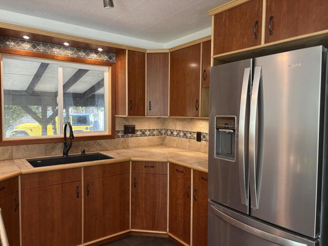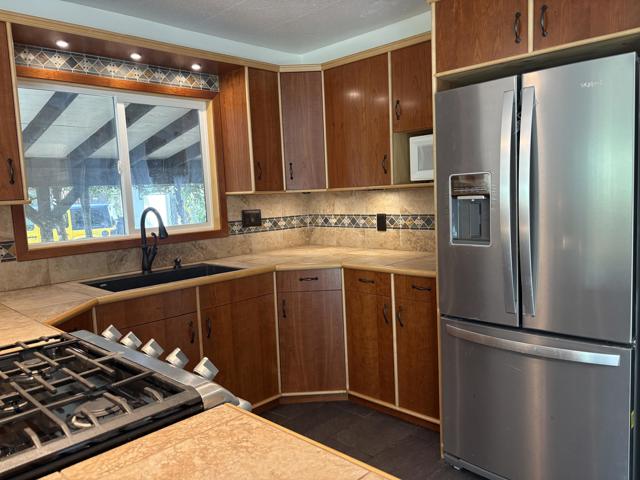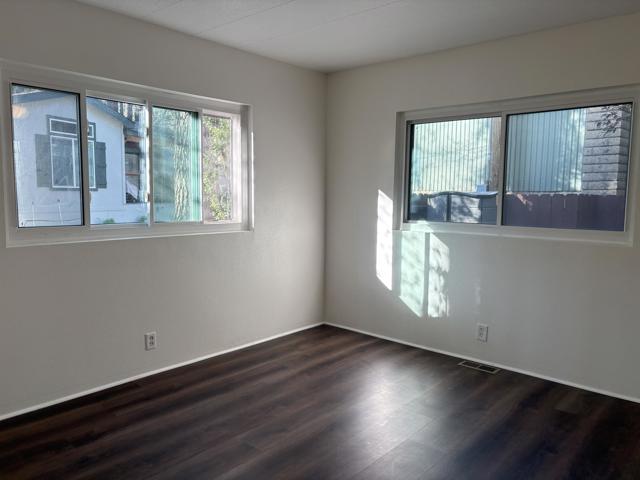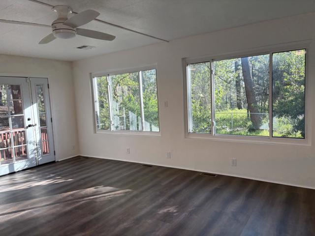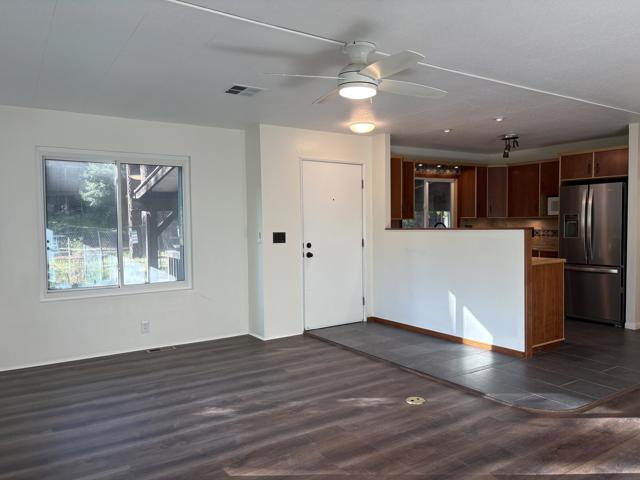 Welcome to one of the largest and most private mobile homes in Idyllwild Trailer Park, a 55+ senior-only mobile park located in downtown Idyllwild. This approximately 1,200 sq. foot light and airy home, located at the end of the road in the park, offers lots of space, peace, and quiet for full-time or part-time living. The home features two large bedrooms with ample closet space, two bathrooms (one full, one 3/4), a separate office space, a large living room, large kitchen, dining area, and separate laundry room, as well as outdoor decking. The home has new flooring, new indoor paint, dual pane windows, and the primary bathroom has been remodeled. Off of your parking area you enter through a spacious covered patio into the open concept living, dining, and kitchen areas that include lots of cabinets and a built-in hutch, as well as a slider to the back side deck. Off the hallway you have access to the laundry area with further access to the separate bonus room/office that opens onto the second deck in the in backyard. Continuing down the hall, on your left you have the guest bedroom, which is across the hall from the 3/4 bathroom. At the end of the hall is the oversized primary suite that includes a large closet and an en suite remodeled full bathroom. Upgrades include new exterior and closet doors, dual pane windows, primary bathroom vanity and tile, redone footings and skirting, as well as a newer refrigerator. All appliances are included. The space includes fruit trees planted to the right of the home. Space rent at is $817 per month, which includes water and snow plowing fees.