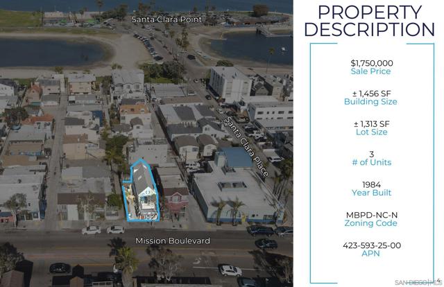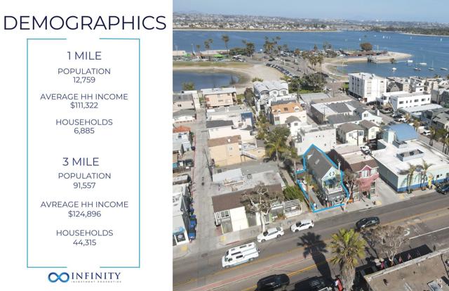 3719 Mission Boulevard is an exceptional 3-unit mixed-use property in the heart of Mission Beach. Built in 1984 and recently renovated, this ±1,456 SF building is situated on a ±1,313 SF lot with prime street frontage and visibility to approximately 20,140 vehicles per day. Located just one block from both the ocean and the bay, the property lies within one of San Diego’s most sought-after coastal neighborhoods. Ideally suited for an owner-user, the property features a ground-floor retail storefront, an operational Airbnb unit upstairs, and the flexibility to support a live/work lifestyle. All units can be delivered vacant, allowing for potential expansion of the ground-floor retail footprint. Amenities include 3 bathrooms, laundry, storage, patio, and balcony. This is a rare chance to own a income-generating owner-user asset in a high-demand coastal location. Unit Mix: ±311 SF Storefront Retail, ±345 SF Studio, and ±800 SF AirBnB