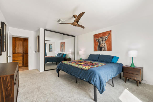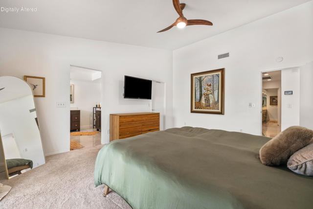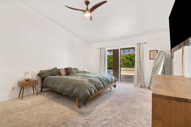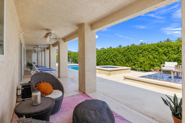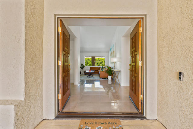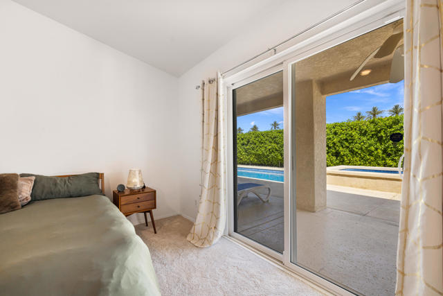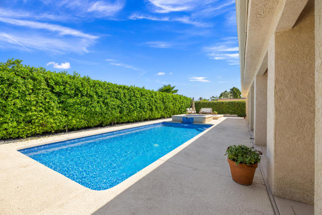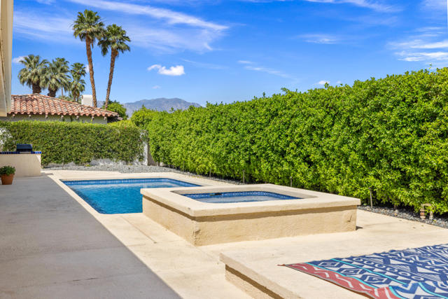 Set within one of Indian Wells' most desirable neighborhoods, this beautifully maintained furnished residence offers 2,124 square feet, 3 bedrooms, 2.5 baths, and a 2-car plus golf cart garage on an expansive 10,019 square foot lot. Ideally situated near shopping, dining, and the exceptional benefits enjoyed by Indian Wells residents, this inviting home offers comfort, space, and an effortless desert lifestyle. A newly landscaped south-facing courtyard and double-door entry create a gracious sense of arrival. Inside, the spacious great room is enhanced by high ceilings, a handsome stucco fireplace, and beautiful sightlines drawing the eye to the pool and outdoor spaces. The floor plan also features a formal dining area and a versatile bonus room, ideal for a library, office, or fitness space. Designed for seamless indoor-outdoor living, the backyard showcases a large rectangular, blue-tiled pool, jet spa, covered patio, extended patio spaces, and a built-in barbecue--perfect for entertaining or relaxation. The north-facing rear yard offers privacy, while the front courtyard captures south mountain views, The kitchen features granite countertops and backsplash, a center island with storage, stainless steel appliances, a Viking cooktop, large refrigerator, and updated fixtures. The private primary suite offers a high ceiling, large walk-in closet, dual vanity, soaking tub, spacious walk-in shower, and sliders opening directly to the pool and spa. One guest bedroom enjoys a beautiful south-facing mountain view and hard wood floors. Additional highlights include new paid solar, new HVAC and Lennox thermostat, new modern ceiling fans, new glazed gray porcelain tile flooring, plush carpet in select bedrooms, generous built-in storage, and no HOA.