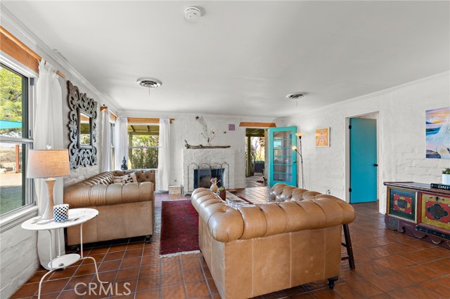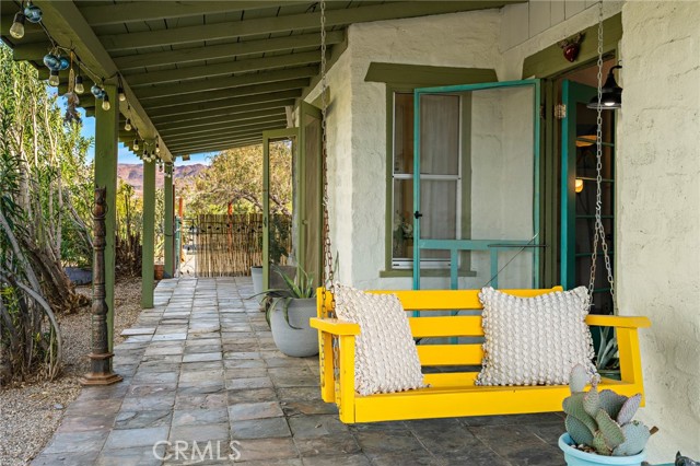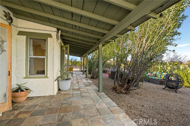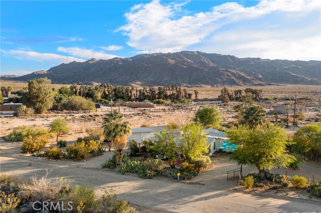 HISTORIC 1938 ADOBE: This architecturally significant property – featured in Historic Adobe Homes magazine – offers timeless desert appeal. Located within walking distance to the iconic 29 Palms Inn, Kitchen in the Desert and downtown Twentynine Palms, providing a rare opportunity to own an authentic adobe home in one of the town’s most desirable settings. Situated on a .51-acre triangular parcel uniquely positioned so the point of the lot faces directly toward the iconic Oasis of Mara, creating a setting that feels deeply connected to this remarkable natural landmark. Set against the mountains in a prime Twentynine Palms location, the property enjoys beautiful back views of the mature palm groves, with towering palms, mature trees, cactus gardens, and a peaceful breeze from the nearby natural spring pond adding to the sense of a true desert oasis. The home is surrounded by vacant lots on two sides, enhancing the sense of seclusion and making the parcel feel unusually expansive and private. This 3-bedroom, 2-bath home spans 1,491 square feet, with a layout that creates an easy connection to the outdoors, as most rooms have direct access outside, blending indoor and outdoor living. Recent improvements include new windows, a new water heater, a new kitchen counter, and new ductless mini-split heating/cooling system for efficient year-round comfort. The home also features a wood-burning fireplace for ambiance, a front porch facing open desert vistas and lush gardens for morning or evening beverages, in addition to an outdoor shower, private backyard, 4-car garage, and a 220V hookup ready for a future hot tub.