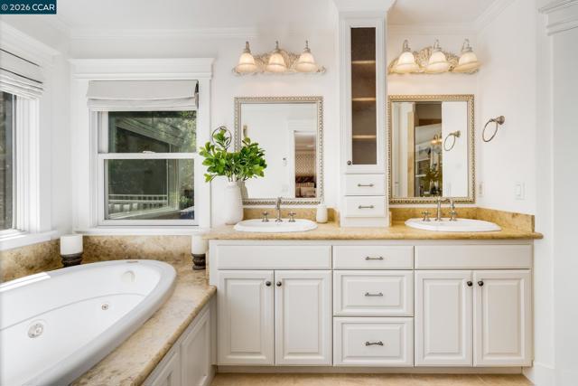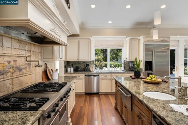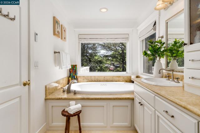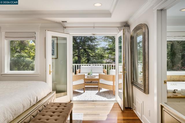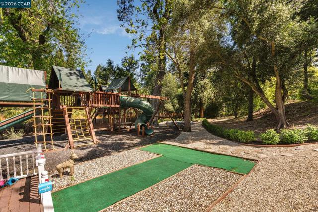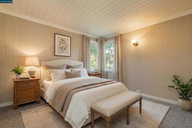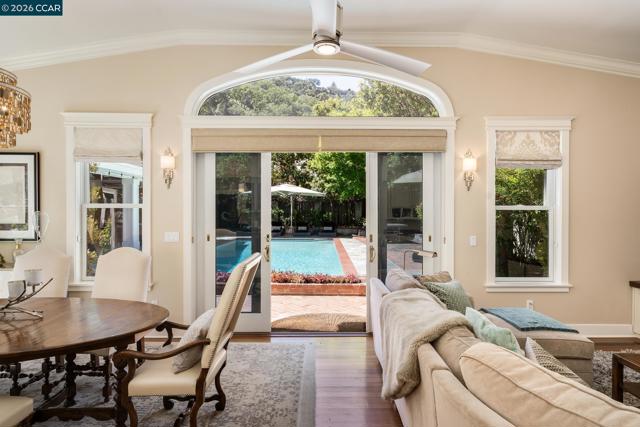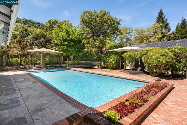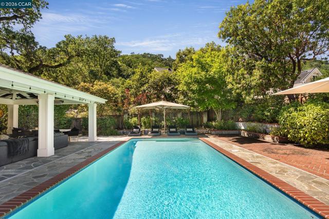 Tucked into a serene, tree-lined setting on approximately 1.4 acres of park-like grounds, this exceptional Westside Alamo property offers privacy, scale, and a combination of indoor and outdoor amenities. A gated driveway leads to a beautiful white residence, where a classic brick walkway and front porch add timeless charm. The property includes a separate ±800 sq ft ADU cottage with its own address, featuring 2 bedrooms and 1 bathroom—ideal for guests, extended family, or rental income. Inside, the main house offers a well-designed layout with generous living spaces and seamless flow. A formal living room with a striking fireplace and large windows fills the home with natural light. The main level also features a versatile office with closet, full bath, and an open-concept kitchen, family room, and dining area. Additional highlights include a wine cellar and electrical solar lease. Upstairs, the primary suite opens to a private balcony overlooking surrounding landscaping, along with two additional bedrooms and a shared bath. The grounds feature a solar-heated pool, outdoor pavilion with kitchen and fireplace along with heating and ceiling fans, sprawling lawn, playground, and playhouse—perfect for entertaining. Located along the Iron Horse Trail & close to freeway access.