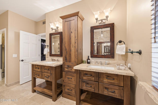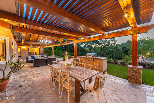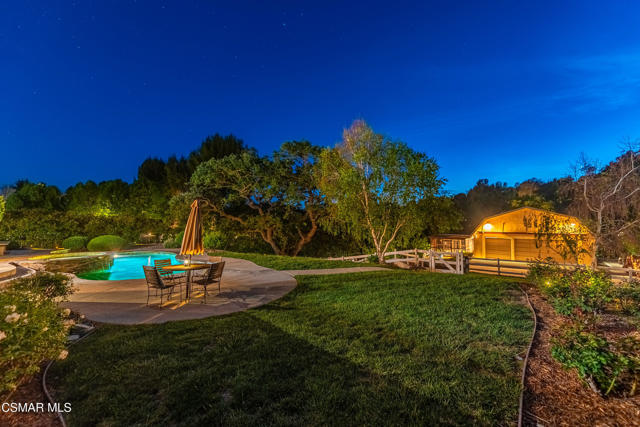 Tucked in the foothills of the Santa Monica Mountains, this sprawling single-story custom estate sits on a vibrant acre of land in the heart of charming Old Agoura. Encompassing 5,476 square feet of relaxed elegance, the property offers a pool and spa, circular driveway, and six garage spaces, including a detached three-car garage with its own gated driveway, perfect for a workshop, barn, or future ADU. Inside, the home exudes warmth and timeless style, where peaked wood-beamed ceilings, wide-plank walnut floors, natural stone counters, and three inviting fireplaces create an atmosphere of comfortable sophistication. The gourmet kitchen is a dream for those who love to cook and entertain, showcasing an eight-foot island, natural stone quartz counters with double ogee edge, a Thermador Professional gas range, two dishwashers, an imported Shaws sink, and a generous amount of cabinetry. The lovely primary suite takes in tranquil views of rolling hills and features a stone fireplace and direct access to the back patio. The home lives primarily as a single story, with stairs leading to a lower-level en-suite bedroom and bath, complete with its own private entrance off the backyard. Additional highlights include an exceptionally large laundry and mudroom, an oversized walk-in storage room not counted as a bedroom, and an owned solar system that includes 3 power wall batteries. Step outside to the covered patio overlooking the pool and landscaped grounds, where there's ample space for horses and a charming, enclosed vegetable garden with chicken coop. Life here can move at an easier pace, where long walks among gentle hills and mature trees make each day feel grounded and connected. Old Agoura is a treasured gem, a picturesque rural community just minutes from shopping, dining, and schools. Enjoy nearby hiking, cycling, or horseback riding at adjacent 4,000-acre Cheeseboro National Park, or be at the beach in about 20 minutes. Located in the award-winning Las Virgenes School District and close to excellent private schools, this property offers the best of both worlds, city close yet a world away.
