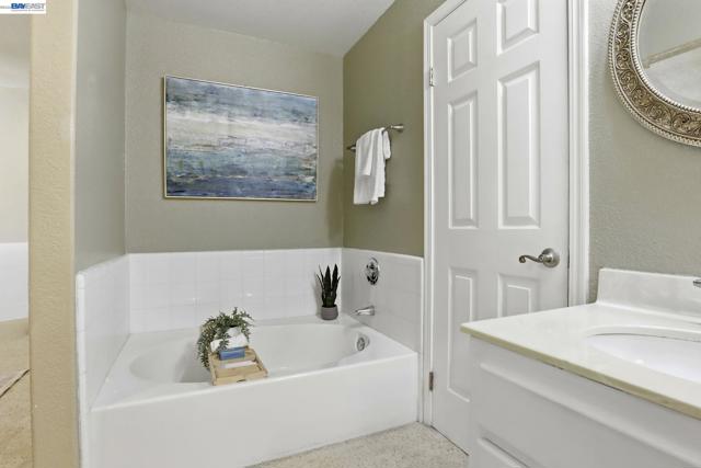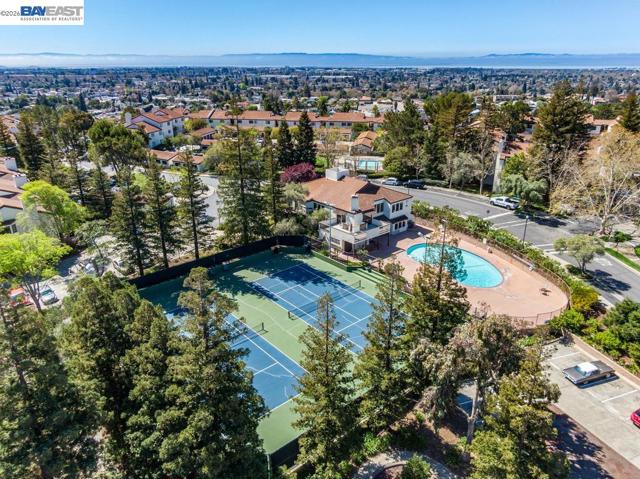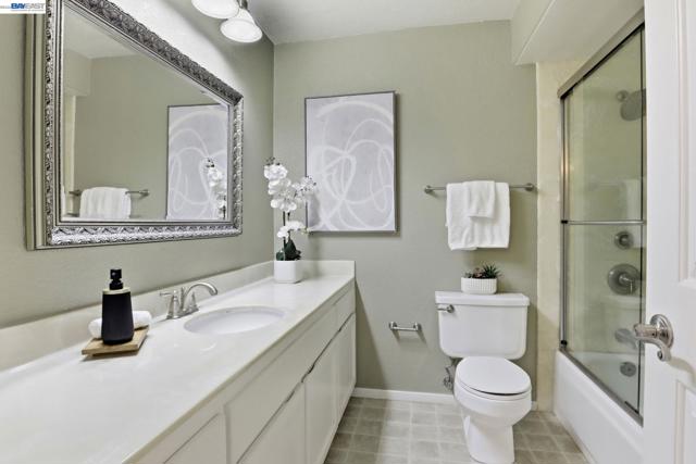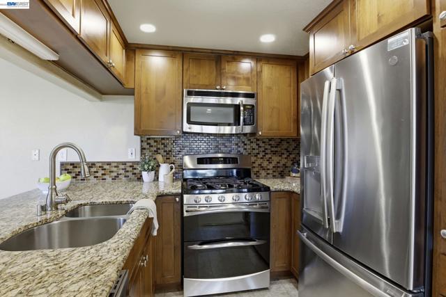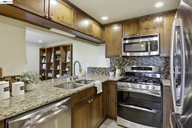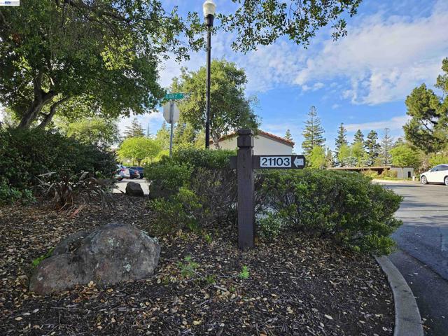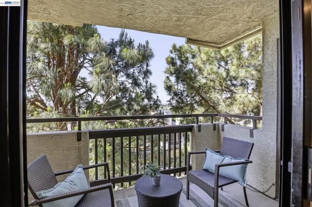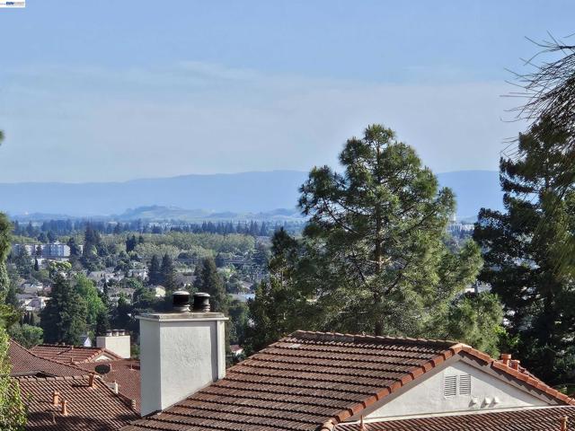 Rare opportunity to own one of the largest floor plans in the Mesa Verde community—this spacious, level-in unit has no steps to entry. Designed for both comfort and flexibility, the home features a generous living room, separate family room, and a formal dining area that can easily serve as a home office, media space, or gathering room. Step outside to 2 private balconies with views of the Bay and city lights—perfect for relaxing or entertaining. The updated kitchen has granite countertops, custom solid wood cabinetry, and stainless steel appliances, including a 3-door refrigerator, gas convection double oven, built-in microwave, and dishwasher. The expansive primary suite offers a true retreat with a soaking tub, stall shower, dual sinks, and a large walk-in closet. There are plantation shutters and recessed lighting throughout, and a fireplace with gas starter. Located in a gated community with mature trees and lush landscaping, enjoy resort-style amenities including multiple pools, tennis courts, a clubhouse with game room, and exercise equipment. Enclosed parking/storage in the 1-car garage and one additional uncovered parking space (permit fee). Ideally situated just blocks from BART, major freeways. Enjoy nearby Castro Valley downtown shopping, dining and entertainment.
