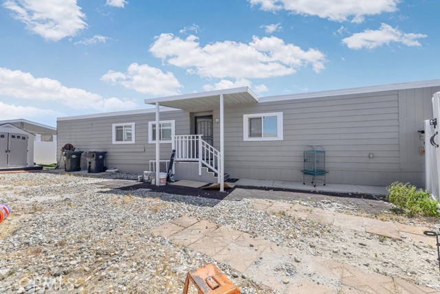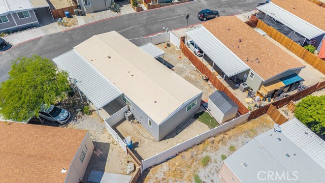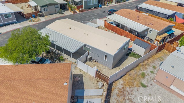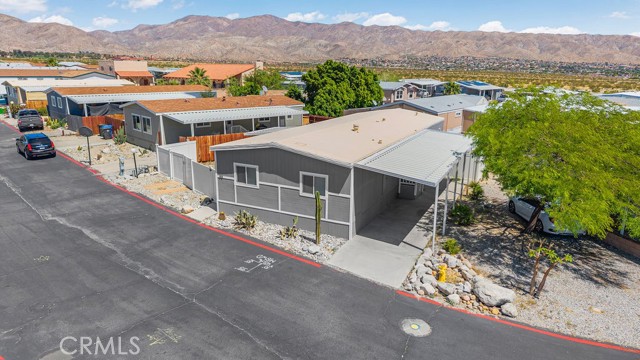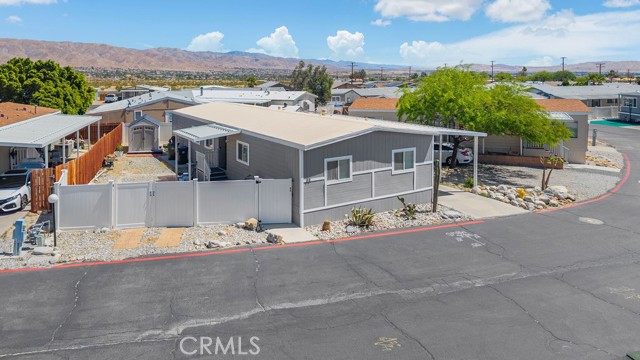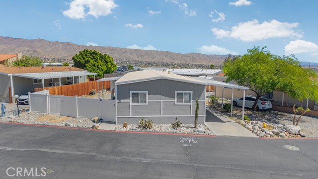 Welcome to the lowest priced home in the beautiful Palm View Estates with over 1,400 square feet. This double wide home offers 3Beds and 2 full baths with a pretty large lot that is rarely seen in mobile homes. This home has been recently painted and a new fence has been installed around the entire lot. Brand new windows and a new carport have been recently replaced, newer floors have been installed, and a storage shed that will stay with the home. The amplitude of the home is where the value of the home lies and proximity to popular destinations such as Palm Springs, Coachella, Joshua Tree National Park, and famous casinos make this home a retreating delight!