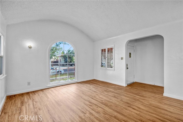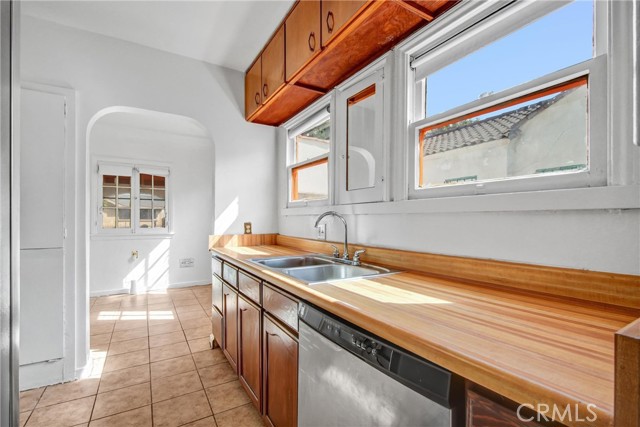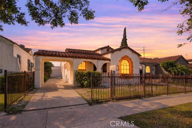 Charming Spanish Revival home with timeless character and great ADU potential. This 2-bedroom, 1-bath home offers 1,137 sq ft on a 5,097 sq ft lot with a detached garage and long driveway. Classic Spanish details include a clay tile roof, smooth stucco exterior, arched windows and entryways, and a covered front porch with carport, now freshly painted for a clean, updated look. Recent exterior improvements also include new stucco and paint on both the home and garage, along with updated roof underlayment. Inside, the home showcases its original charm with coved ceilings, multiple archways, and beautiful natural light, highlighted by a large arched picture window in the living room and original-style divided light windows. The layout features a formal entry, separate living room, and dining room with ceiling fan. The kitchen includes a cozy breakfast nook with a charming built-in cabinet, ample cabinetry, stainless steel appliances, and a commercial-grade stove. Both bedrooms are spacious, with one offering a walk-in closet. The bathroom features a soaking tub and separate walk-in shower. Additional features include an indoor laundry room with built-ins, fresh paint in the bathroom and laundry area, refurbished floor heater, new water heater, most newer windows, and a mix of luxury vinyl plank and tile flooring. The front and backyards are a blank canvas, ready for your own landscaping vision. The backyard offers plenty of space to expand or entertain, with a detached garage and long driveway ideal for ADU potential. Centrally located with easy access to freeways, parks, schools, medical centers, and a short drive to Downtown Los Angeles and surrounding dining and entertainment.