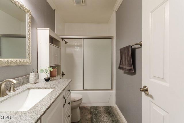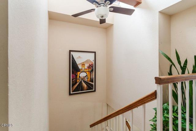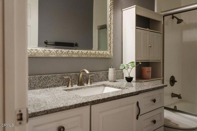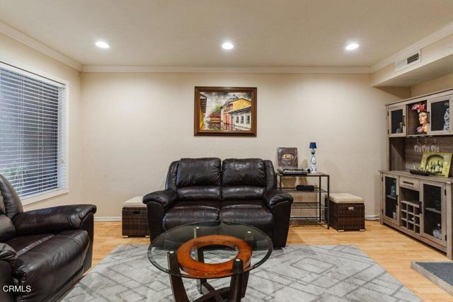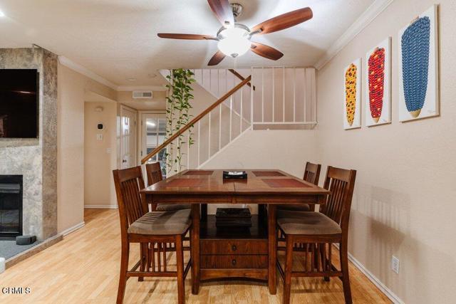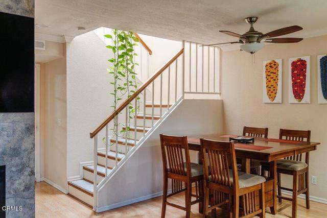 This 3 Bed, 2 1/2 Bath townhouse is a desirable end unit located in a very well-manicured complex with affordable HOA fees. The inviting living room features a striking floor-to-ceiling fireplace, sleek flooring, & recessed lighting while the large skylight showers the stairs & dining room with sunlight, creating a warm & welcoming ambiance. Classic crown moulding & reeded trim with retro rosette blocks add a splash of elegant tradition to a more modern floorplan. The kitchen shines with an extensive mosaic glass backsplash, & the stylish countertops play well with the modern shaker-style cabinetry. All bathrooms were tastefully done with tile flooring & granite countertops. The spacious primary bedroom boasts a generous walk-in closet, dedicated balcony, & a bathroom with a double vanity. Upstairs, in addition to the 3 bedrooms, there is a bonus space ideal for an office or craft room! The unit is complete with 2-car garage, in-unit laundry & communal access to an extensive lawn area, a sheltered spa & large swimming pool.
