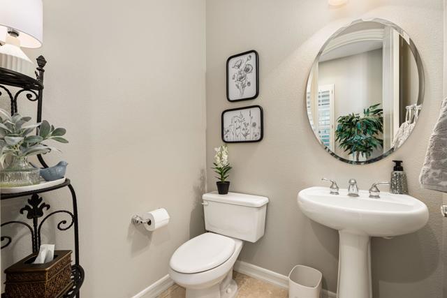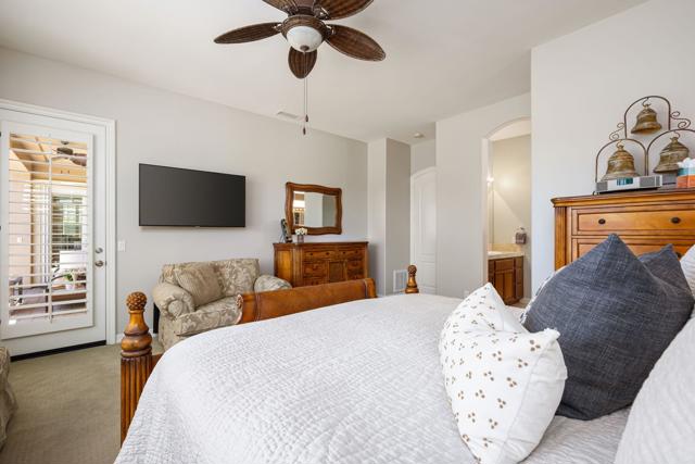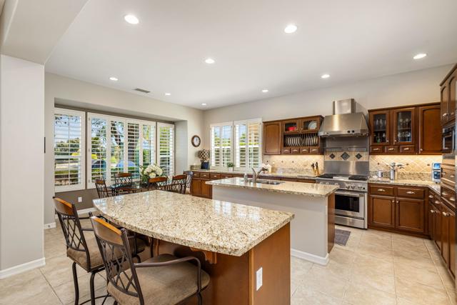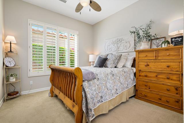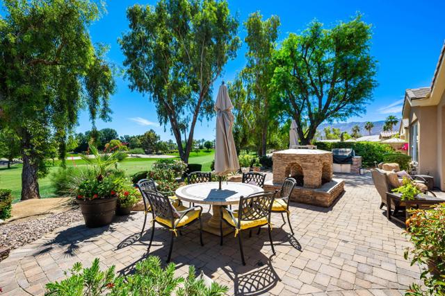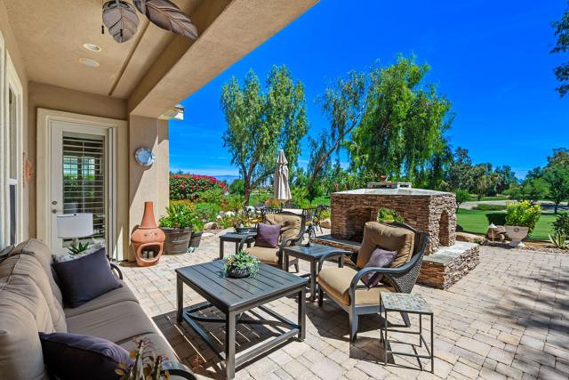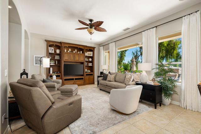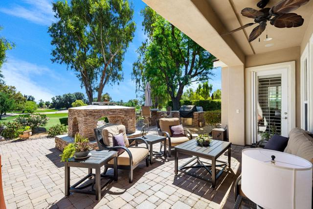 Welcome to this beautifully upgraded Oreas floorplan ideally positioned on the 1st fairway in Trilogy at La Quinta, located just a few doors from the Santa Rosa Clubhouse and offering an exceptional combination of location, privacy, and stunning golf course and mountain views. This thoughtfully designed residence features 2 bedrooms, 2.5 baths plus a den/office and a formal dining room that can easily be converted into a third bedroom, providing flexible living options to suit your needs. A private courtyard entry leads into a light-filled interior with tile flooring, plantation shutters throughout, and an open-concept layout ideal for both everyday living and entertaining. The great room showcases custom built-in cabinetry and large windows that seamlessly connect indoor and outdoor living, while the chef's kitchen is beautifully appointed with granite countertops, rich cabinetry, stainless steel appliances, double ovens, a large center island, and a separate prep island with wine refrigeration--perfect for hosting. The adjacent dining area is surrounded by windows, bringing in abundant natural light and views of the lush backyard. The spacious primary suite offers a comfortable retreat with a sitting area, direct access to the patio, and an ensuite bath featuring dual vanities, a walk-in shower, and an oversized walk-in closet with custom built-ins. Guest accommodations are privately situated, and the den/office provides an ideal space for remote work or hobbies. Additional highlights include a well-equipped laundry room with ample cabinetry and an oversized garage with built-in storage and workspace. Step outside to a truly exceptional outdoor living space featuring an expansive paver patio, covered seating area, built-in fireplace, BBQ station, and multiple entertaining areas, all surrounded by professionally landscaped grounds with vibrant color and mature greenery, perfectly positioned to capture sweeping views of the 1st fairway, driving range, and surrounding mountains. Located close to golf, fitness, tennis, pickleball, dining, and the vibrant lifestyle that defines Trilogy at La Quinta, this home represents a rare opportunity to own one of the community's premier golf course properties.