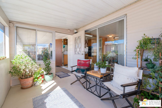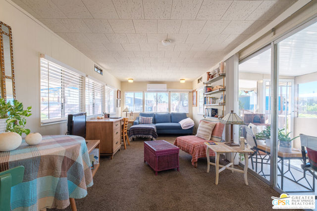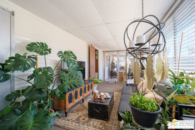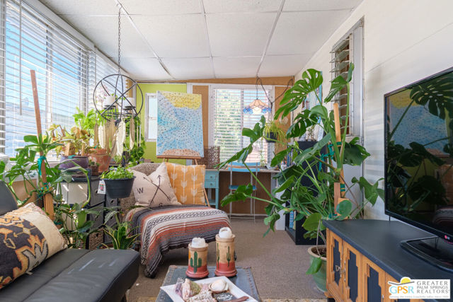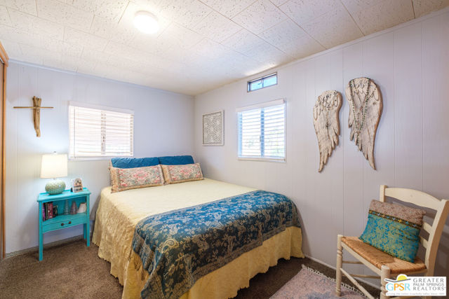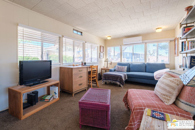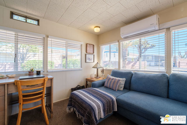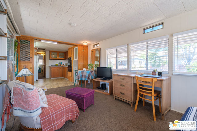 Welcome to Your High Desert Retreat! Step into a vintage gem that beautifully marries mid-century charm with an artsy, zen vibe, all within a welcoming 55+ community. This one-bedroom Vagabond home is a haven for creatives and dreamers alike, basking in diffused light that fills every corner with warmth and inspiration. The bedroom boasts ample built-in closets and drawers, maximizing storage while preserving the vintage aesthetic. The kitchen features era-appropriate cabinetry paired with updated appliances, ensuring you can whip up your favorite avocado toast with ease! Delight in original touches like the whimsical over-the-sink light and retro wall clock that add character and nostalgia. A sunroom enhances the allure of this home, currently serving as a cozy family room and artist's studio - a perfect sanctuary for creativity! The front entry lanai, complete with a screened-in porch, welcomes you with newer steps and a charming landing that leads into your personal oasis. Nestled on a corner lot, this impeccably maintained home features a spacious outdoor area complete with two storage sheds (one attached to the carport and has laundry hookups!) With convenient access to Yucca Valley shopping, Pioneertown and Joshua Tree, plus just a short drive down the hill to the vibrant scene of greater Palm Springs, this retreat is ideal for both full-time living and seasonal escapes. Hiking and golf are convenently nearby. Embrace the desert lifestylewhere mid-century elegance meets artistic spirit, all in a friendly 55+ community!