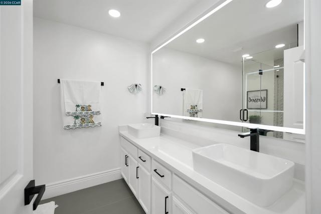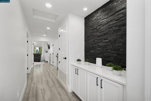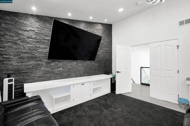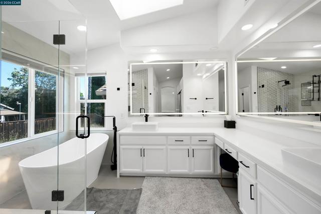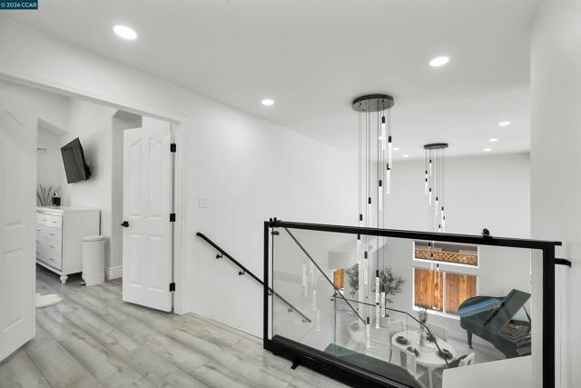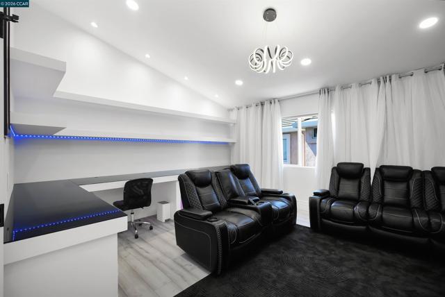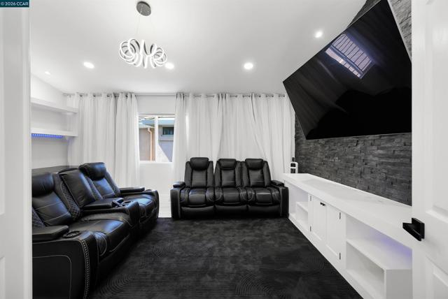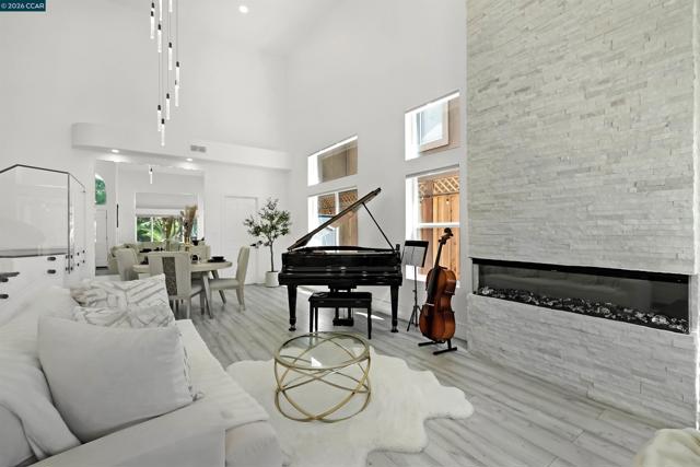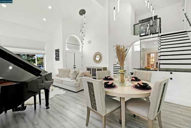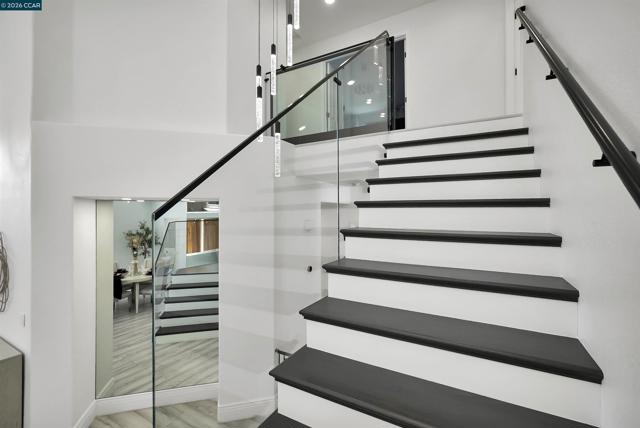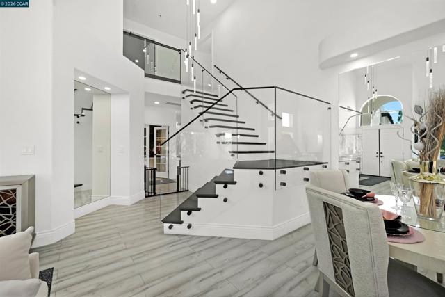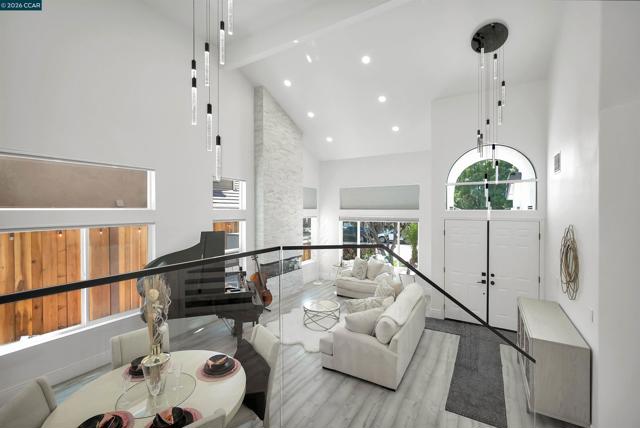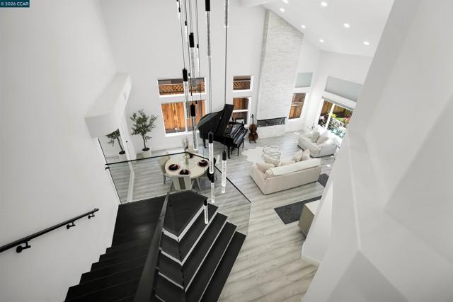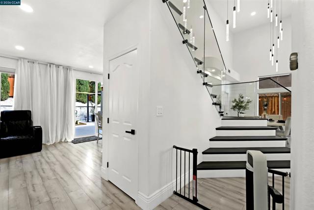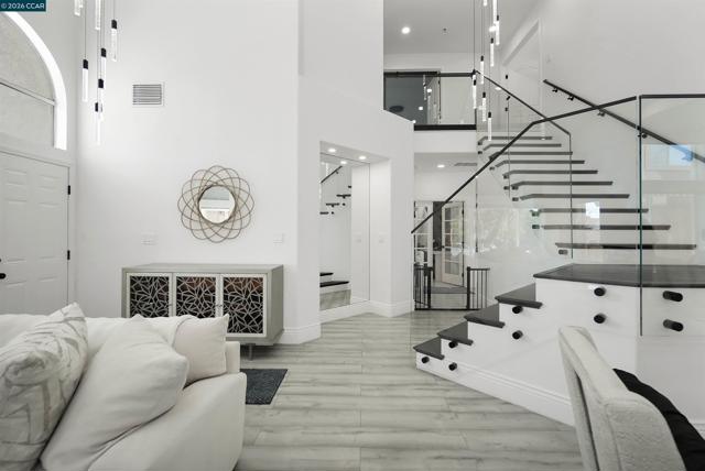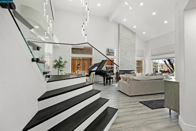 Welcome to a home that makes an unforgettable first impression. Showcasing striking curb appeal, soaring ceilings, and a beautifully remodeled interior, this residence blends modern elegance with everyday comfort. Natural light pours into the impressive main living area, highlighted by a stunning fireplace, statement glass staircase, and upscale finishes throughout. The updated kitchen offers a clean, timeless design with sleek cabinetry, generous prep space, and seamless flow for both daily living and entertaining. Upstairs, the spacious primary suite feels like a true retreat, while the remodeled bathrooms and versatile bonus/media room add comfort and flexibility. Step outside to a thoughtfully redesigned backyard where towering trees create a striking natural backdrop and an added sense of privacy. Enhanced with a beautifully updated retaining wall, expansive concrete hardscape, and a spa, the outdoor space is both polished and functional — ideal for entertaining, unwinding, and enjoying the setting year-round. Stylish, inviting, and thoughtfully upgraded, this is the kind of home that truly stands apart.