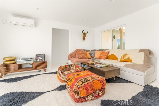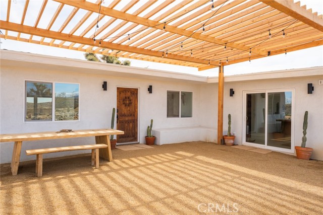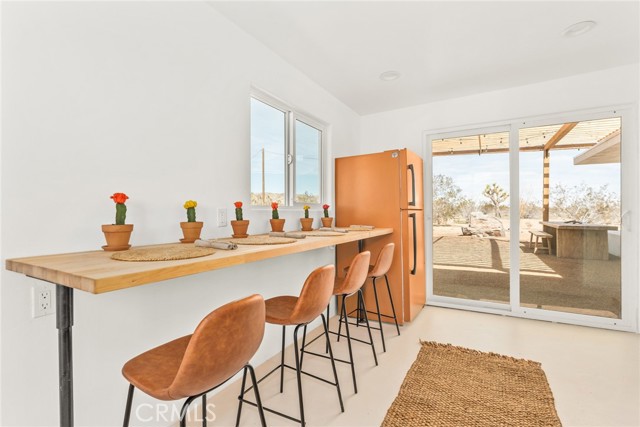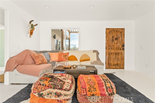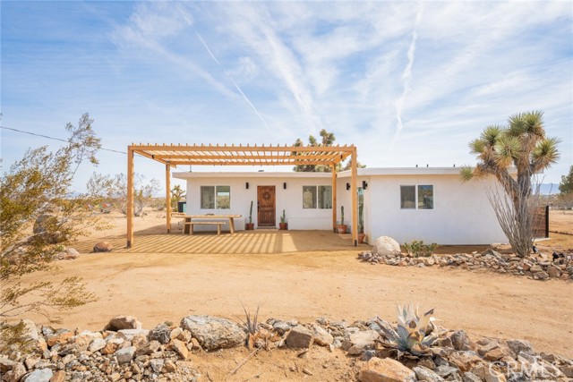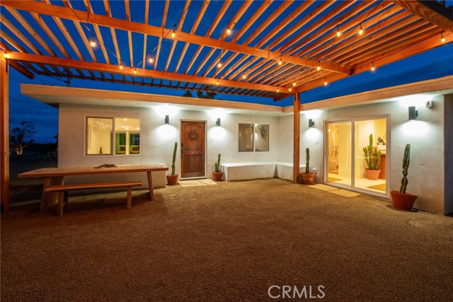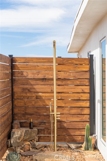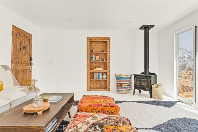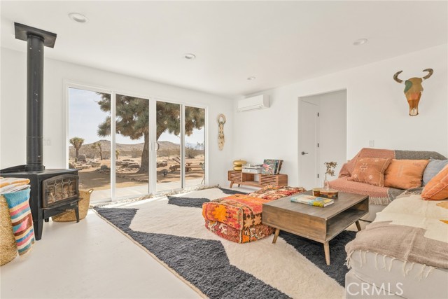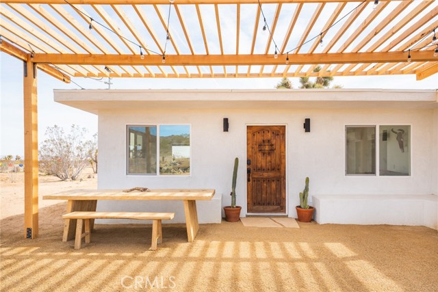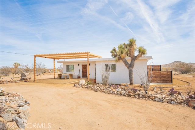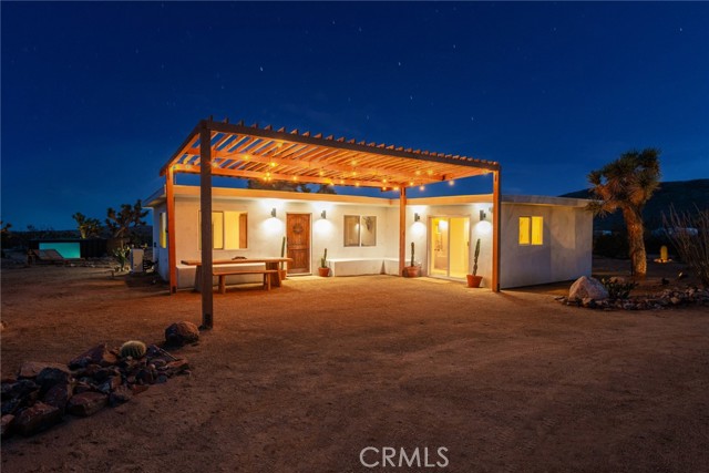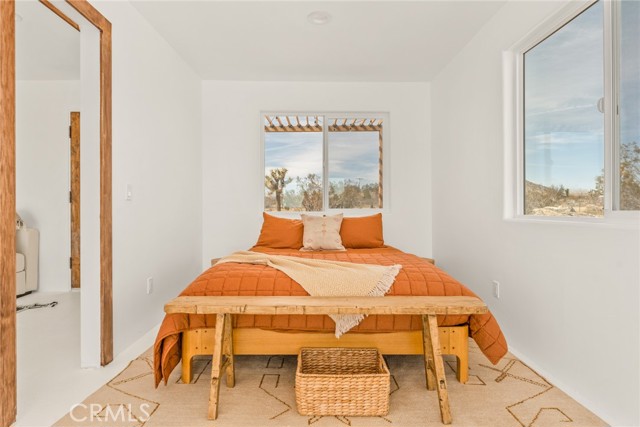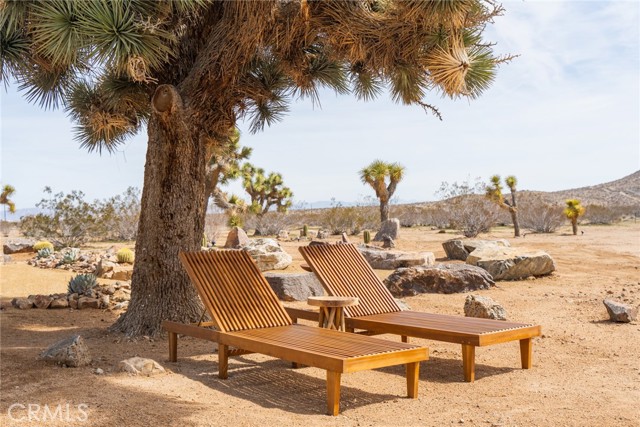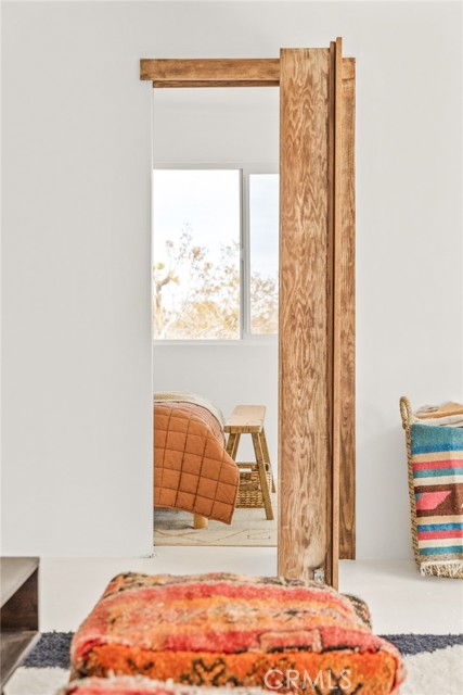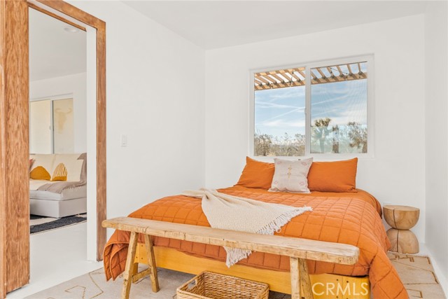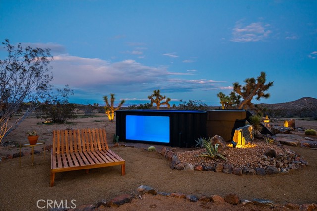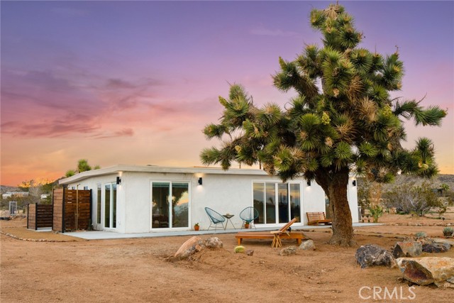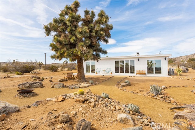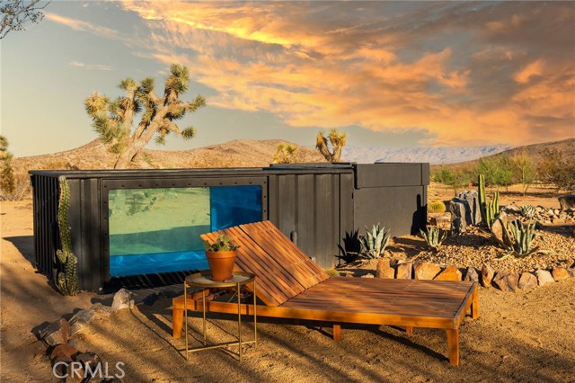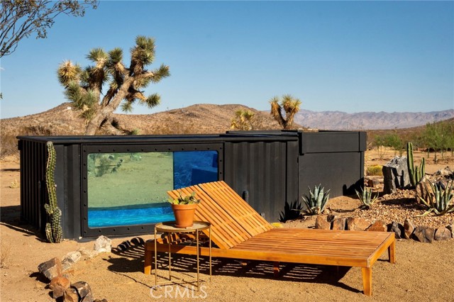 Welcome to SunDream, Yucca Valley. Set on five acres of open desert, SunDream captures over 100 miles of uninterrupted panoramic views. A glass pool, oriented east to west, is positioned to catch the shifting light at both sunrise and sunset. From here, snow-capped peaks in Big Bear rise to the north, while the High Desert stretches endlessly below — nothing between you and the horizon but Joshua trees that have stood for over a century. The home, offered fully furnished, is intentional in both design and experience: two bedrooms, one bath, with every room oriented toward the surrounding landscape. Five custom sliding glass openings dissolve the boundary between indoors and out, allowing the desert to become part of the living space. The living room centers around a wood-burning fireplace and a deep-seat Lovesac “Cloud” sectional, offering both comfort and additional sleeping accommodations for a third guest. A hidden secondary bedroom is revealed behind a bookshelf door, furnished with a Casper queen bed and framed views of the eastern mountain range. The primary suite features a king-sized Casper bed and opens directly to an outdoor, eco-conscious desert shower finished with flagstone underfoot and biodegradable soaps, designed so water nourishes the surrounding succulents. The bathroom is a statement of its own — pink tile, warm gold fixtures, a soaking tub, and dual showers — creating a spa-like retreat to unwind after a day exploring the desert. The front patio and outdoor dining area, accessible from both the kitchen and living room, are immersed in a stillness so complete you’ll notice even the subtle shift of the wind. Don’t miss this opportunity to own this beautiful desert sanctuary!