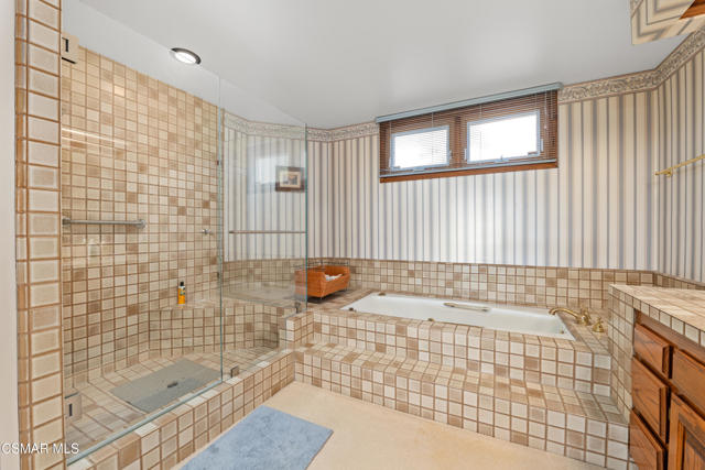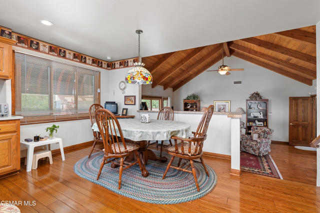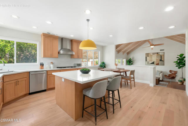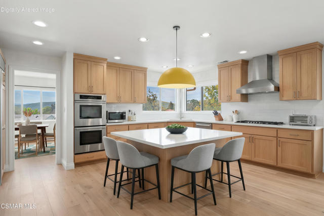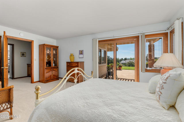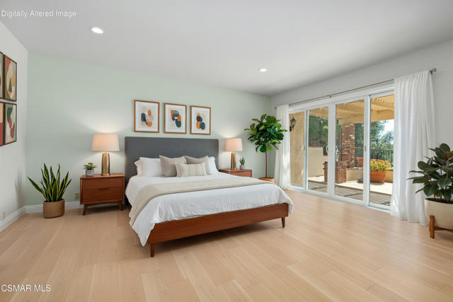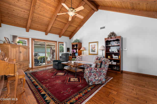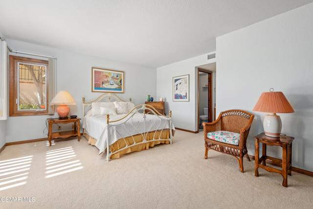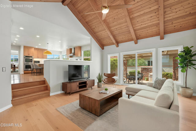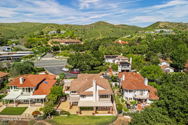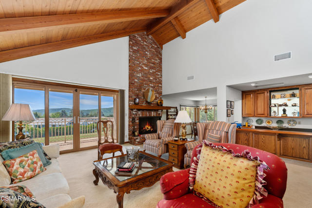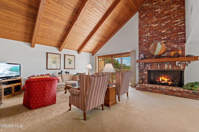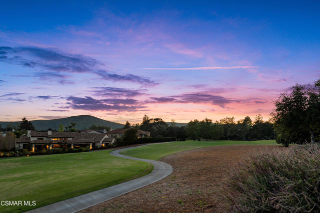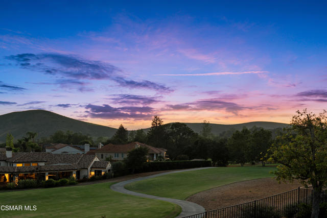 Set along picturesque Rayburn Street in the highly sought-after North Ranch community, this home is perched overlooking the 6th fairway of the North Ranch Golf Course, capturing sweeping views of majestic oak trees, lush fairways, and the Santa Monica Mountains. Dramatic wood-beam ceilings infuse the home with character and warmth, while expansive windows and sliding glass doors invite in natural light and frame the stunning vistas beyond. The family and dining rooms are anchored by a striking two-sided brick fireplace and wet bar, ideal for entertaining or relaxed everyday living. Enjoy morning coffee or an evening sunset from the viewing deck and watch as the changing colors dance along the nature surrounding you. The spacious kitchen offers ample cabinetry, generous prep space, newer appliances, and a cozy breakfast nook. A main-level bedroom with adjacent full bath + space to convert to a 4 bedroom provides flexibility. Privately situated on the lower level, the Primary Suite includes a fireplace, lounge area, walk-in closet, veranda access with golf course views, and a spacious bath with dual vanities and soaking tub. A secondary bedroom with ensuite bath and walk-in closet completes the lower level. Multiple patios and a low maintenance yard offer versatile spaces for outdoor entertainment, dining, or quiet relaxation while soaking in unforgettable views. The peaceful sounds of birds and evening crickets fill the breeze as you settle into the outdoor spa, all while enjoying sunset views over the golf course and mountains. Additional highlights include a 3-car garage, laundry room with utility sink, and dual-pane windows. Every moment feels like a vacation when you're here, yet you're moments away from exceptional restaurants, shopping, freeway access, outdoor activities, and the North Ranch Country Club.