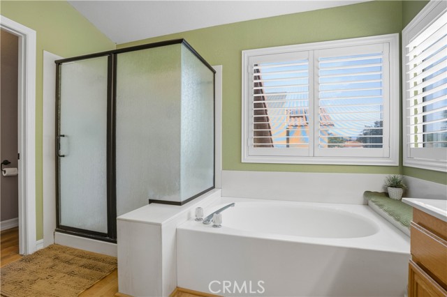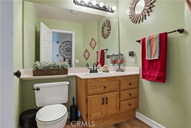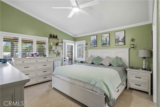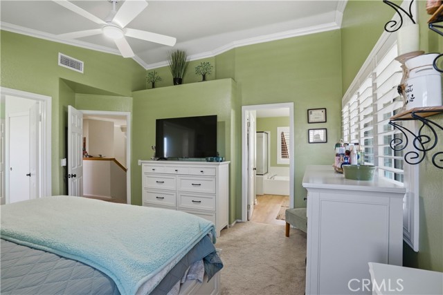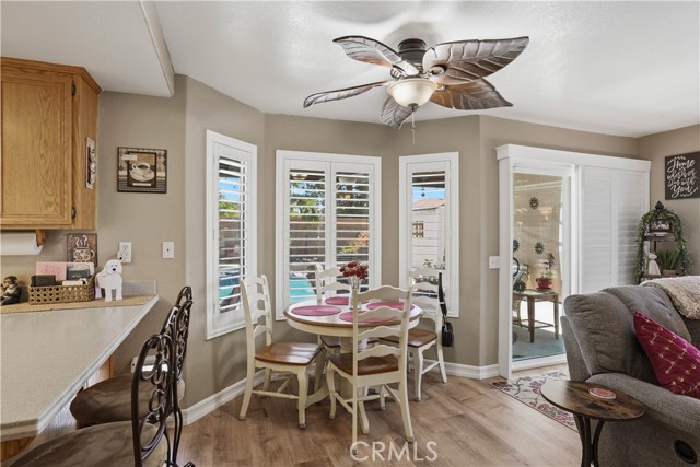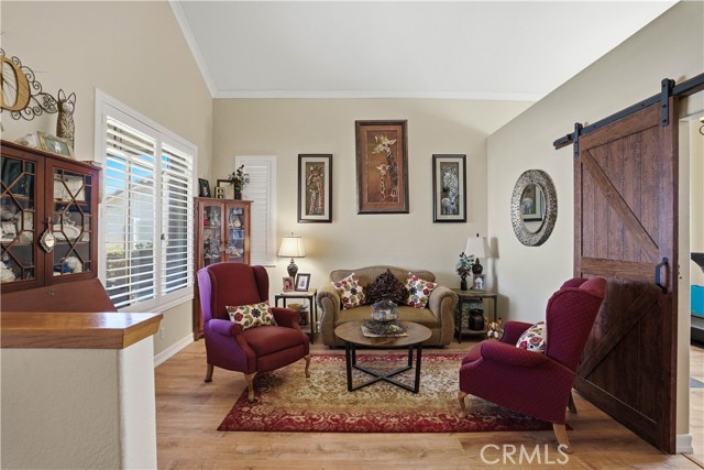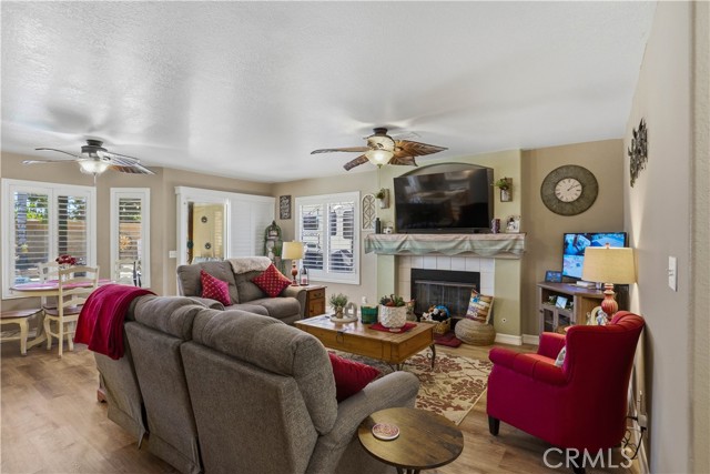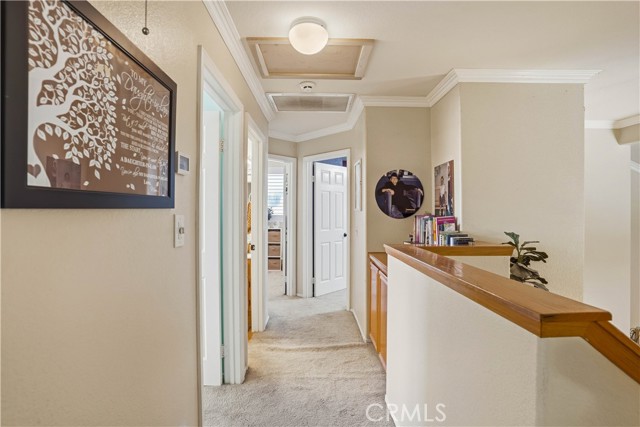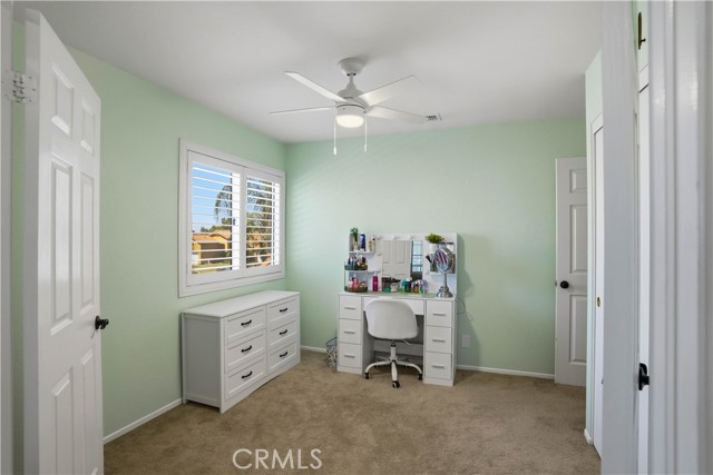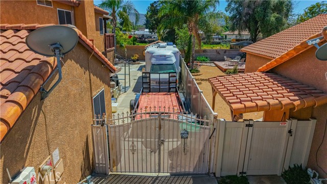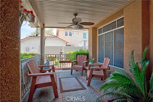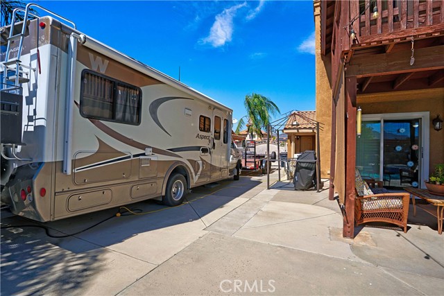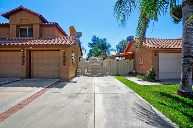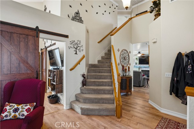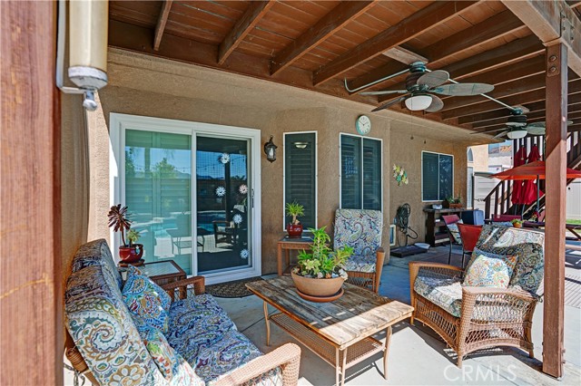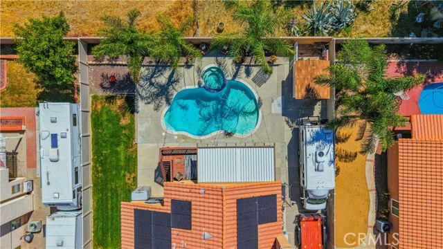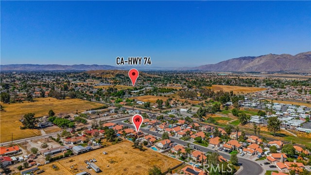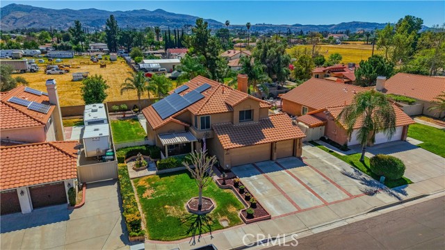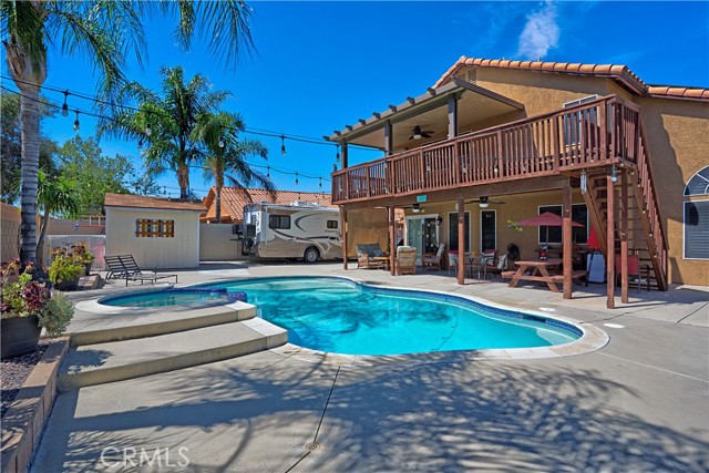 Two Story Hemet Pool Home offering 4 bedrooms, 2.5 bathrooms plus a 3 car garage. Featuring high ceilings as you enter with crown molding, all-new LVP flooring and baseboards complemented by plantation shutters throughout. The spacious layout includes a gas fireplace, downstairs half bath, and a recently updated HVAC system (2022) along with a whole house fan for energy efficiency. Upstairs offers a generous primary suite with a connection to one of the guest bedrooms, plus private access to an upper deck patio with alumawood cover. The primary bathroom features a walk-in closet, separate tub and shower, and dual functionality for comfort and space. All guest bedrooms upstairs include ceiling fans for added convenience. Step outside to a highly private backyard complete with a pool and spa, patio covers, a shed, concrete yard, grass area, sun-blocking screens, vinyl fencing and brick walls. Desirable RV parking pull-through gate access and parking for more along the side. Additional highlights include solar, low taxes, no HOA, and a prime location near shopping, schools, Idyllwild, and Palm Springs.