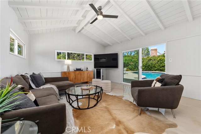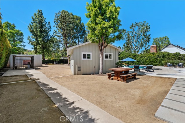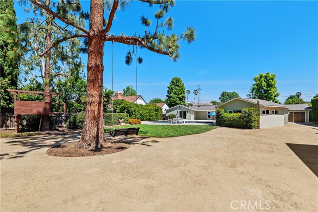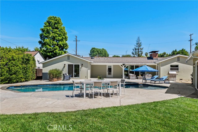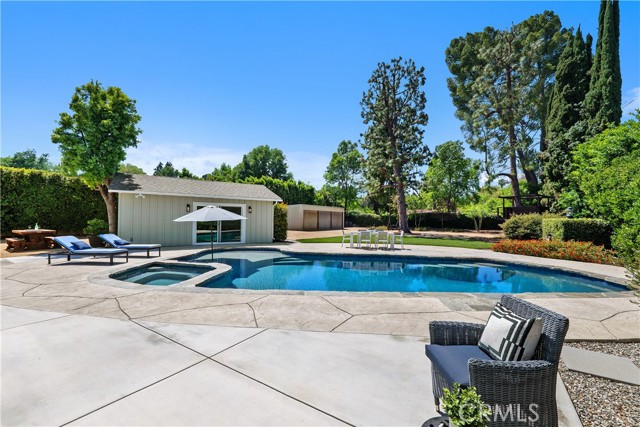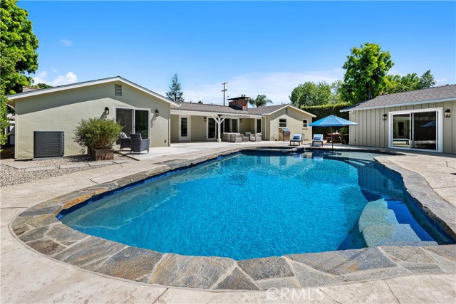 Welcome to a truly rare offering in Los Angeles—where expansive space, privacy, and limitless potential converge on an exceptional flat half-acre lot. Located in the coveted College Acres neighborhood in Woodland Hills. This impressive 100' x 220' property features double electric gates, a circular driveway, and convenient rear yard access, creating both presence and privacy. The beautifully maintained main residence exudes classic ranch-style curb appeal and offers approximately 1,924 square feet of thoughtfully designed living space with three bedrooms and three bathrooms. Complementing the home is an additional pool house/office, approximately 350 of living square feet, easily convertible into an ADU for added flexibility or income potential. A custom oversized front door welcomes you into a spacious living room highlighted by a fireplace, soaring cathedral wood ceilings, and rich wood flooring. The updated kitchen boasts granite countertops and a breakfast bar that opens seamlessly to a stunning dining room featuring a dramatic floor-to-ceiling brick fireplace, built-in grill, and charming window seat—perfect for memorable gatherings. The primary suite is a serene retreat with dual closets featuring built-ins, a skylight that fills the room with natural light, and a beautifully renovated bathroom complete with double sinks, quartz countertops, and an oversized shower. Wide-plank oak floors, newer doors and windows, and sliding glass doors throughout the home further enhance the bright, airy atmosphere. Step outside to a covered porch and enjoy quintessential California living. The backyard oasis features a PebbleTec pool with a Baja bench and built-in spa, ideal for both relaxing weekends and entertaining under the sun. A large grassy yard, whimsical treehouse, and metal three-car garage add even more appeal. What truly sets this property apart is its remarkable development potential. This is a rare opportunity to expand the existing home, build a custom estate, create a multi-generational compound, or develop multiple residences. Whether you envision a forever family home, a private estate with room to grow, or an exceptional investment opportunity, this property offers unmatched versatility in one of Los Angeles’ most desirable areas. Cherished by only two owners over the last 76 years, opportunities like this are exceedingly rare. Live in it, expand it, or build something extraordinary—this is a once-in-a-generation offering.