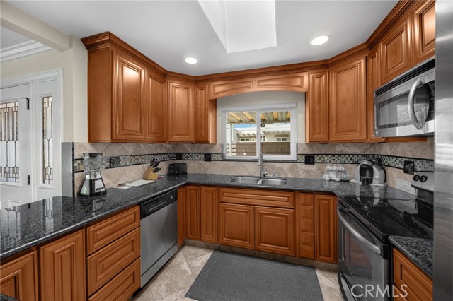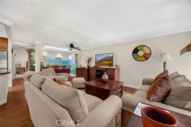 BEAUTIFUL, SINGLE STORY HOME in the highly desirable 55+ community of Laguna Woods Village. This 2-bedroom, 2-bath home offers convenient single-level living with no interior or exterior steps. This home features a bright and open floorplan with 2 bedrooms, 2 bathrooms with 1,100 square feet. You are welcomed at the entry into that large living room that includes crown molding, large windows for natural lighting and is attached to the dining room which is great for entertaining. The beautifully designed kitchen features beautiful cabinetry for storage, stainless steel appliances, electric range with overhead microwave, recessed lighting, and overlooks into the living room/dining room. The Primary bedroom suite features a large bedroom area and has direct access to the private patio, a beautiful ensuite bathroom that includes a double sink vanity and tub/shower combo. Second generously sized bedroom includes plenty of closet room and skylight. Large, private patio at the entry includes cover patio area and closet for storage. Additional features of the property include a carport and Inside laundry for stackable washer/dryer. Laguna Woods Village offers a 27-hole professional Gold Course, 7 Clubhouses, 5 pools, 3 fitness centers, Multiple sport courts including pickleball, bocce ball, and tennis, Performing Arts Center, Library, Equestrian Center, 2 garden centers and so much more! Close to shopping, entertainment, restaurants and has easy freeway access. This home is one you won’t want to miss!