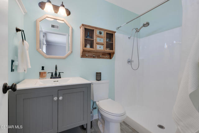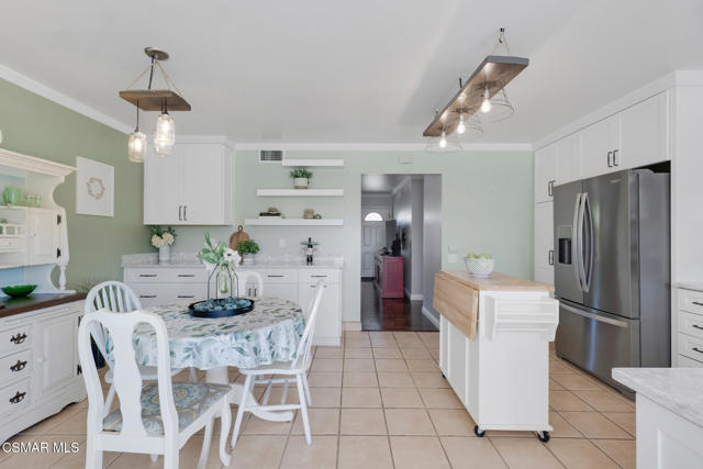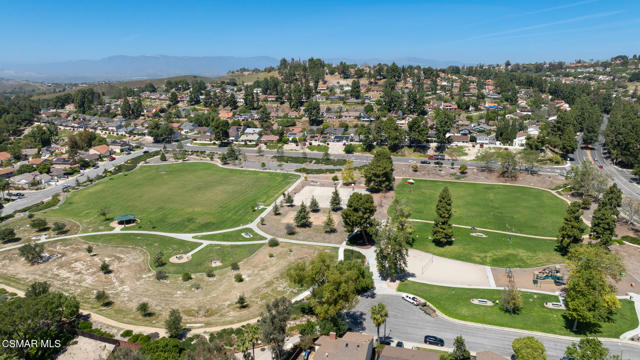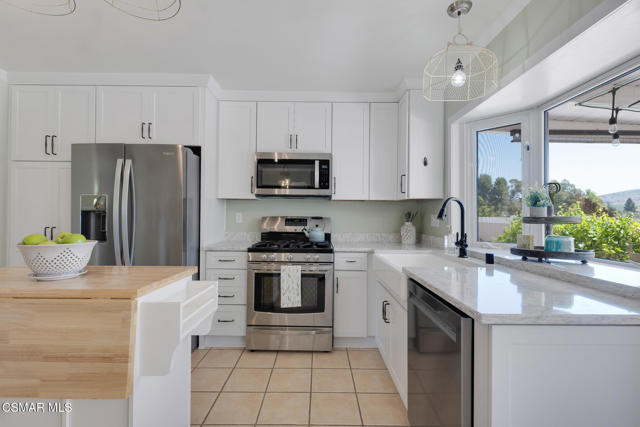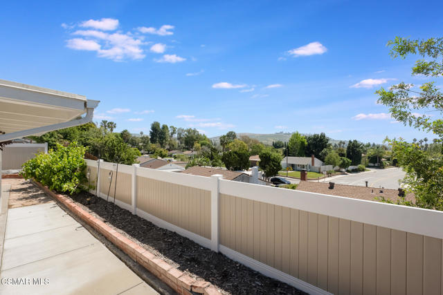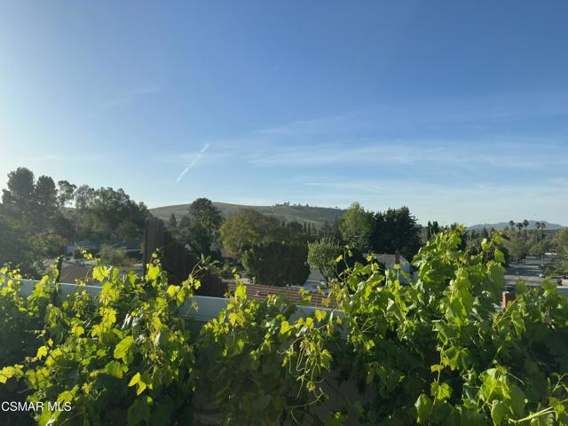 Lovely, upgraded cul-de-sac home with dark hardwood American Hickory flooring in the living room, hallway closets and bedrooms. Remodeled open kitchen with ceramic tile flooring, butcher block island, quartz counters, stainless steel appliances, solid panel cabinets, solid wood tongue & grove soft closing drawers, large solid wood tongue and groove pullout drawers, farmhouse sink adjacent to dining area and double glass slider leading to the lighted outdoor covered patio & backyard featuring an expansive, panoramic 180 degree view of the Conejo Valley and mountain tops. Dual pane windows throughout, Crown Moldings throughout & 4'' baseboards. Primary en-suite bedroom with renovated primary bath featuring ceramic wood plank tile flooring, newer vanity and sink. Remodeled full bath with tile floor and shower over tub. Dual pane windows throughout, ceiling fans in every bedroom. Newer 3 ply shingle roof, AC & Furnace. Great location with walking trails and nearby park, close to schools, shopping, restaurants and freeways,