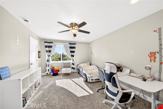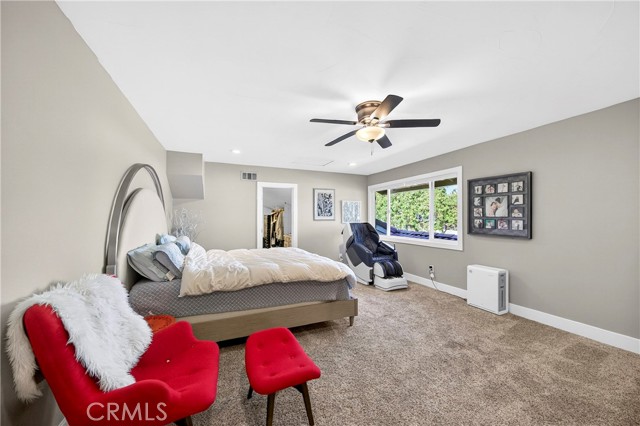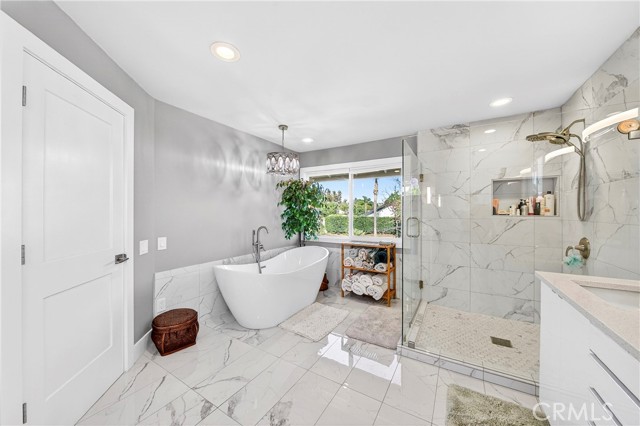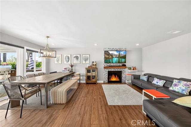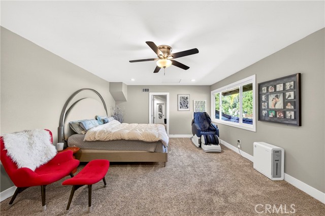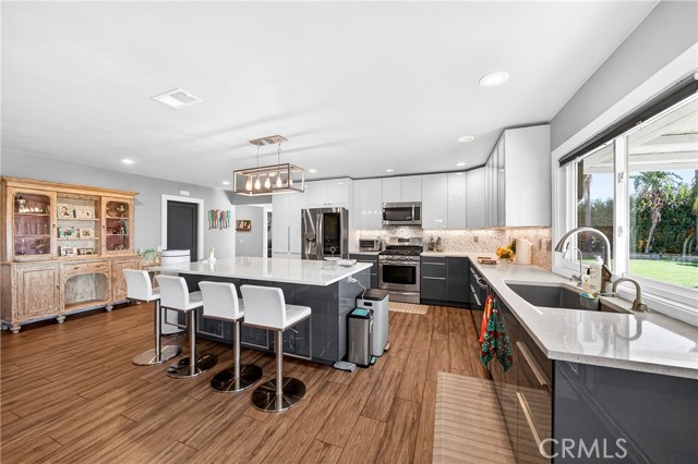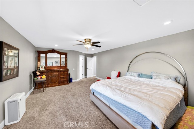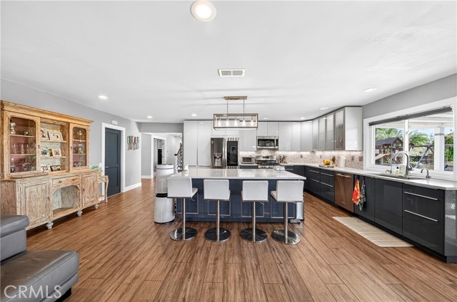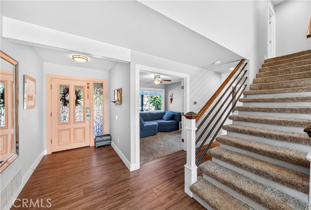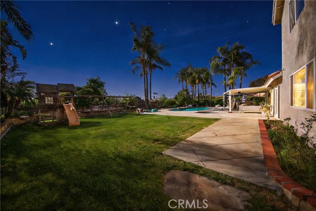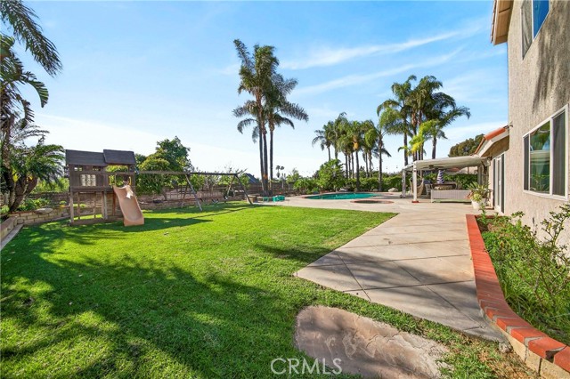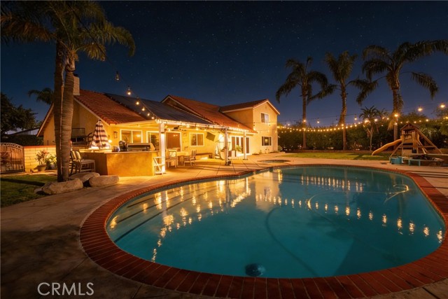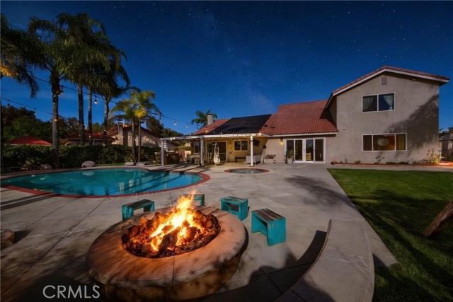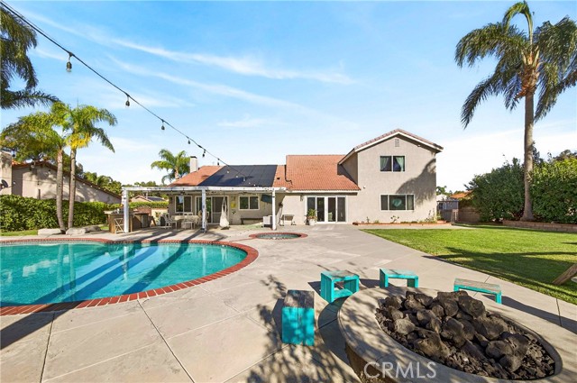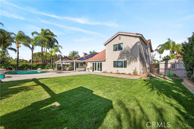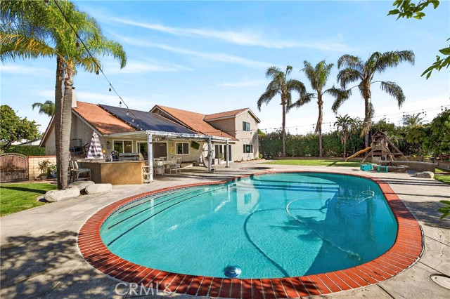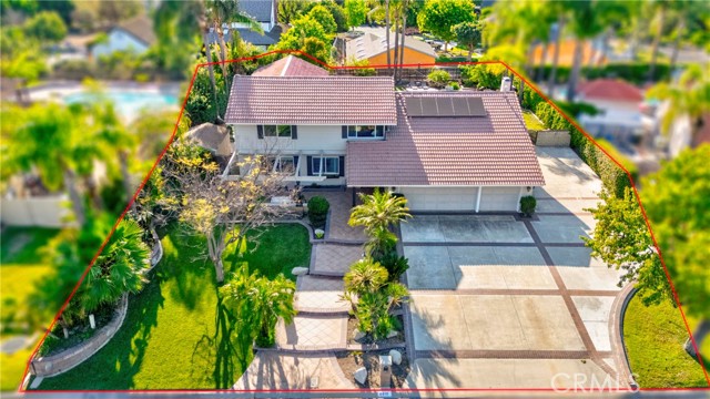 Wow! What more could you want in this exquisitely remodeled two-story sanctuary situated at the end of a quiet cul-de-sac on a massive lot with peek-a-boo views and a FULLY PAID-OFF SOLAR SYSTEM for ultimate energy savings. This versatile floor plan offers 5 spacious bedrooms and 4 full baths, perfectly distributed with three bedrooms on the main floor (including one en-suite) and two additional en-suite bedrooms upstairs. As you enter from the front porch, you are greeted by sleek porcelain tile floors, wood plank ceilings with recessed lighting, and smooth-surface walls. The open-concept gourmet kitchen is a chef’s dream, featuring sleek cabinetry with incredible storage, a massive center island, elegant quartz countertops, and premium appliances. The family room, anchored by a newly refaced fireplace, flows effortlessly through sliding glass doors to a resort-style backyard. Outside, enjoy a sparkling pool and spa, a built-in BBQ island, a large grass area, and a fruit-bearing avocado tree, all beautifully illuminated by professional string lighting. For those with toys, there is a 3-car garage and massive RV parking that fits a 45ft coach. The upstairs is highlighted by a luxurious primary suite with a standalone tub, walk-in shower with Satori porcelain tile, and an expansive walk-in closet. With fresh paint, dual-pane windows, and direct gate access to local trails, this home in the award-winning Placentia-Yorba Linda Unified School District is the perfect blend of luxury, convenience, and modern efficiency.