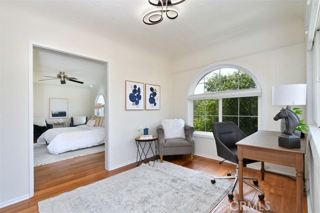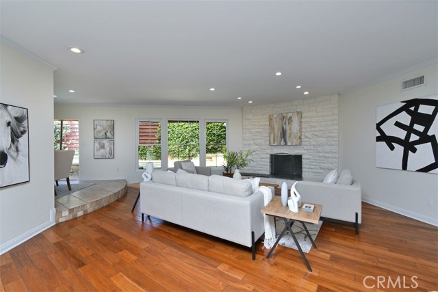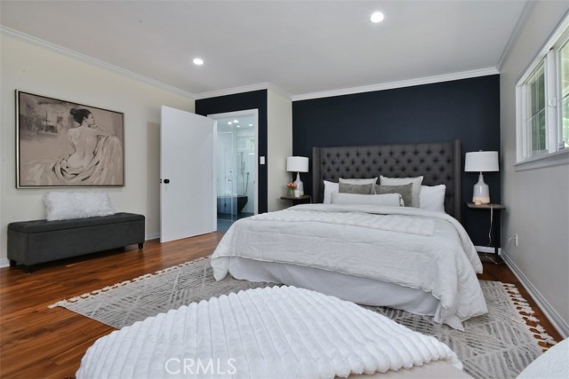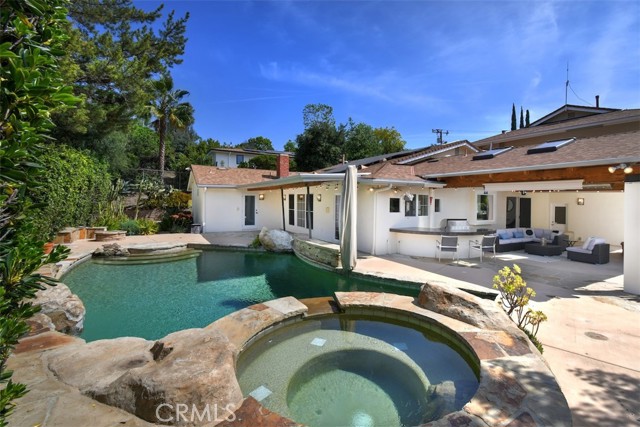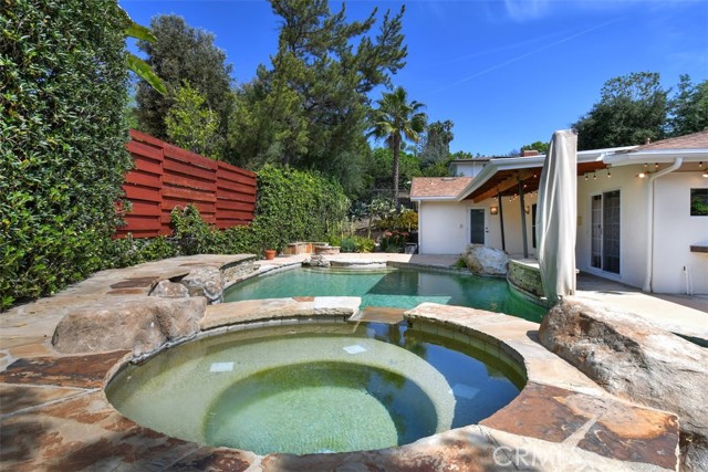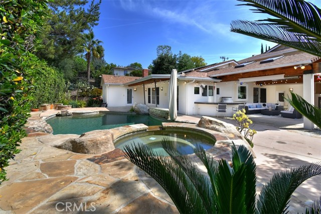 Located in the coveted Mulwood neighborhood of Calabasas and within the award-winning Las Virgenes School District, this beautifully customized four-bedroom, four-bath residence offers the perfect blend of sophistication, comfort, and modern convenience in a versatile split primary layout with a first floor ensuite and two auxiliary bedrooms ;an upper level primary suite addition and dedicated office .A welcoming formal foyer introduces the home’s spacious open-concept design, featuring a warm and inviting living area with a cozy fireplace. The home flows seamlessly into a formal dining room and an expansive family room with custom built-ins, creating ideal spaces for both everyday living and elegant entertaining. The updated chef’s kitchen features quality finishes and a sunny breakfast area, opening naturally to the main living spaces.Step outside to your own private resort-style backyard retreat. The grounds showcase a sparkling PebbleTec pool ,spa and waterfall ,a charming outdoor covered living space with fireplace, and barbeque area creating an exceptional setting for year-round entertaining and relaxed California living.A tranquil side yard offers a unique garden setting with sculptural cactus landscaping, passion fruit , and grapevines, providing both beauty and serenity.Modern smart-home amenities enhance everyday living, including app-controlled lighting, Aqualink pool and spa management, and MyQ garage access for ultimate convenience.