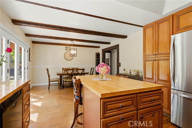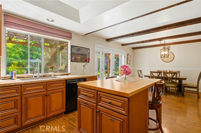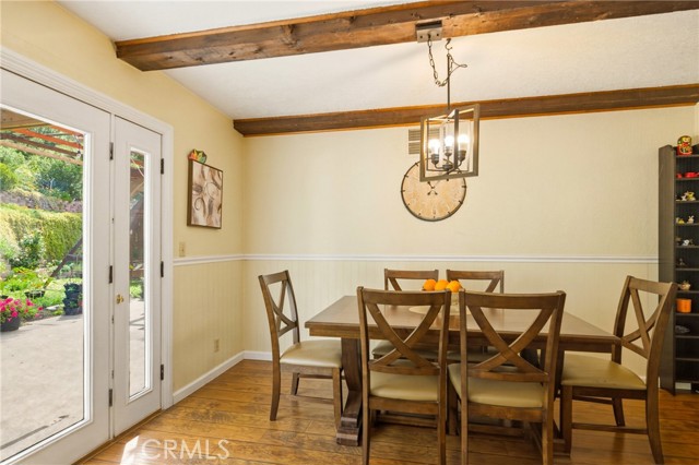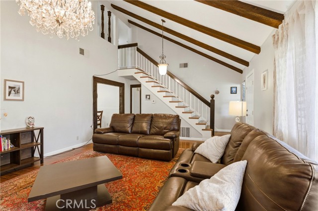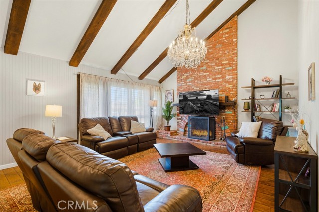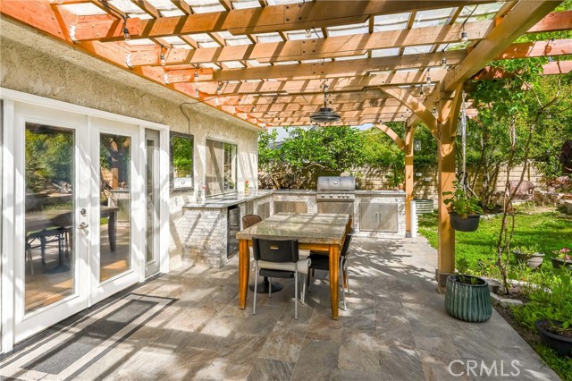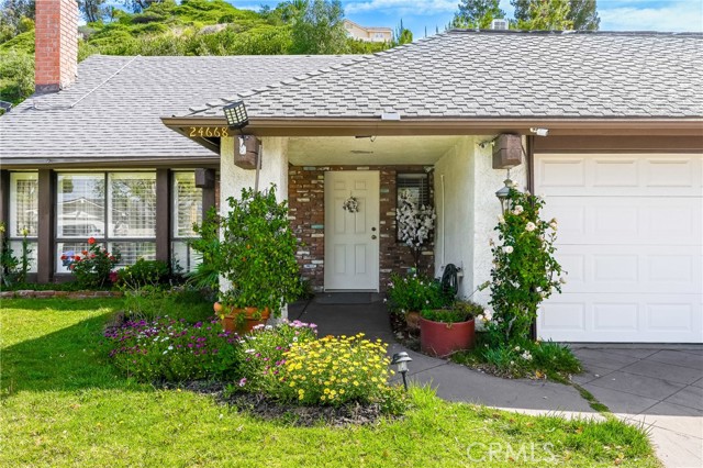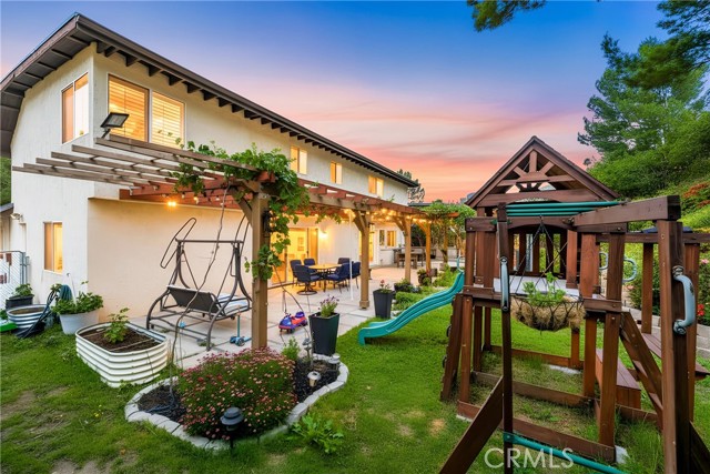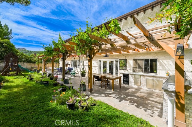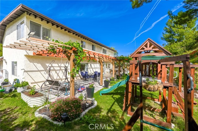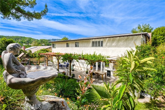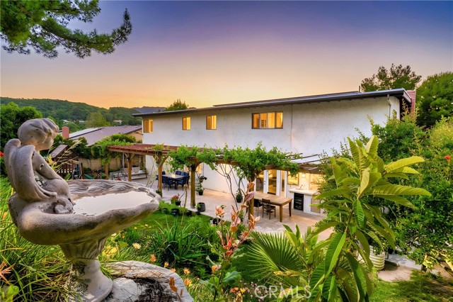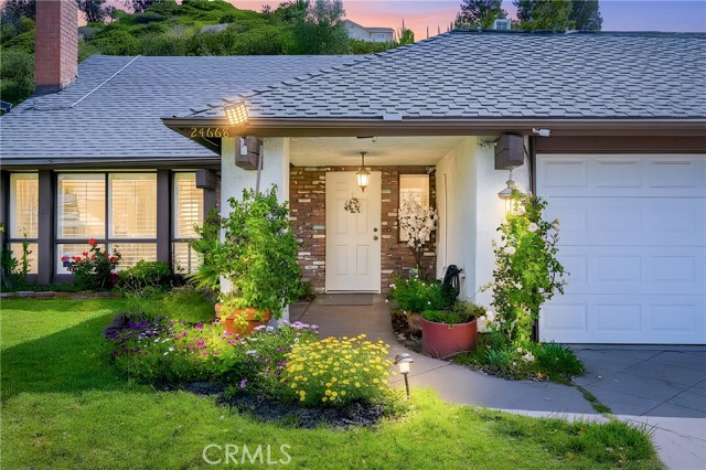 This beautifully maintained home in the heart of Happy Valley, one of Newhall’s most sought-after neighborhoods, perfectly blends architectural character with modern efficiency. The expansive living room makes a grand first impression with open-beam ceilings, a classic brick fireplace, and rich wood flooring. Culinary enthusiasts will love the remodeled chef’s kitchen, featuring granite counters, custom cabinetry, and a versatile butcher-block island/breakfast bar. Seamless indoor-outdoor living is invited through French doors leading to a nature lover’s paradise. The peaceful, private backyard features a lush garden filled with vibrant flowers and fruit trees. Entertain in style at the dedicated barbecue area, tucked under a stunning custom pergola draped in mature grapevines, providing the perfect canopy for alfresco dining and evening relaxation. The versatile floor plan continues inside with a convenient downstairs guest wing (bedroom and den), featuring a custom Murphy bed and bookshelf unit. Upstairs, find two spacious secondary bedrooms and a primary retreat boasting "his & hers" walk-in closets and a dedicated sitting area. Owned Solar, new 200A electrical panel with EV charger, copper plumbing throughout, and updated HVAC systems, and a new tankless water heater. Complete with a 3-car garage featuring a workshop/office and sink (and a vibrant, custom art mural!), all located just minutes from the 5 freeway at Calgrove Blvd. NO Mello Roos and NO HOA.
