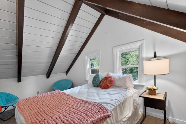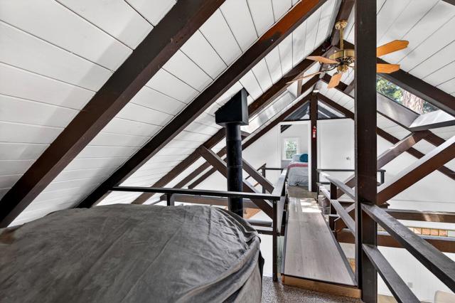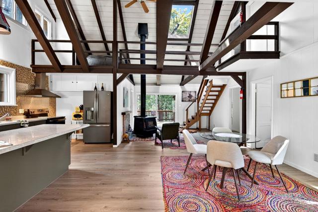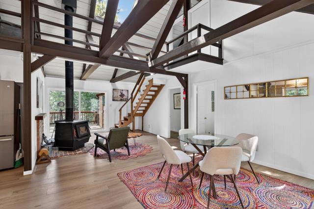 Originally built in 1963, this mountain cabin showcases the volume and character that define Idyllwild living. Vaulted ceilings, exposed beams, and wood-burning stoves create a warm, open interior with strong architectural appeal. New dual pane windows and doors bring in natural light and frame the surrounding trees, while the open living, dining, and kitchen layout flows easily for both everyday living and entertaining. The main level offers two bedrooms and two bathrooms. Upstairs, a private loft bedroom is connected by a bridge to a separate elevated nook, ideal for a reading area, workspace, or quiet retreat overlooking the living space below. Additional bonus areas provide flexibility for a variety of uses. A large elevated deck extends into the trees, creating a private outdoor setting. Set on a 0.41-acre cul-de-sac lot, the property offers a natural landscape with a strong sense of privacy. Furnishings are negotiable for a turnkey option.