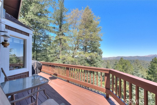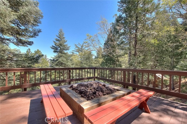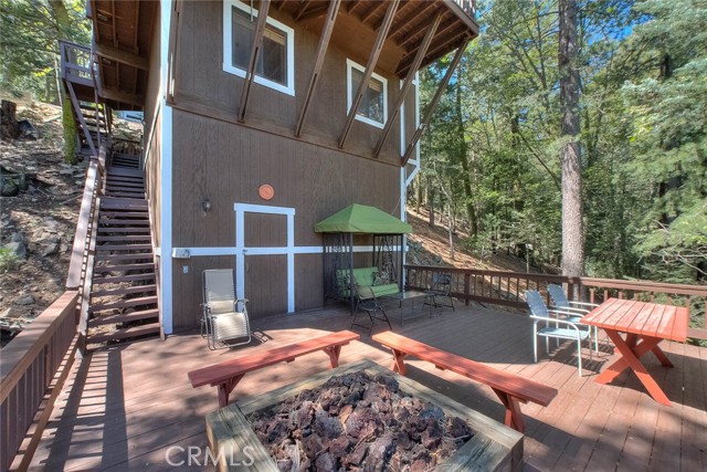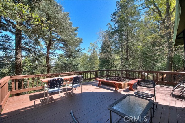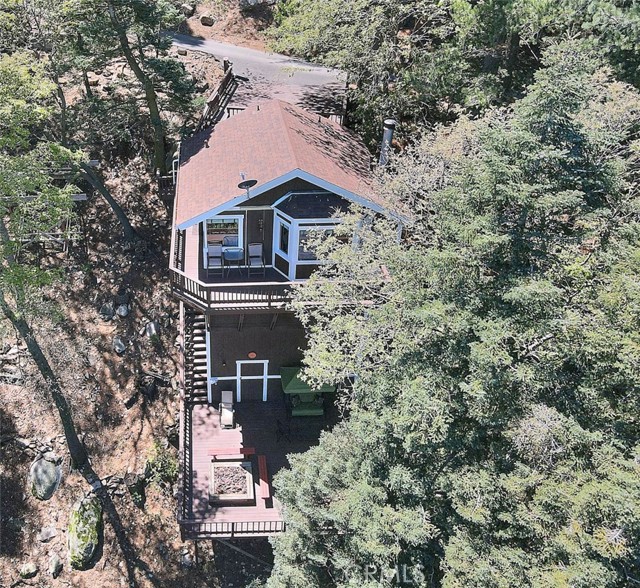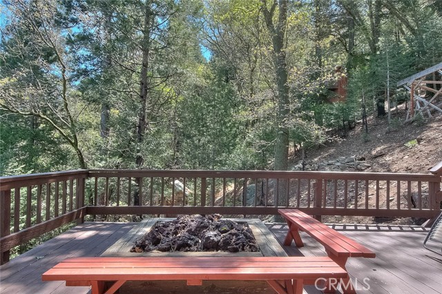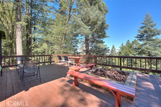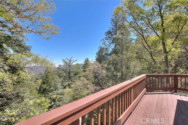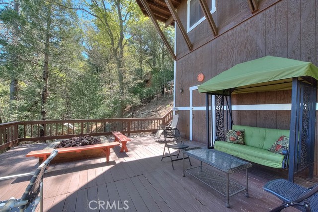 Model perfect home is being sold fully furnished, just pack some clothes and start living your mountain dreams! Fabulous remote feeling 2 story getaway just 20 minutes from San Bernardino and 5 minutes from Lake Gregory. Stunning tree house views from 2 expansive decks give you tons of usable outdoor space with minimal upkeep. New roof, newer paint, reinforced 2 car parking deck, cozy stone fireplace, central heat and air and an additional split system upstairs to keep comfortable. Beautiful decor and upgraded appliances including washer, dryer and stainless steel 5 burner stove, dishwasher, fridge, microwave and garbage disposal. There is a winch system to the huge bottom deck, making it a breeze to entertain or just enjoy the fire pit, wrought iron swing and fabulous forest views.