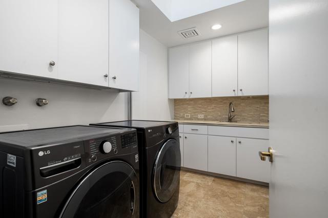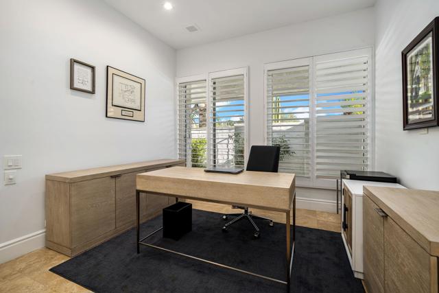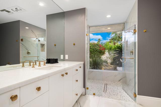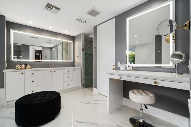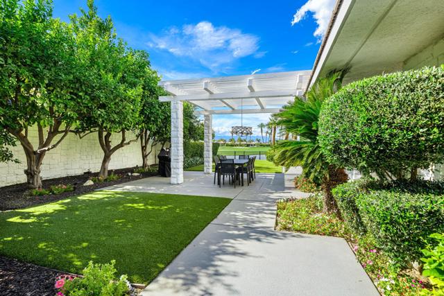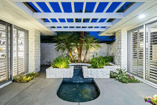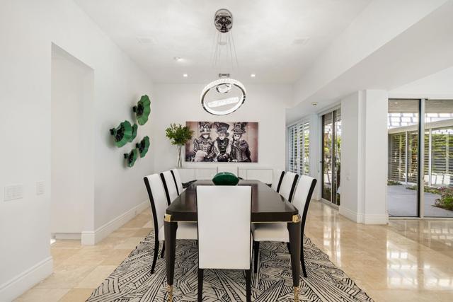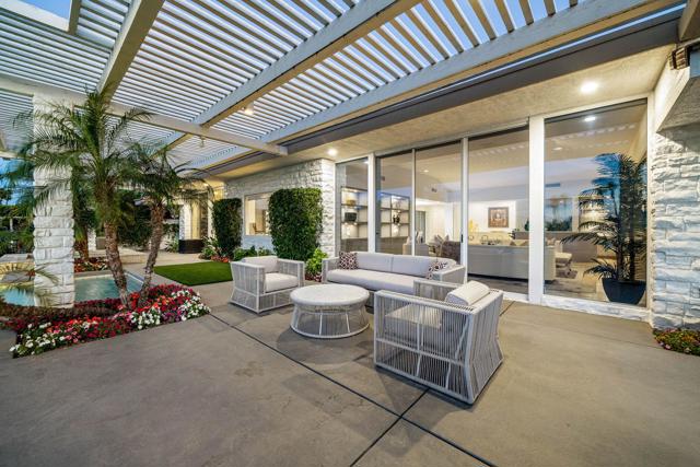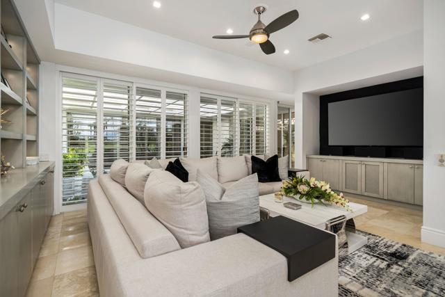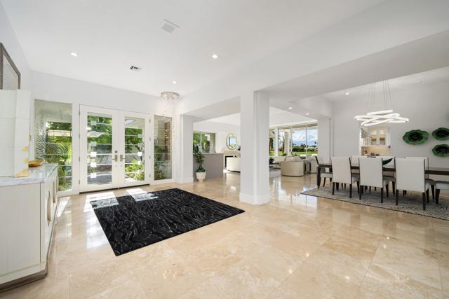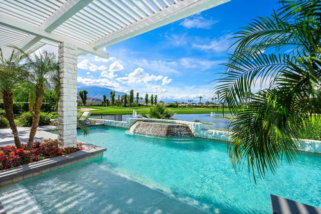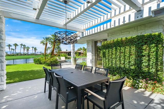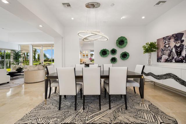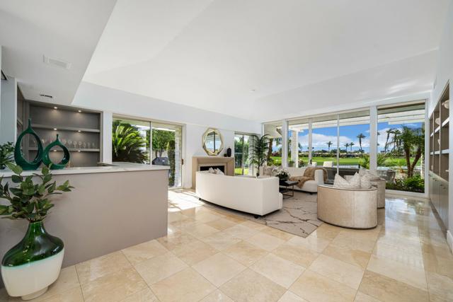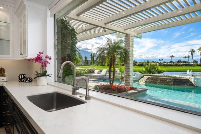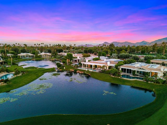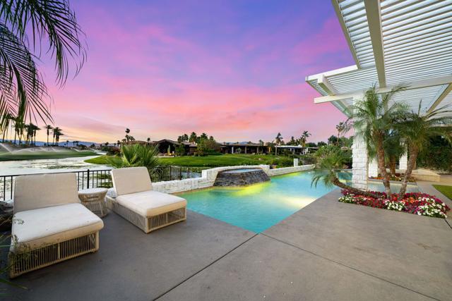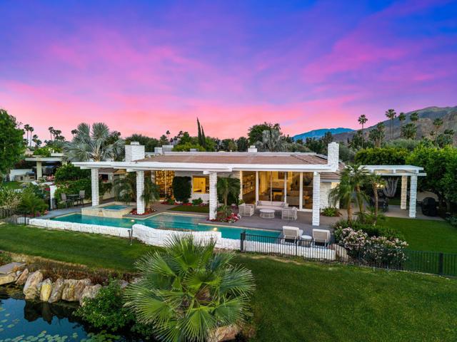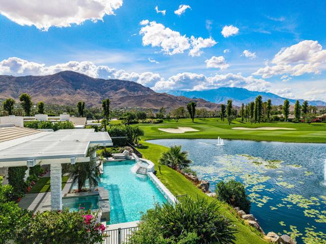Refined desert living in Morningside Country Club. This beautifully updated contemporary home in Rancho Mirage spans approximately 4,929 sqft with 3 bedrooms, 4.5 bathrooms, and a two-car plus golf cart garage, capturing sweeping lake, fairway, and mountain views in one of the desert's most sought-after Central Valley locations. A striking double glass door entry opens to expansive living spaces with soaring ceilings, travertine flooring, and thoughtfully designed lighting throughout. The chef's kitchen has been tastefully refreshed with painted cabinetry, updated hardware, white quartzite countertops, stainless steel appliances, an extra drawer dishwasher, and a raised ceiling detail. An oversized picture window above the sink creates a dramatic focal point, inviting the outdoors in with expansive views that stretch for miles. A standout feature is the fully functional chill room--an exceptional and rare amenity that keeps the pantry space cooled, offering added convenience for food storage and ideal for part-time residents or those who love to entertain. Adjacent living and dining areas flow seamlessly to the outdoors, creating an effortless indoor-outdoor lifestyle framed by sensational mountain views, lush fairways, and an abundance of palm trees. The primary suite is a true retreat, recently reimagined with large-format porcelain tile flooring with inset carpet detail, refined finishes including wallpaper, and two spa-inspired bathrooms, complemented by dual walk-in closets with custom luxury built-ins. The bedroom itself offers a private sitting area with fireplace, creating a comfortable and inviting space to relax. Two generous guest suites offer comfort and flexibility for family or visitors, including one with its own living area that also serves beautifully as a private office or workspace. Extensive recent improvements enhance both the interior and exterior, including full interior repainting, updated lighting, custom bar addition, updated appliances, and refreshed carpeting in guest rooms. Outside, the grounds have been professionally redesigned with enhanced landscaping, artificial turf, upgraded LED lighting, and refreshed hardscape. The pool and spa have been improved with updated equipment and thoughtful PebbleTec refinements, and feature a sun shelf ideal for lounging, creating a private resort-style setting perfect for relaxation or entertaining, complete with exterior misters...
