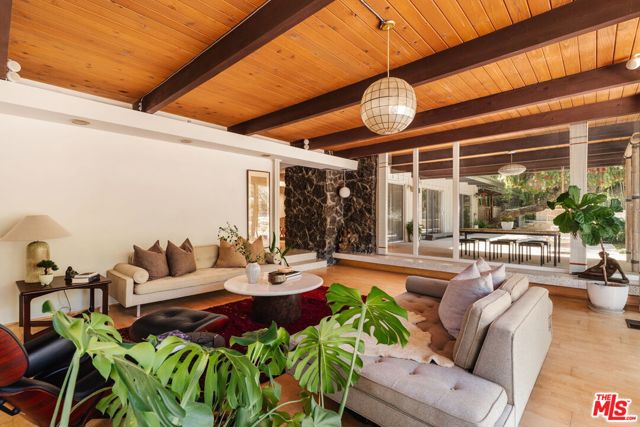 A striking mid-century modern retreat in the coveted Royal Woods neighborhood of Sherman Oaks, this thoughtfully preserved residence embodies timeless California living. Originally designed in 1959 by a protege of Lloyd Wright, the home seamlessly blends architectural pedigree with relaxed, livable elegance. Set behind a private driveway and surrounded by serene canyon views, this property offers a true sense of retreat. Walls of glass define the home, creating a seamless indoor outdoor connection while filling the interiors with natural light. The expansive living room is both dramatic and inviting, featuring warm materials, clean lines, a fireplace, custom built-ins, and direct access to a covered patio. It is equally suited for intimate evenings and effortless entertaining. The chef's kitchen is as functional as it is refined, appointed with Sub-Zero refrigeration, dual ovens, Caesarstone countertops, and generous prep space. It flows effortlessly into a spacious dining area designed to accommodate gatherings with ease. Five well-appointed bedrooms offer comfort and flexibility, each thoughtfully designed with a sense of privacy and understated sophistication. The primary suite serves as a tranquil sanctuary, with glass doors that open directly to the outdoors, enhancing the home's connection to its natural surroundings. A converted garage has been reimagined as a versatile family and game room (door system is in place to be converted back if desired) while a detached, air-conditioned structure offers flexibility as a gym, studio, or private office. The grounds are nothing short of exceptional, forming an immersive outdoor sanctuary anchored by a serene Japanese zen rock garden designed by renowned landscape artist Lew Watanabe. Meandering pathways and curated plantings, including mature ginkgo trees, Japanese cherry and maple, bamboo groves, and sculptural black pine, create a rich, tranquil environment. A sparkling pool and spa, fire pit, covered patio, and fully equipped outdoor dining and BBQ area complete the resort-like setting. With its architectural significance, refined interiors, and extraordinary outdoor spaces, this one-of-a-kind residence offers an elevated yet effortless lifestyle. Ideally located near the Valley's premier dining and shopping destinations, with convenient access to the Westside, this is a rare offering that truly stands apart.