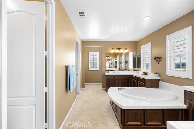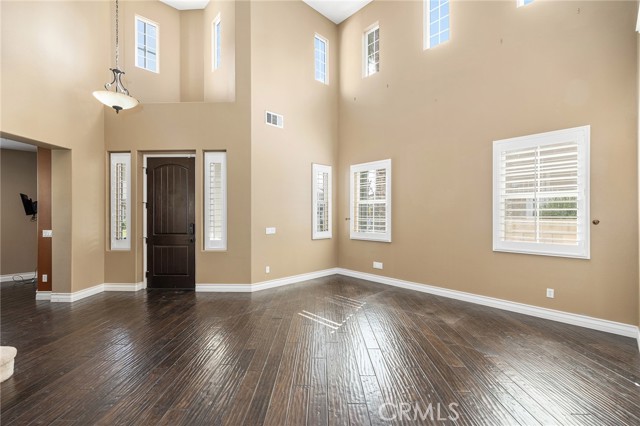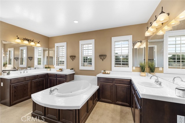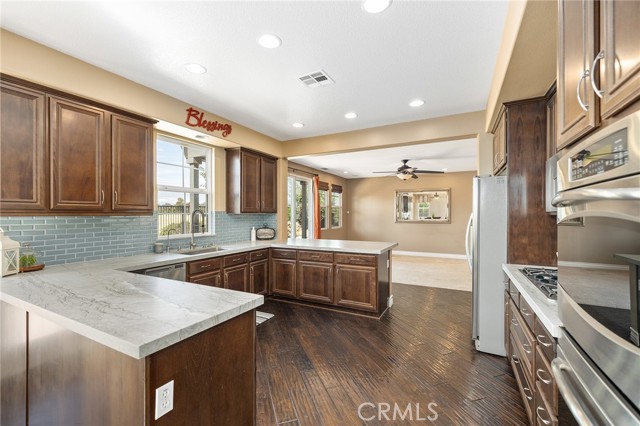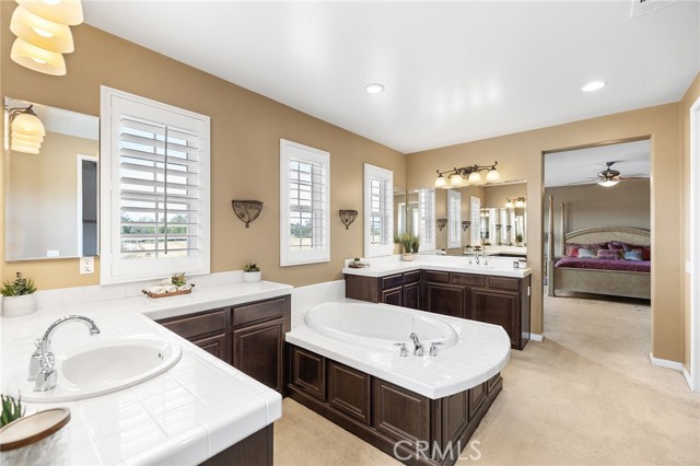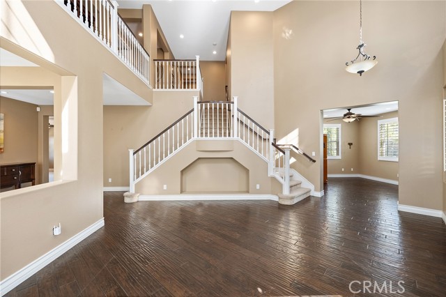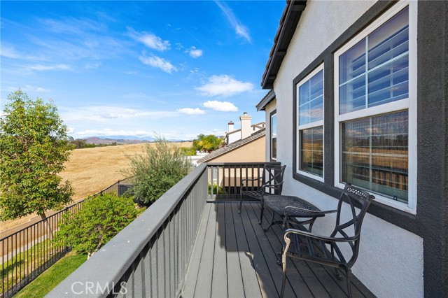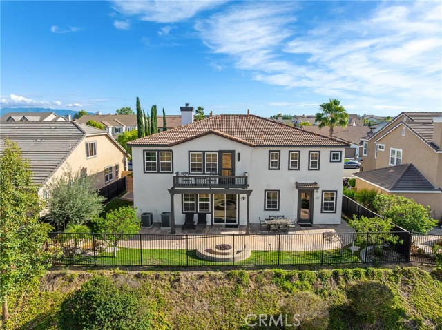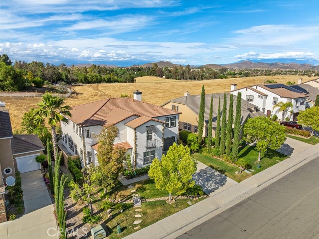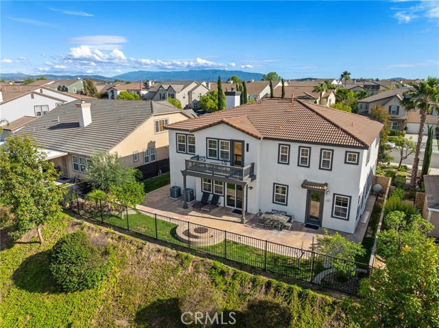 Stunning, highly upgraded home with gorgeous mountain views and open space behind you! Step inside to discover a thoughtfully designed layout centered around the heart of the home—the massive kitchen, showcasing breathtaking views right from the kitchen sink window. The kitchen is beautifully appointed with custom quartz countertops, a custom backsplash, and upgraded stainless steel appliances, including a double oven, 5-burner cooktop, dishwasher, microwave, and refrigerator. Enjoy a spacious secondary dining area that comfortably fits a large table, along with two eat-at bar areas—one at each end of the kitchen—and an abundance of countertop and cabinet space. The kitchen opens seamlessly to the inviting family room, complete with stunning mountain views and a cozy fireplace. The formal living room features soaring ceilings, abundant natural light, and beautiful wood flooring, flowing effortlessly into the elegant formal dining room—perfectly designed for both everyday living and entertaining. Off the formal living room, you’ll find a spacious office/den or possible 5th bedroom with a practical walk-in closet—ideal for storage and flexible living. Gorgeous plantation shutters elevate the homes curb appeal. The expansive primary suite offers incredible views of mountains and open space, along with a private balcony to take it all in. The oversized primary bathroom features a large step-in shower, an elegant jacuzzi soaking tub, dual vanity areas, an abundance of countertop space and two huge walk-in closets. There is a generously sized secondary suite including a private full bathroom,spacious walk-in closet—perfect for guests or multigenerational living. There are 2 additional bedrooms that share a hall bathroom with dual sinks and tub/shower combo. The upstairs laundry room adds convenience with built-in cabinets and utility sink. Step outside to your backyard retreat, where you’ll enjoy incredible views, a covered patio, tranquil waterfall pond, green grass, fruit trees, and a gas fire pit with custom concrete seating—perfect for relaxing or entertaining. Exceptional curb appeal with lush, mature landscaping with lighting, a covered front porch, and modern exterior light fixtures that enhance its beauty day and night. Don’t let the 2-car garage door fool you—this home includes a highly desirable 3-car tandem garage, offering plenty of extra space for storage, toys, or even a workshop setup. The extra-long driveway provides ample additional parking.