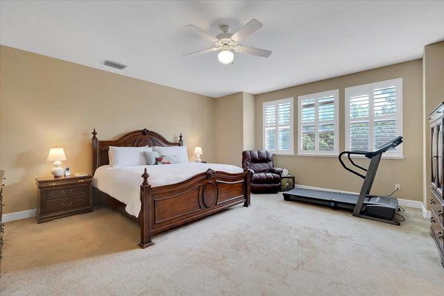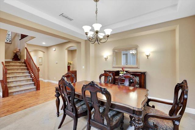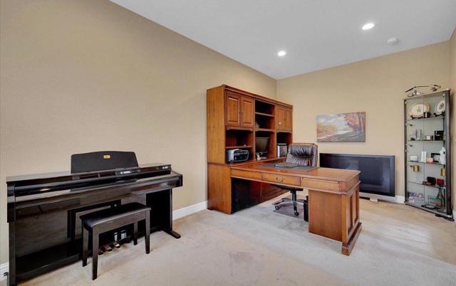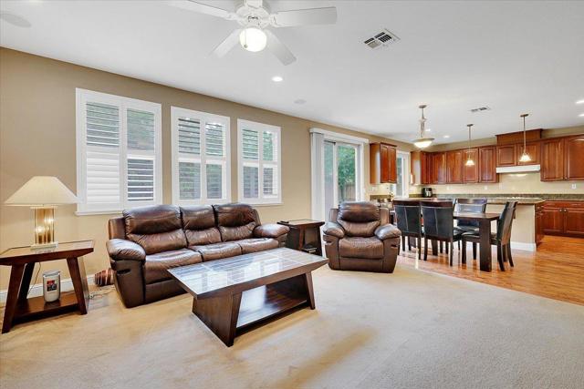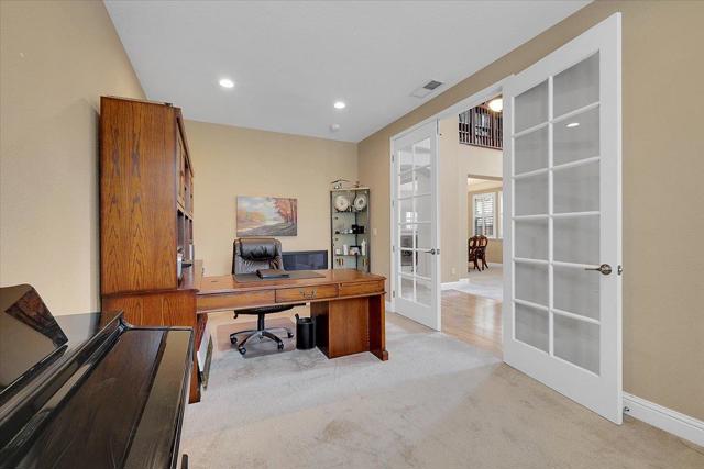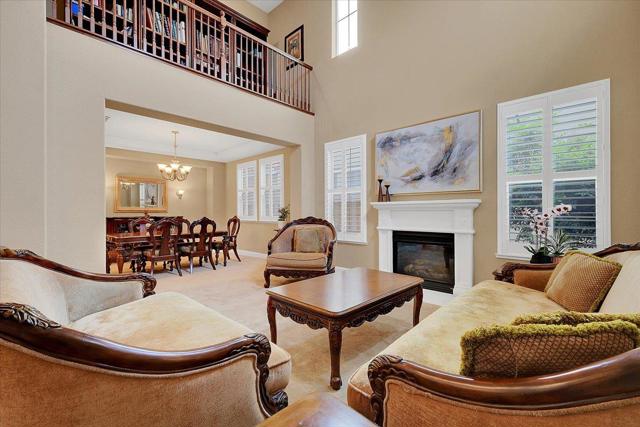 Beautiful former model home with extensive upgrades throughout. Features include a spacious floor plan with high ceilings and abundant natural light. Gourmet kitchen with premium cabinetry and granite countertop. Formal living and dining rooms with fireplace. Large family room with custom built-ins and additional fireplace. Main level includes a guest bedroom and full bathroom, plus a bright, spacious office. Informal dining area overlooks the backyard with fruit trees. Upstairs features a large loft area ideal for entertainment and potential for a pool table or game room. Custom cabinets in upstairs hall. Expansive primary suite includes an en-suite bathroom with an enclosed shower, soaking jet-tub, and two walk-in closets. Four spacious & bright bedrooms, and a full bathroom with dual sink. Well cared for yard with mature fruit trees. Attached 2-car garage with finished interior and storage cabinets. Located in a desirable neighborhood and tree lined streets, close to park, local amenities and many popular shopping centers.